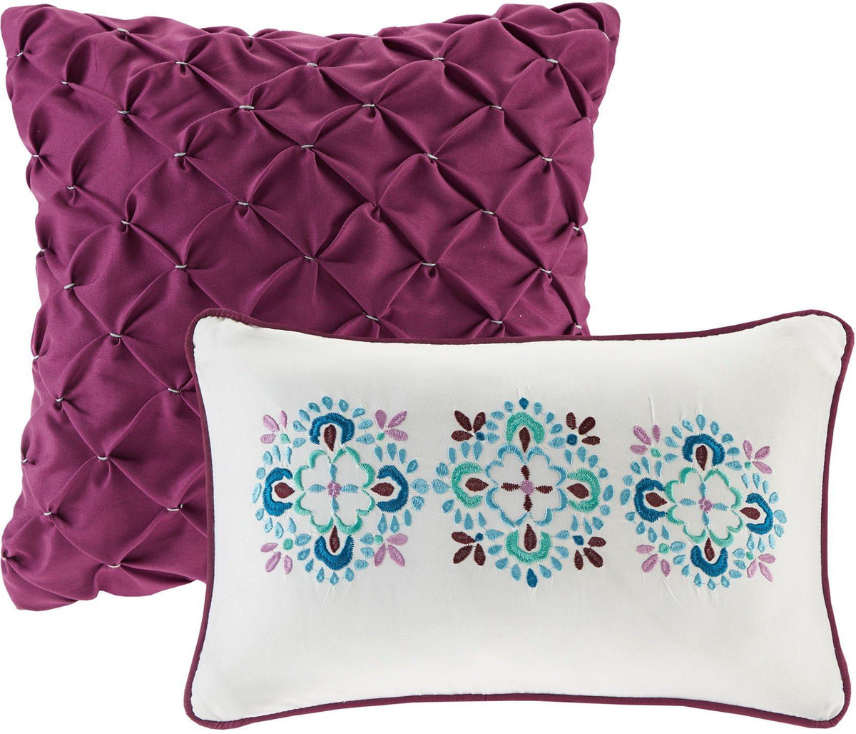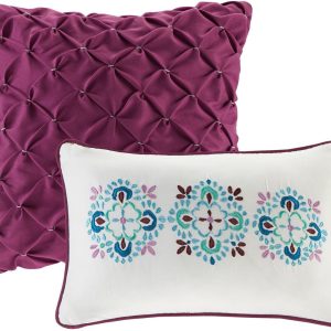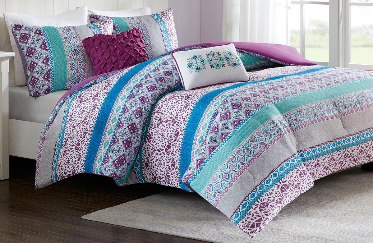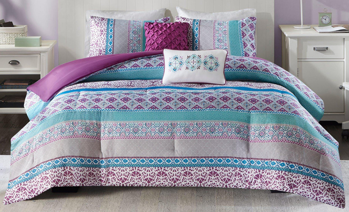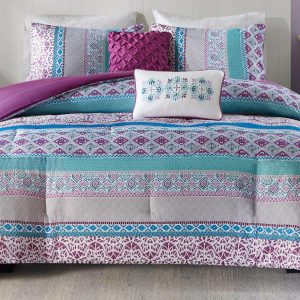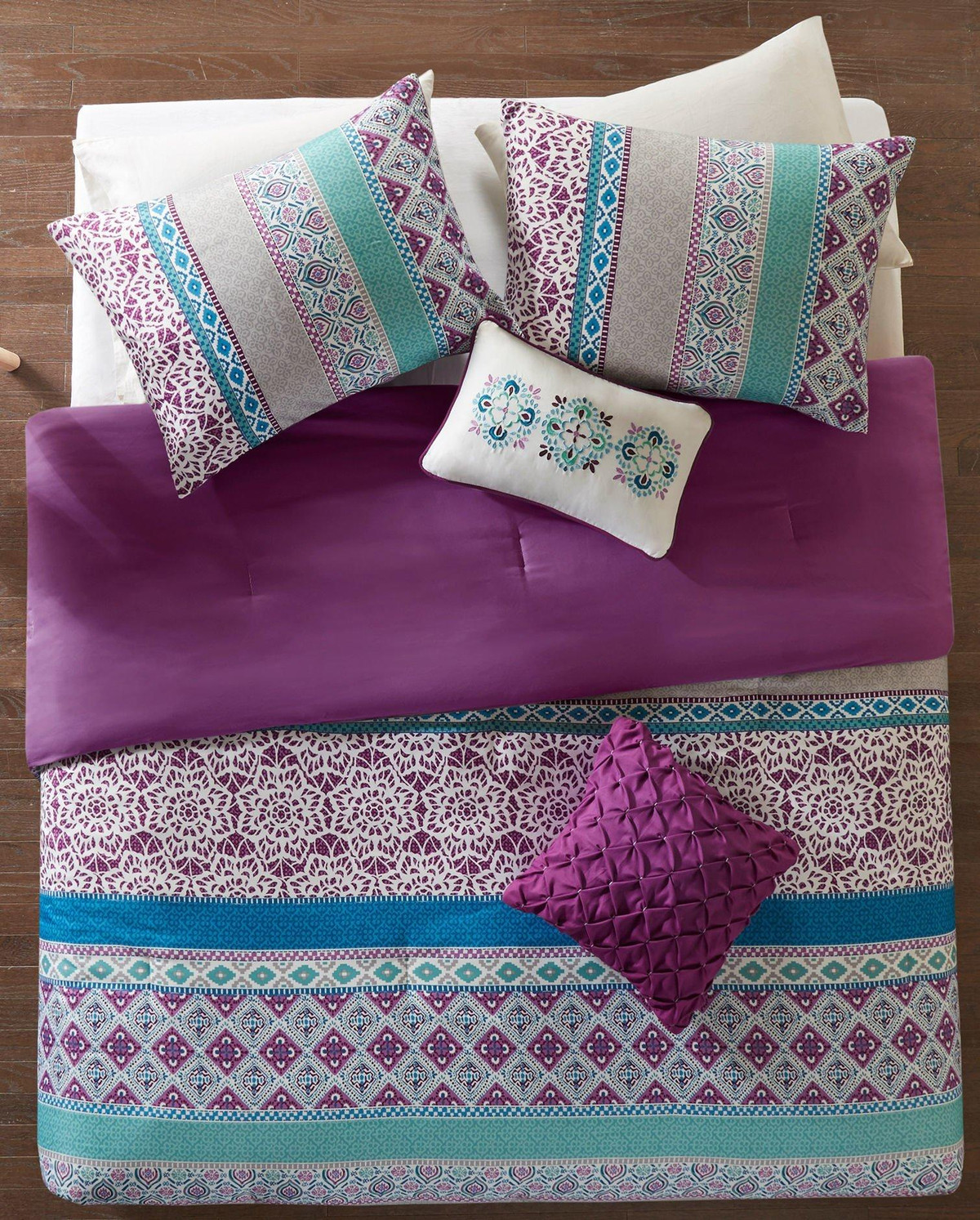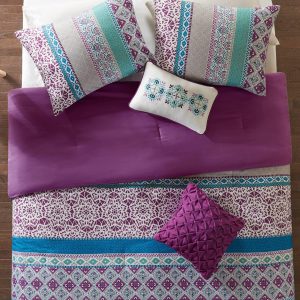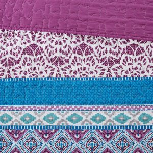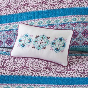 The Intelligent Design Joni Coverlet Set features gorgeous hues of purple, blue, turquoise, and grey with a global inspired pattern. Set includes a coverlet, two shams (one twin) and two decorative pillows measuring 12” x 16” and 16” x 16”.