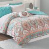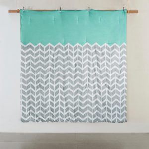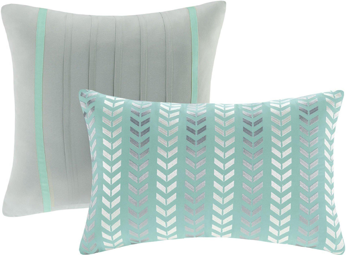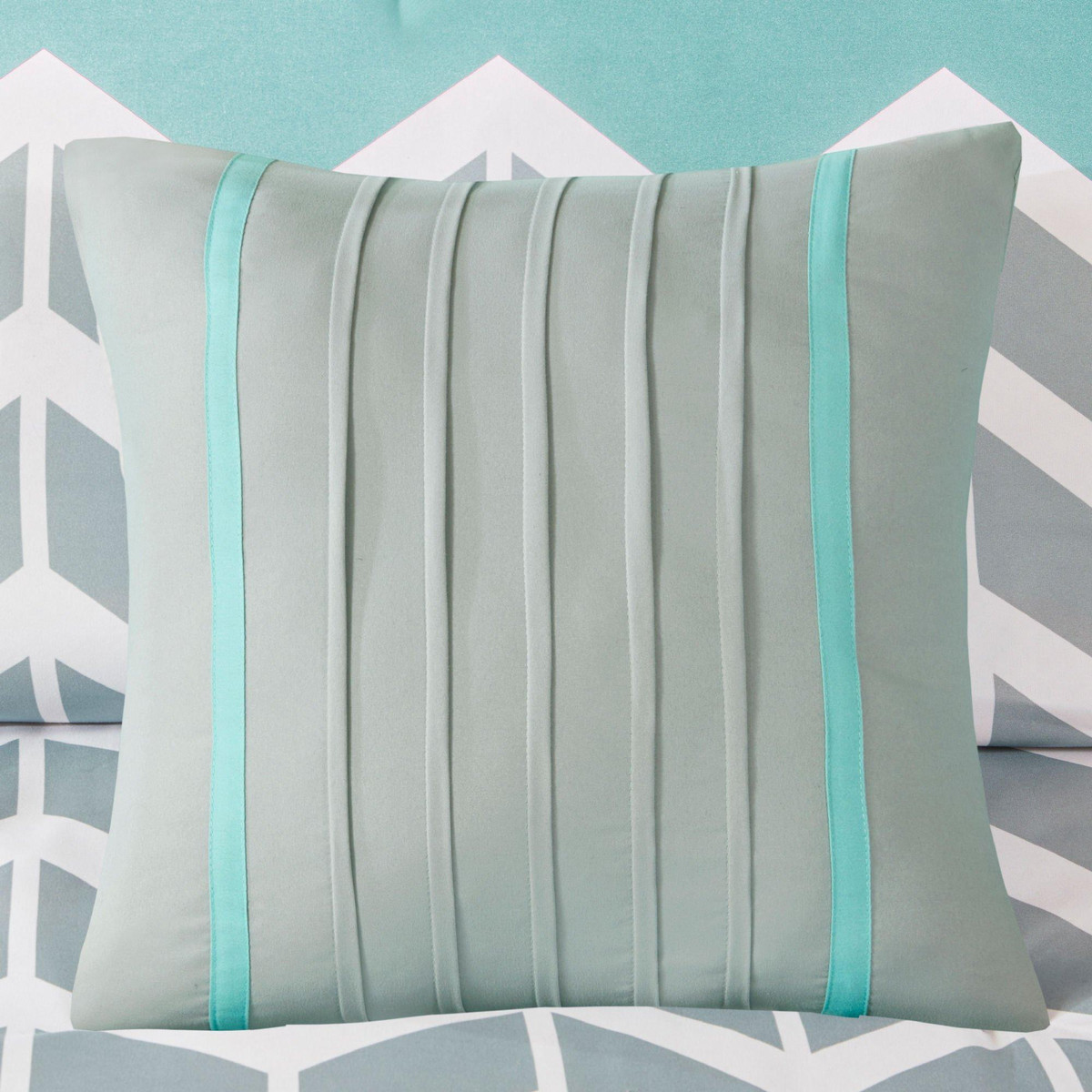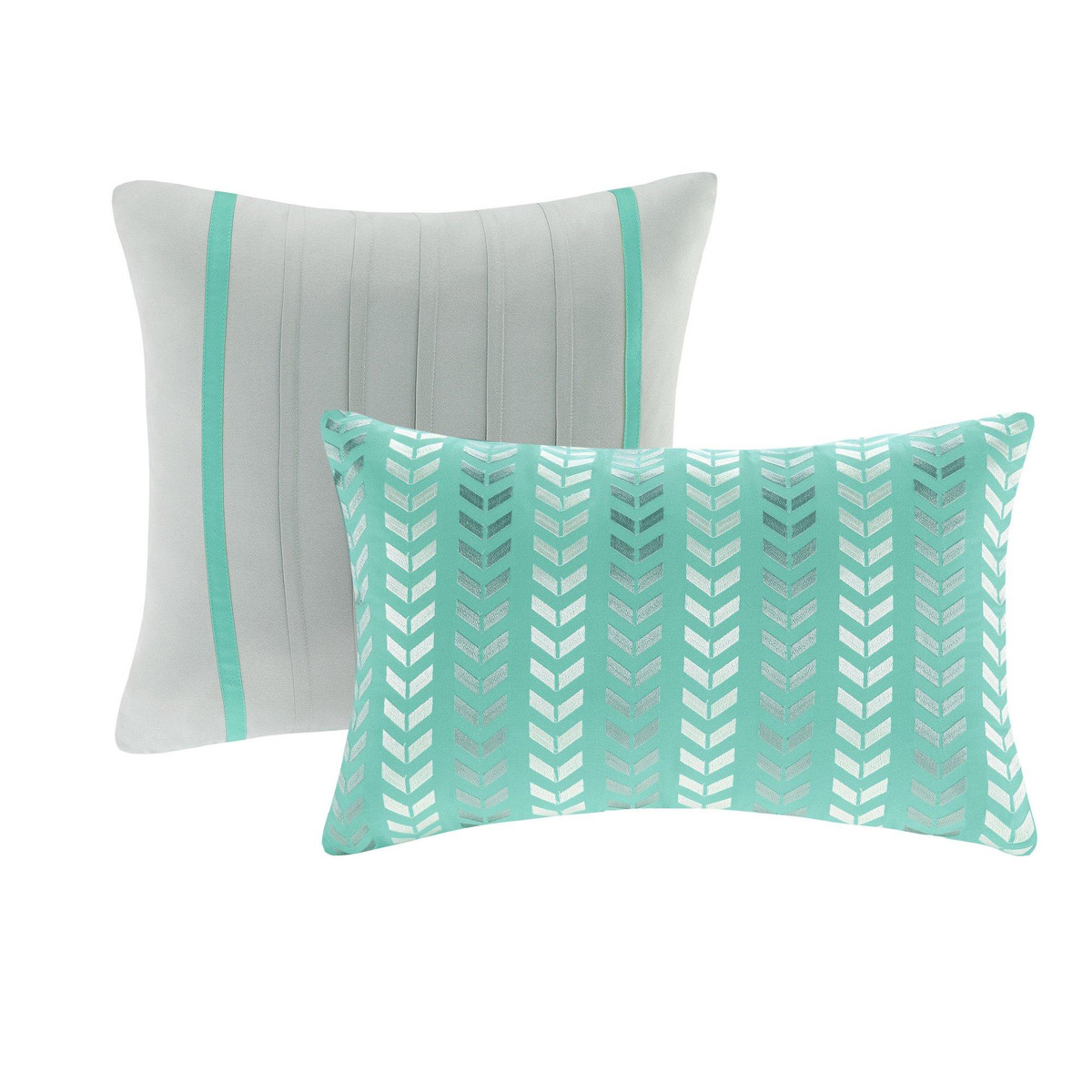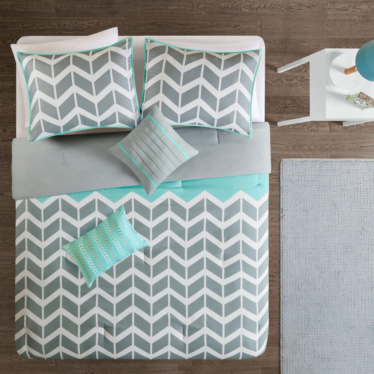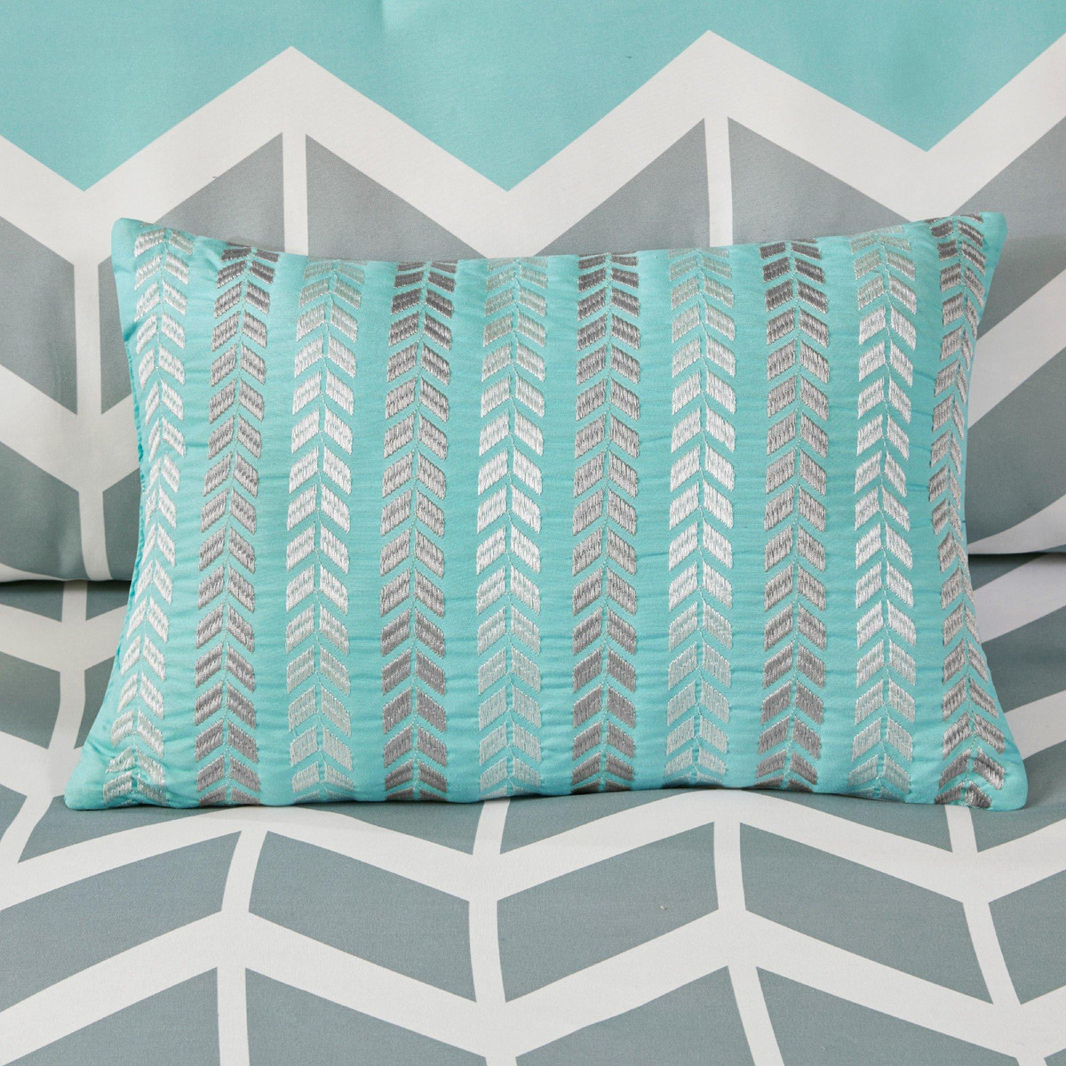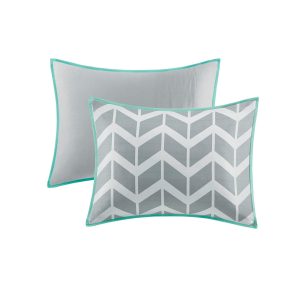 This Intelligent Design Nadia Comforter Set features a teal and gray chevron print, with a solid teal reverse. Set includes one comforter, two shams (one for twin size), and two coordinating embroidered decorative pillows. Pillows measure 12”L x 18”W and 16”L x 16”W.