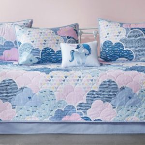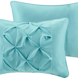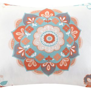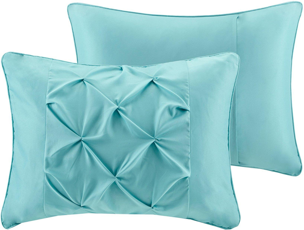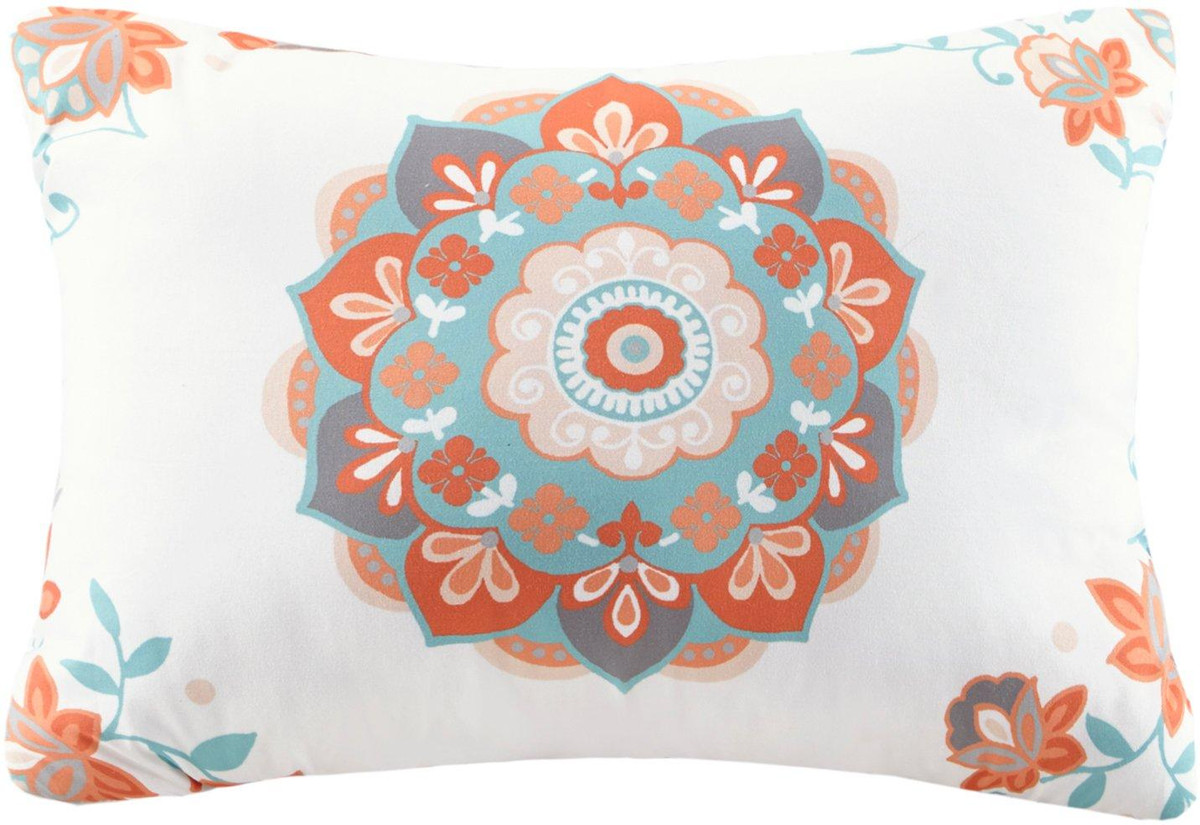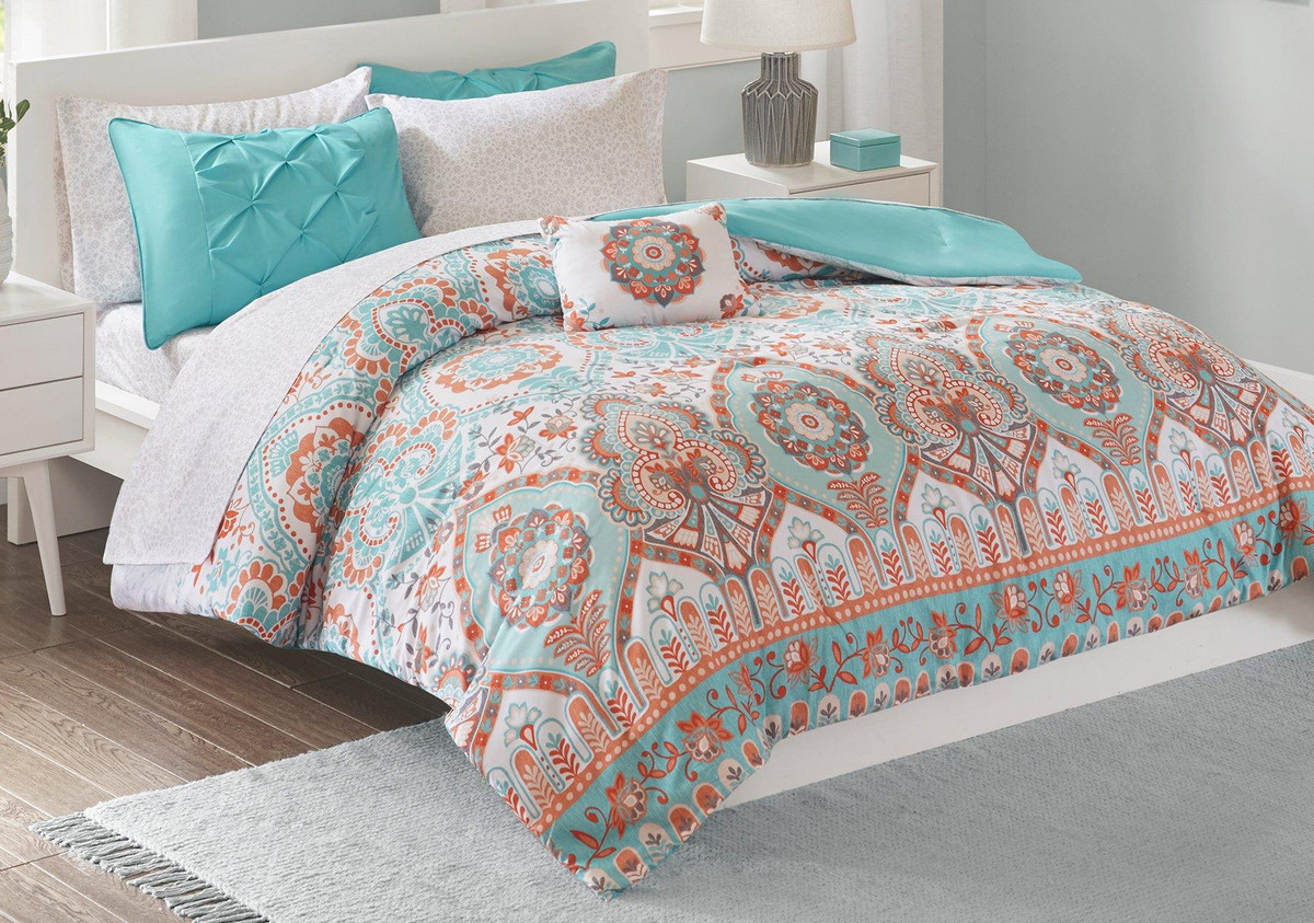 Vinnie Comforter features a vibrant globally inspired pattern in aqua and orange hues. Comforter reverses to a solid aqua. Matching aqua sham(s) with pin tucked details add texture and dimension, while a coordinating decorative pillow provides the finishing touch. Set includes decorative pillow, comforter, flat sheet, fitted sheet, two pillow cases (one twin) and two shams (one twin). Pillow measures 12”L x 16”W.