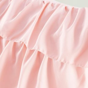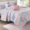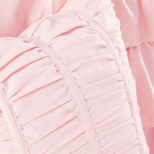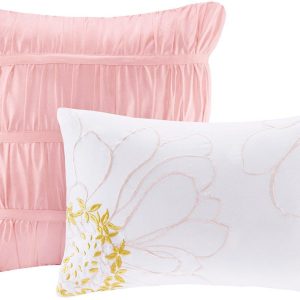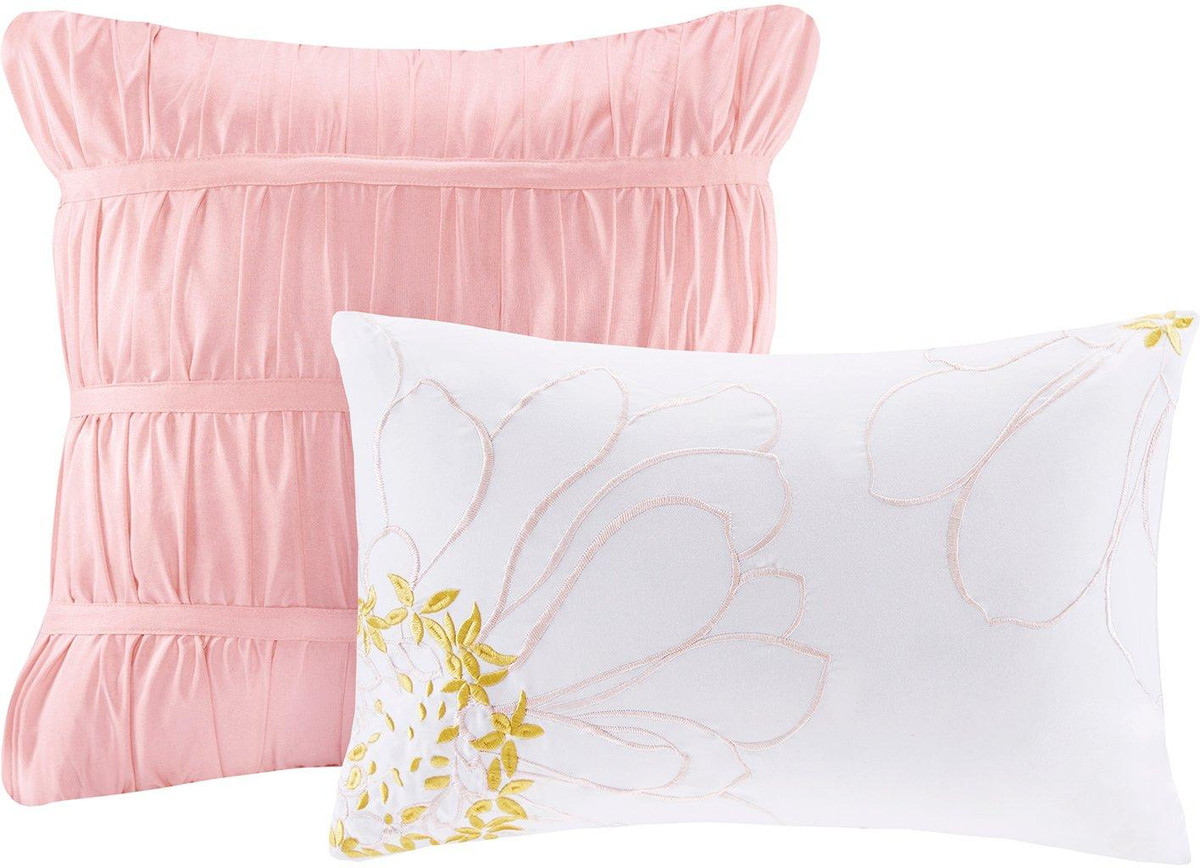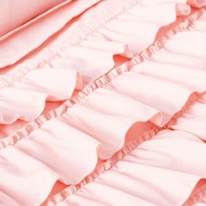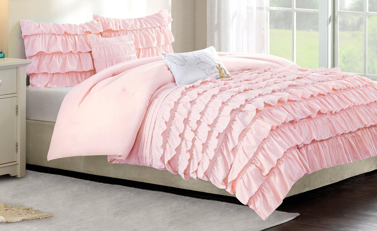 Intelligent Design Waterfall Comforter Set features beautiful flowing ruffles in a soft blush color. A solid blush covers the reverse for clean look. Set includes one comforter, two shams (one for twin size), and two decorative pillows. Pillows measure 12”L x 16”W and 16”L x 16”W.