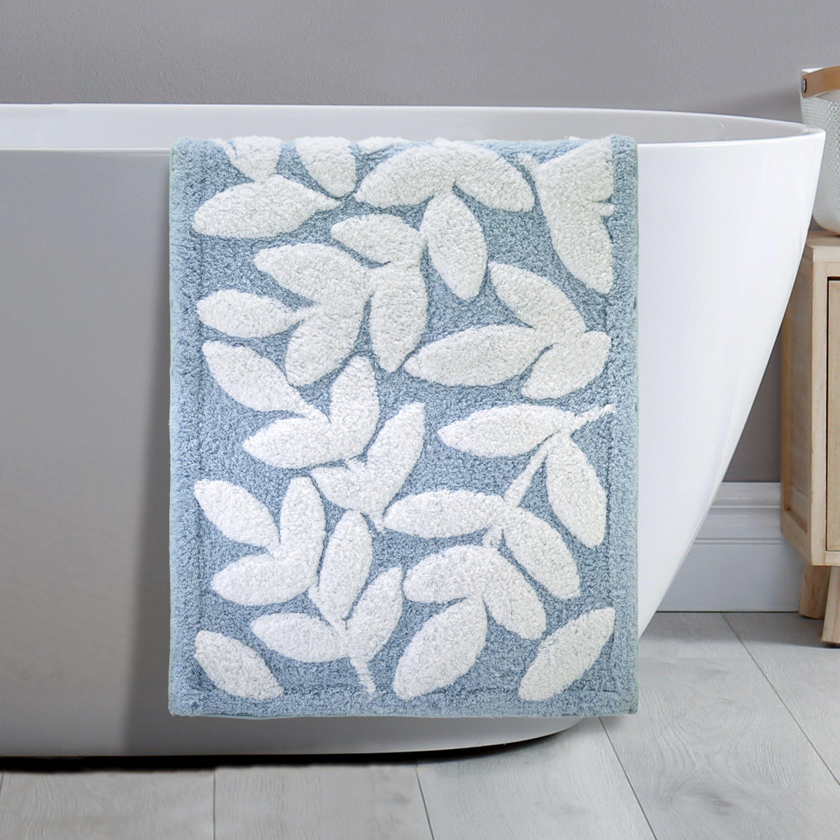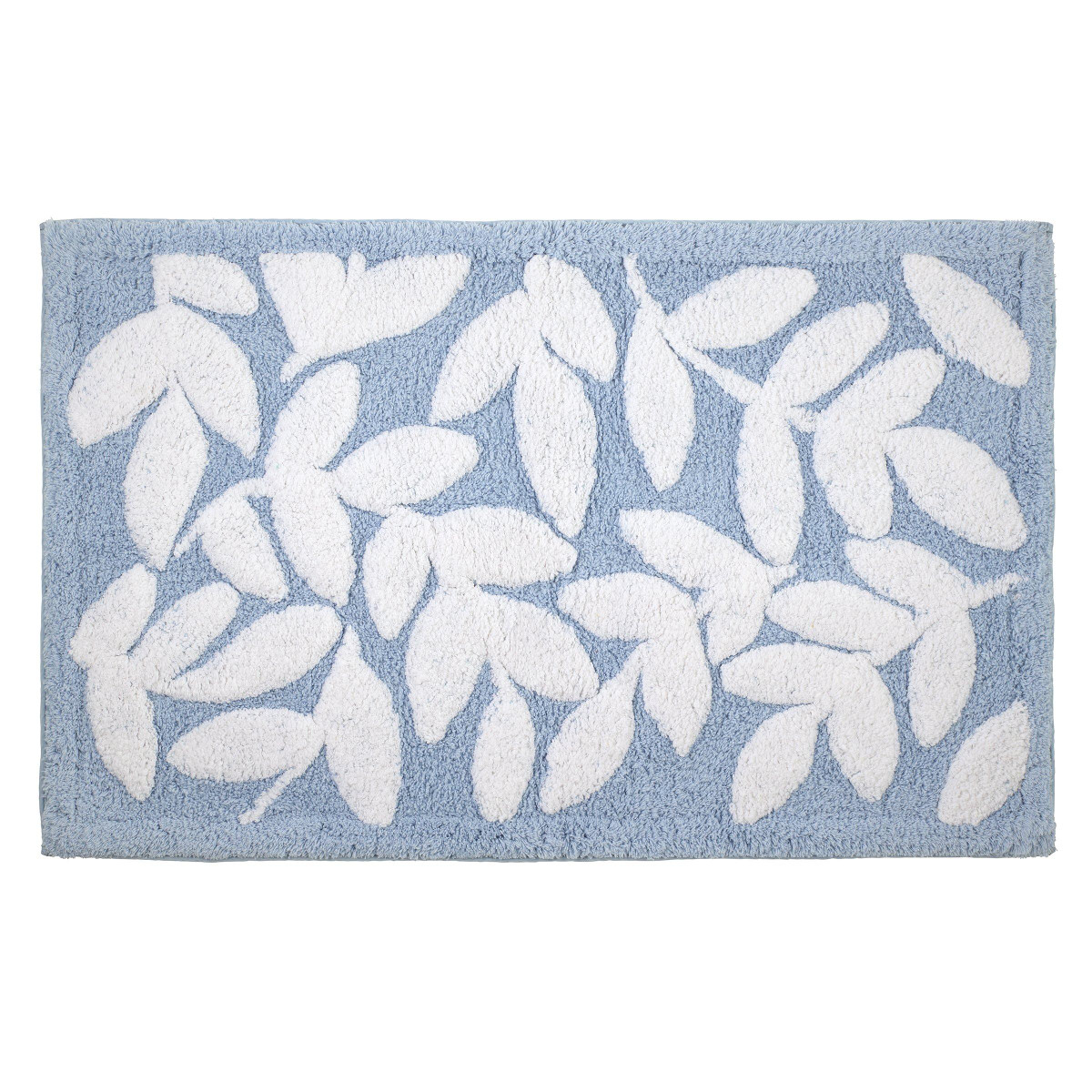 The Kingsley Decorative Bathroom Rug features an allover white leaf and vine pattern on a sky blue ground. The design is finished with a matching solid border on all 4 sides, 20 x 32 inches with non-slip latex back. Coordinating shower curtain and towels available.