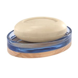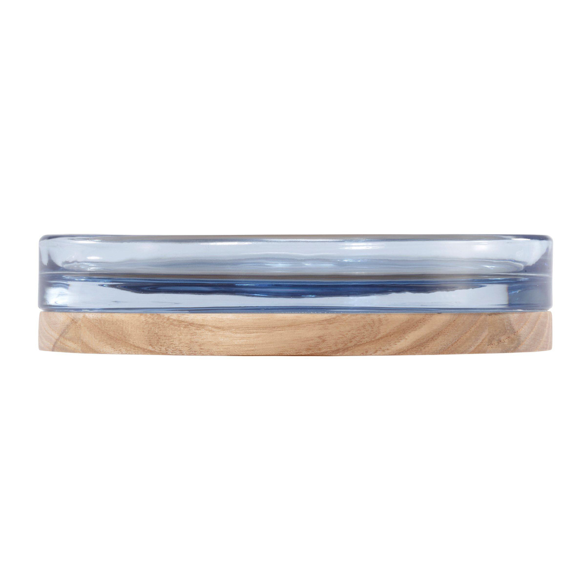 Refresh your bathroom décor with the Izod Cove Blue Glass Decorative Soap Dish. It features a nicely weighted blue glass oval body with a natural color wood base. It adds an updated look to any bathroom, bedroom or office. Measures 5.24 in. x 3.74 in. x 1.38 in. Other matching pieces available.