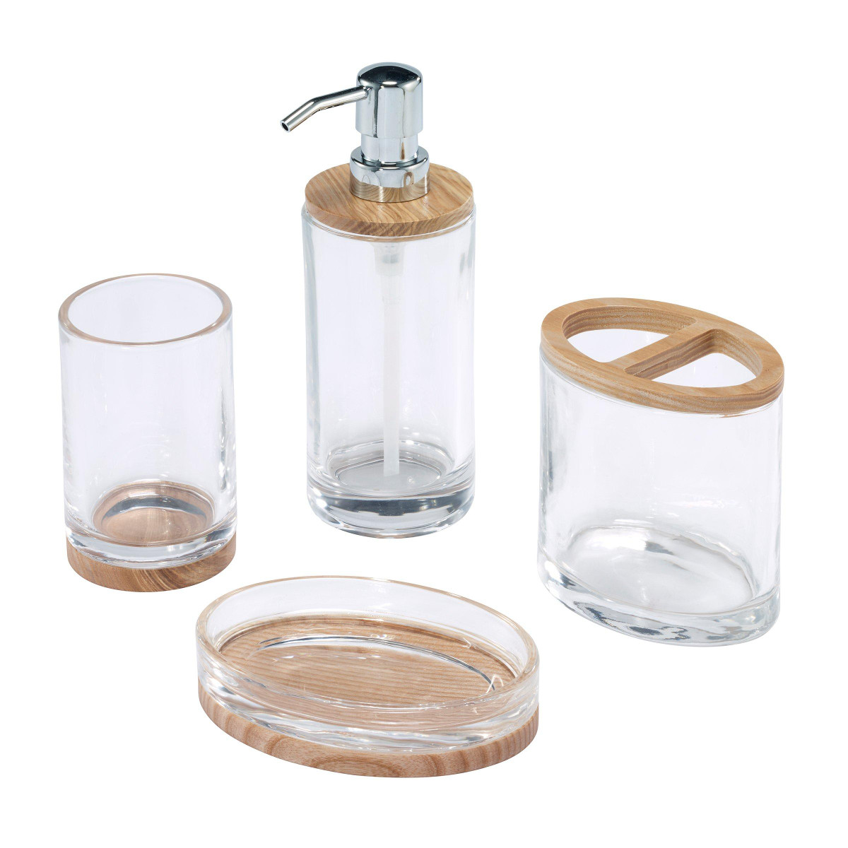 Refresh your bathroom décor with the Izod Cove Clear Glass 4 Pc. Bath Set. It features weighted glass pieces in round and oval shapes, with naturally colored wood tops and bases. The set includes one toothbrush holder (4.25 in. x 2.99 in. x 4.33 in.) one lotion dispenser (2.76 in. x 2.76 in. x 7.80 in.) one soap dish (5.24 in. x 3.74 in. x 1.38 in.) and one tumbler (2.76 in. x 2.76 in. x 4.41 in.). Other matching pieces available.