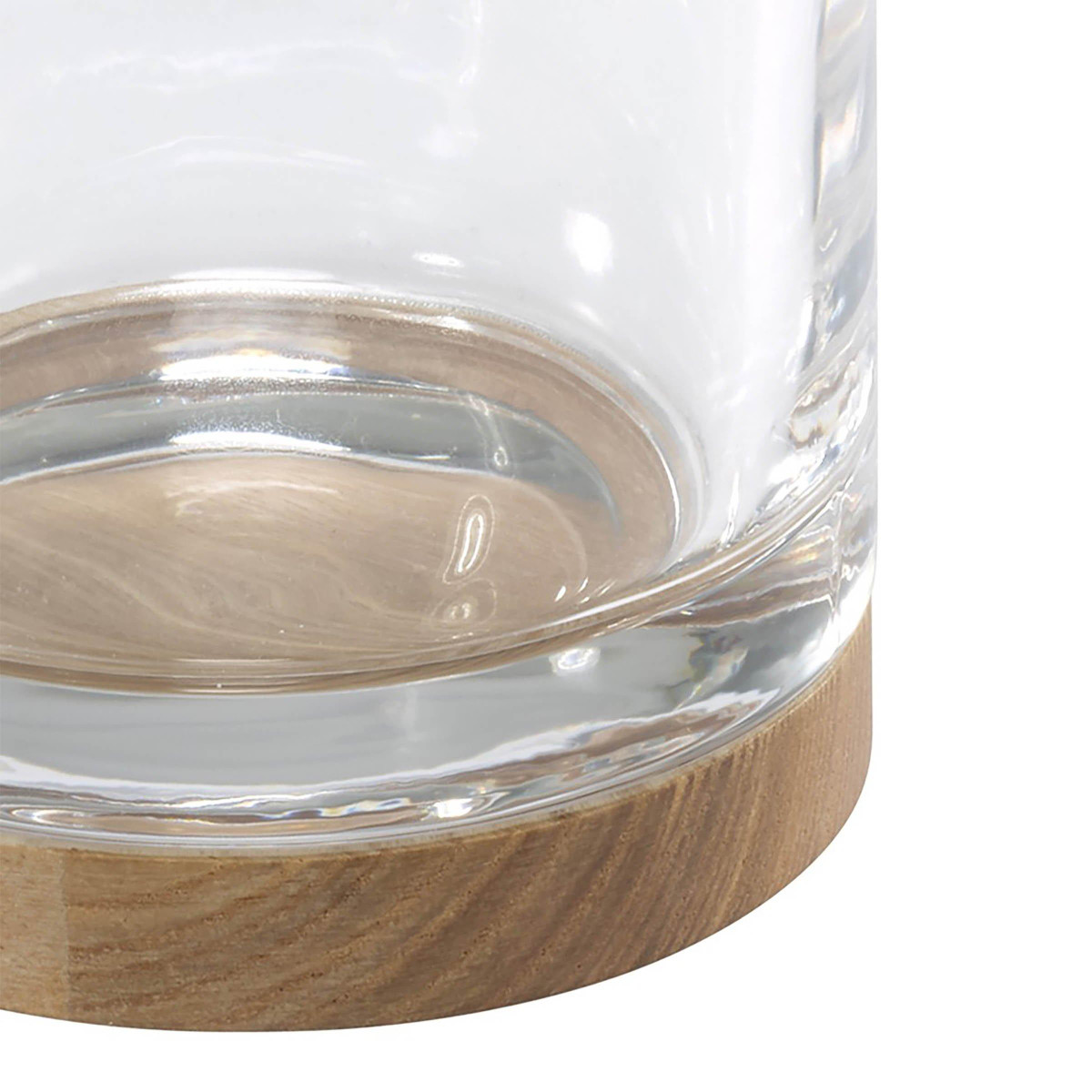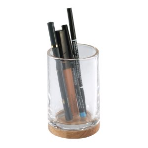 Refresh your bathroom décor with the Izod Cove Clear Glass Decorative Tumbler. It features a nicely weighted clear glass round body with a natural color wood base. It adds an updated look to any bathroom, bedroom or office. Measures 2.76 in. x 2.76 in. x 4.41 in. Other matching pieces available.