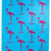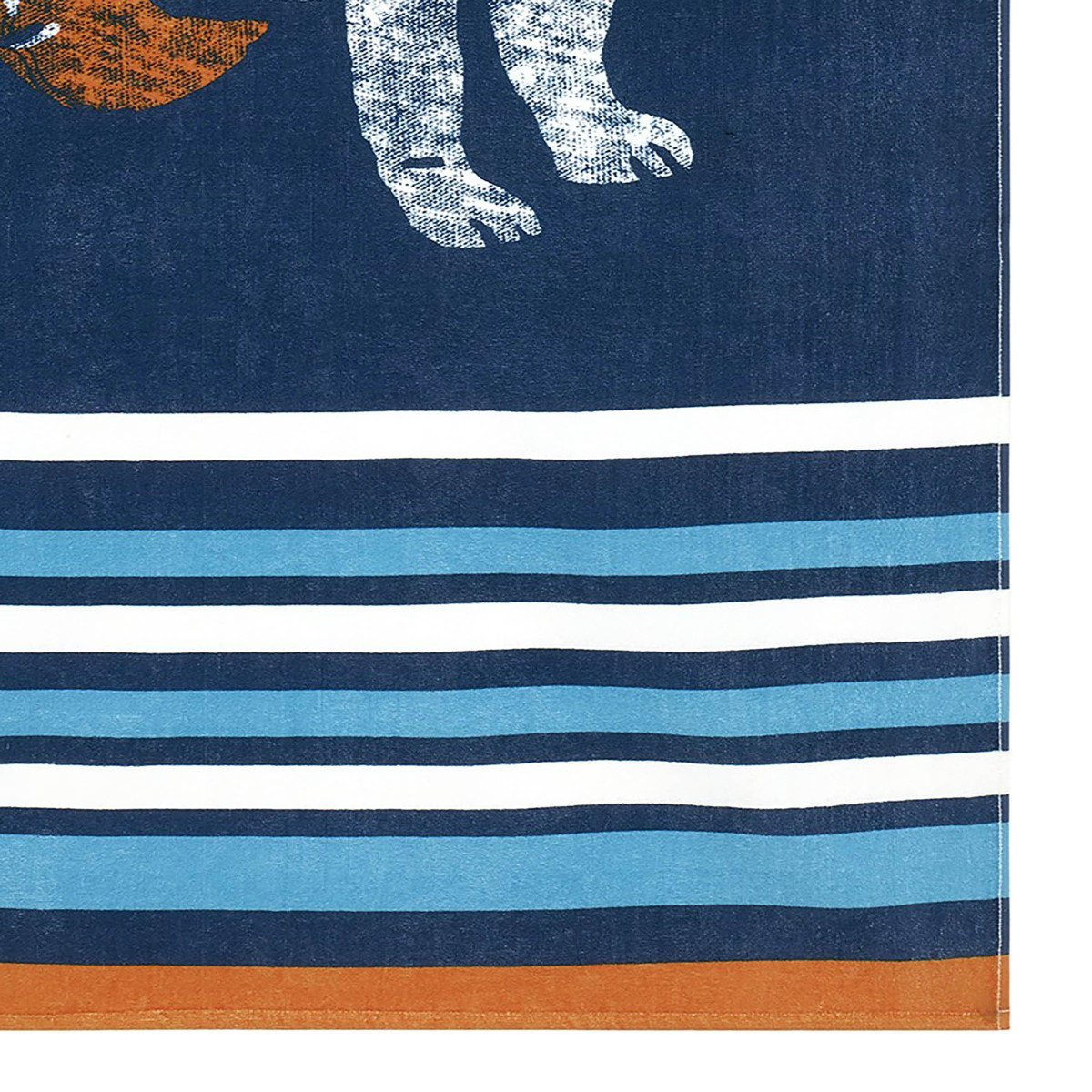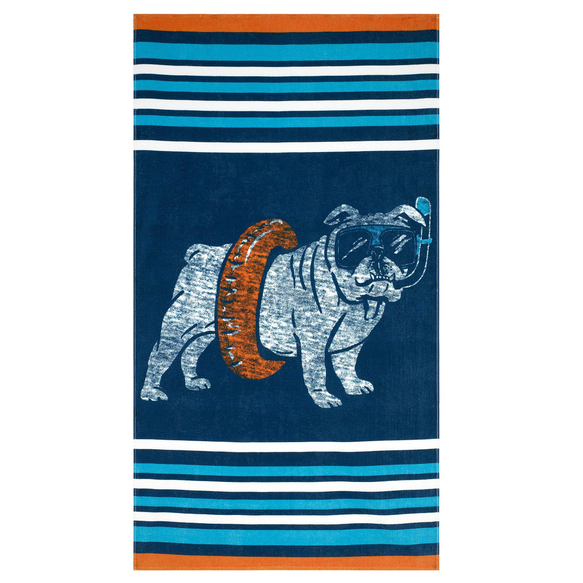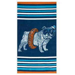 The Izod Snorkel Time Beach Towel features a white bulldog ready for a swim with goggles, a snorkel and an orange floatie. The dog is on a dark blue ground framed with aquamarine, dark blue and white stripes with orange borders. Printed on 100% cotton sheared velour with a terry back. Measures 40 in. x 70 in.