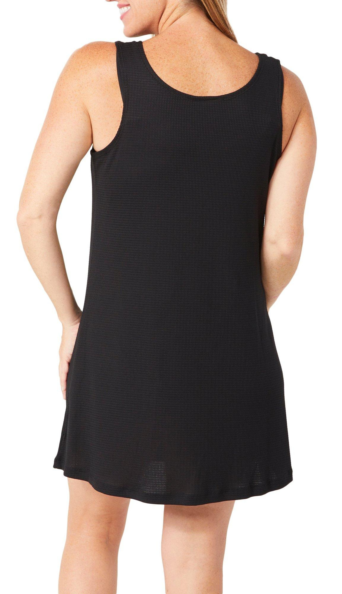 Effortless style meets comfort in this sleeveless tank coverup dress. Designed with chic ring accents and a flattering stretch fit, it layers perfectly over swimwear for poolside lounging or beach strolls. Lightweight fabric keeps you cool while the sleek silhouette adds a touch of modern flair. Ideal for travel, resort wear, or sunny weekends. Fabrication is 95% polyester and 5% spandex.