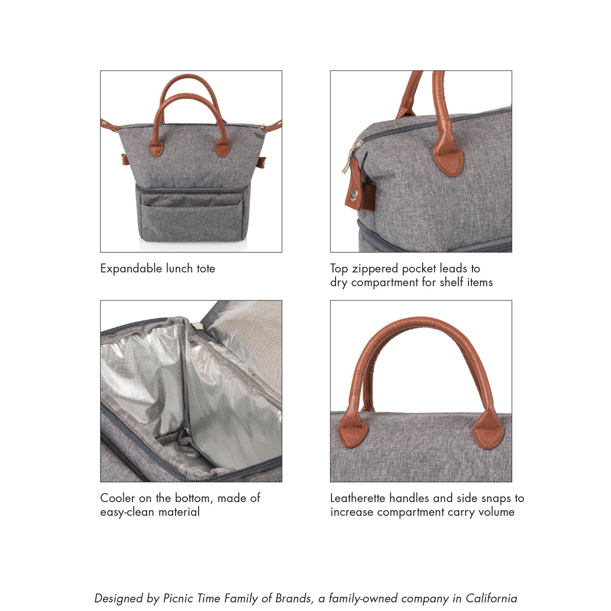 The Lunch Bag Cooler / Lunch Box is a soft cooler ideal for work, school, and small picnics. With an insulated work cooler on the bottom, a dry compartment up top and an additional front storage area to boot, theres plenty of space in this lunch tote. Two tiered lunch tote; Front flat zippered pocket leads to dry compartment for shelf items; Cooler on the bottom, made with wipeable materials; Leatherette handles and side snaps to increase compartment carry volume; 9.75” L x 5.5” W x 10.1” H