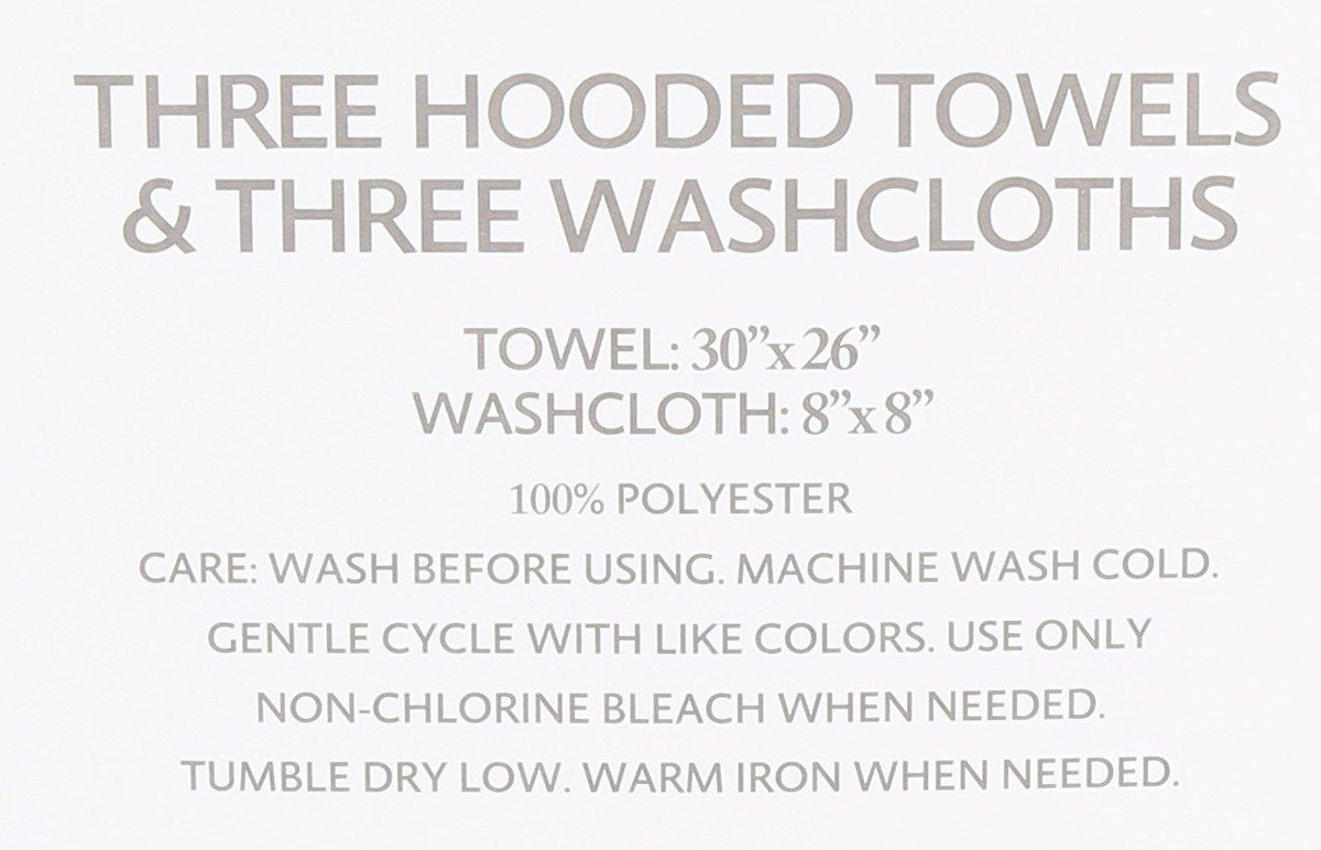 This six-piece baby bath set features three hooded towels on super soft terry fabric and three matching washcloths.