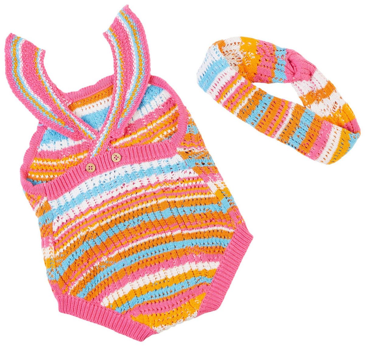 This baby girl 2-piece romper set is made from 100% cotton with delicate crochet detailing for a soft and elegant look. The sleeveless romper features a henley-style front and is paired with a matching headband to complete the outfit. Perfect for warm days, photo shoots, or special occasions, this set blends comfort and charm for your little one.