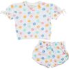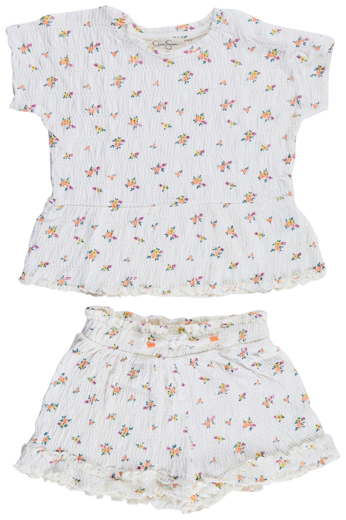 Introducing the Baby Girls 2 Pc Floral Shorts Set, crafted from a blend of cotton, polyester, and spandex for a comfortable and flexible fit. This charming set features a floral print on a short sleeve top and matching shorts with a textured design and delicate lettuce trim. Perfect for everyday wear or special occasions, this outfit combines style and practicality, making it a delightful addition to your little one’s wardrobe.