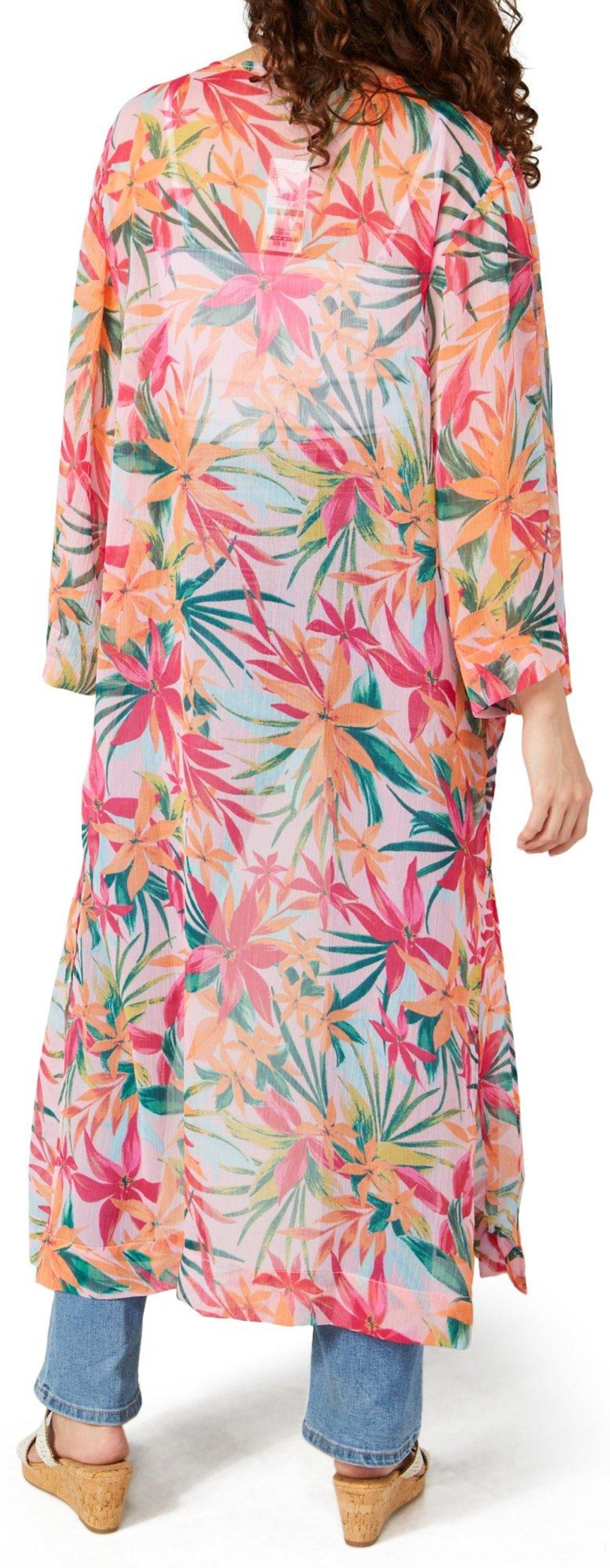 Introducing the Juniors Blakely Kimono, crafted from 100% polyester for a lightweight and comfortable feel. This stylish kimono features a vibrant tropical floral print, 3/4 sleeves, and an open front design, making it a perfect piece for layering. Ideal for adding a touch of elegance to any outfit, this kimono is versatile and easy to wear, offering a chic and breezy look for any occasion.