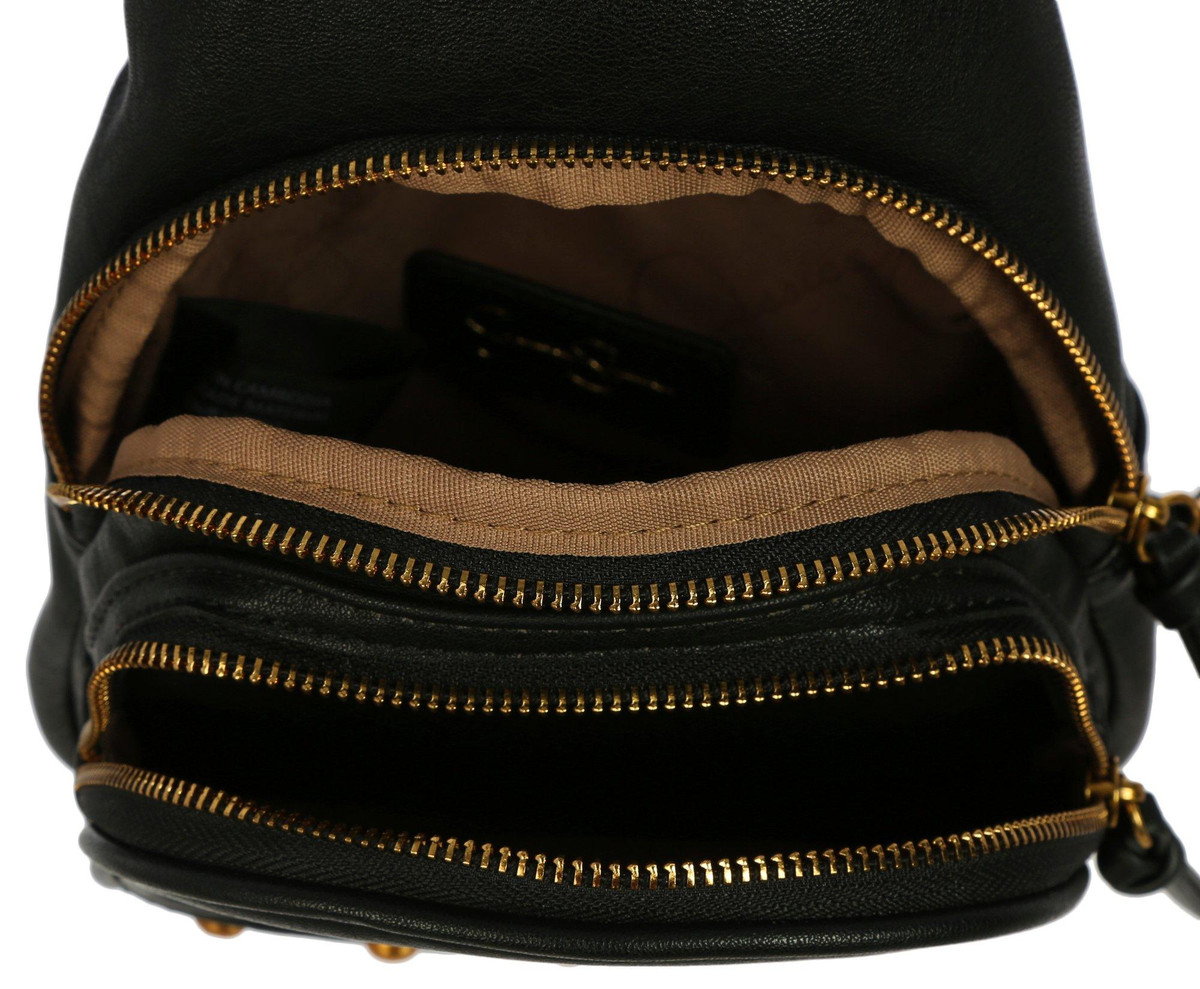 This stylish sling bag features a solid vegan leather exterior, gold tone hardware, a guitar strap style strap, top zip compartment and front zip pocket. Measures 8 x 12 in.