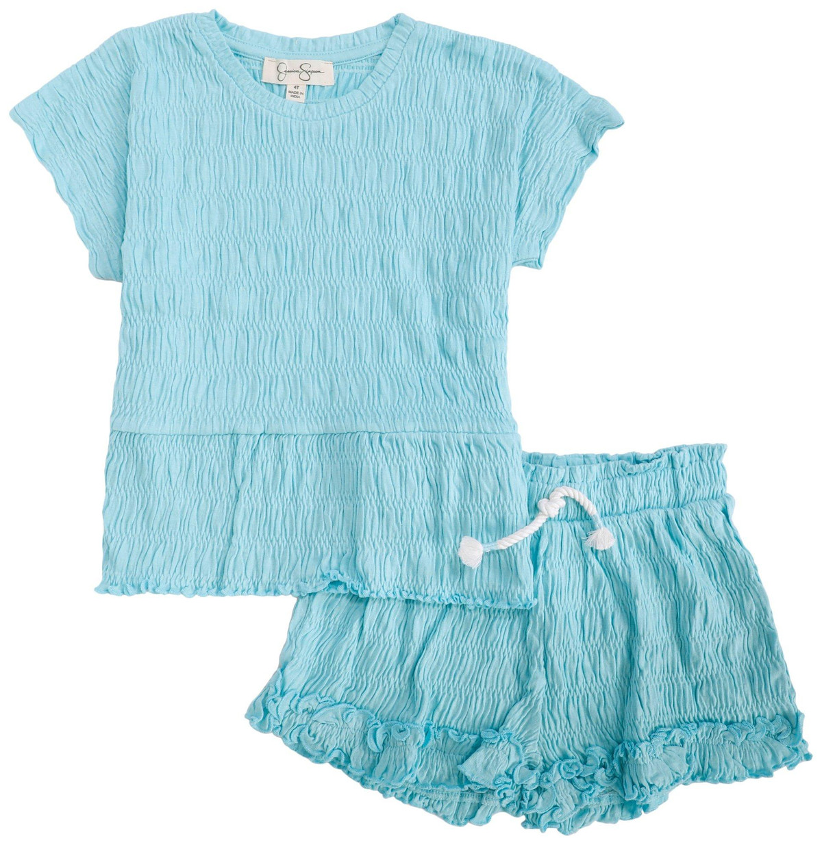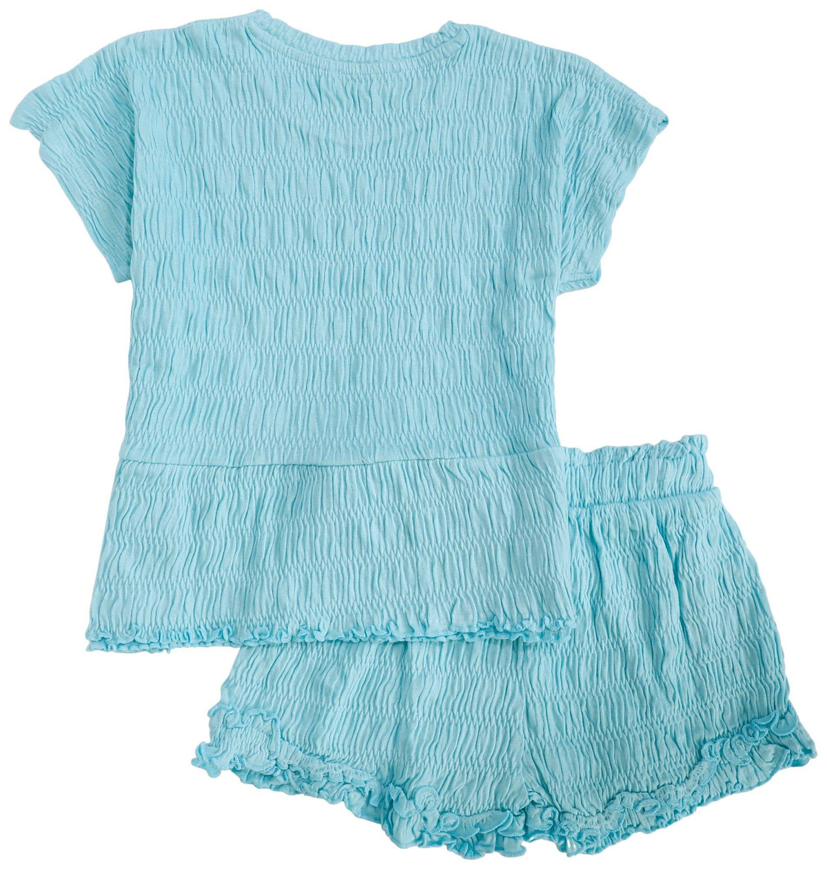 This toddler girls two piece smocked shorts set features a short sleeve peplum top and matching shorts with an all over smocked design. Soft and stylish it offers a charming look that is perfect for warm weather play and casual outings.