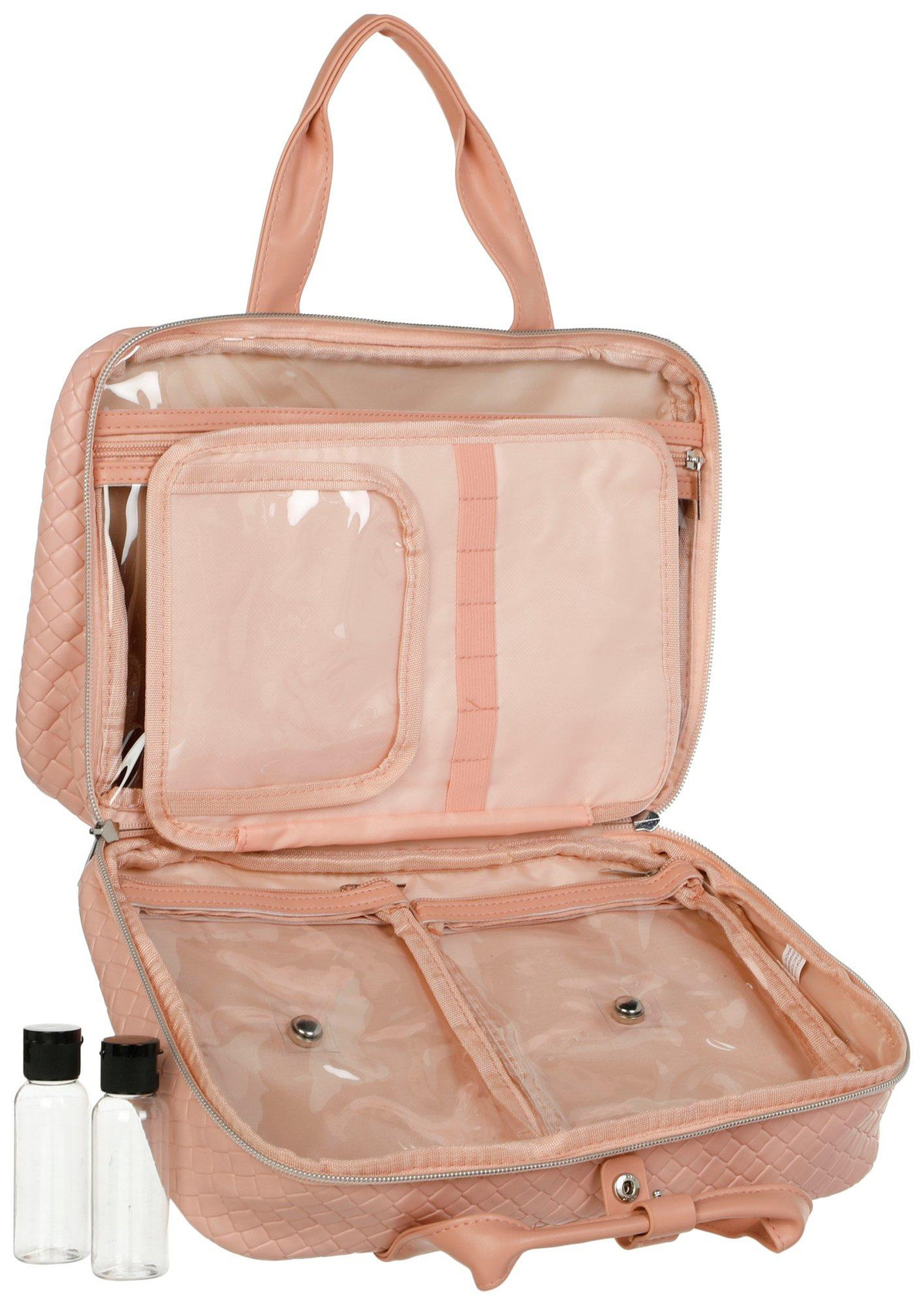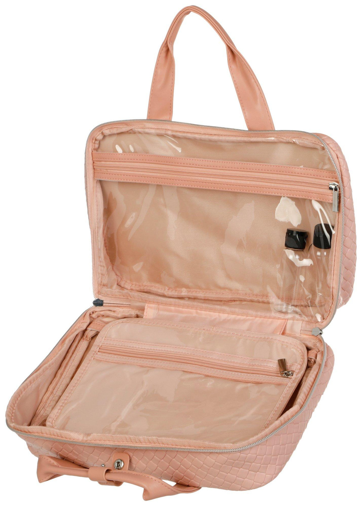 Introducing our woven makeup Case, the perfect blend of style and functionality. This chic case features a solid quilted exterior that exudes elegance. With multiple zippered and slip pockets, it offers ample storage for all your beauty essentials. Elevate your travel experience with this must-have accessory!