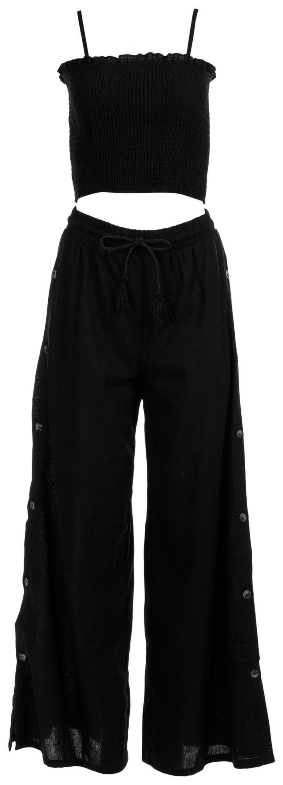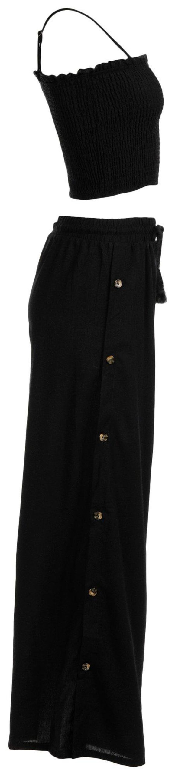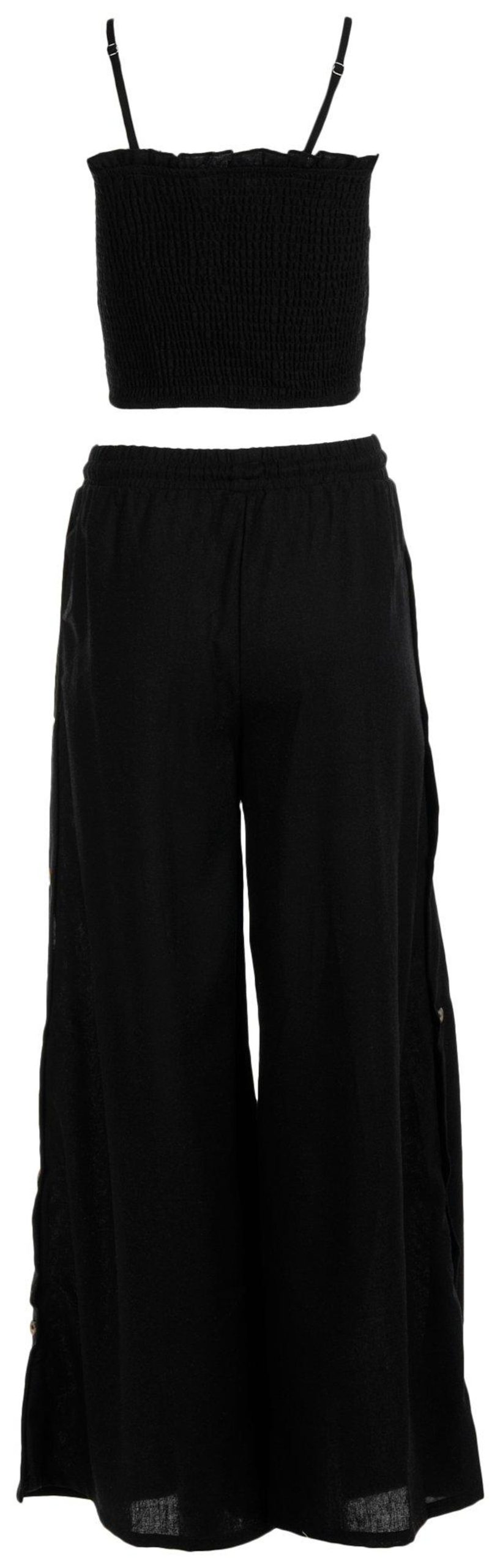 This 2 piece set includes a stylish tank and matching pants with smocked details and a comfortable drawstring waist. Buttoned sides on the pants add a unique touch, perfect for casual days with effortless flair.