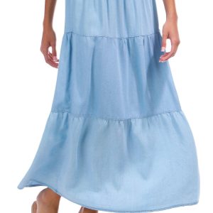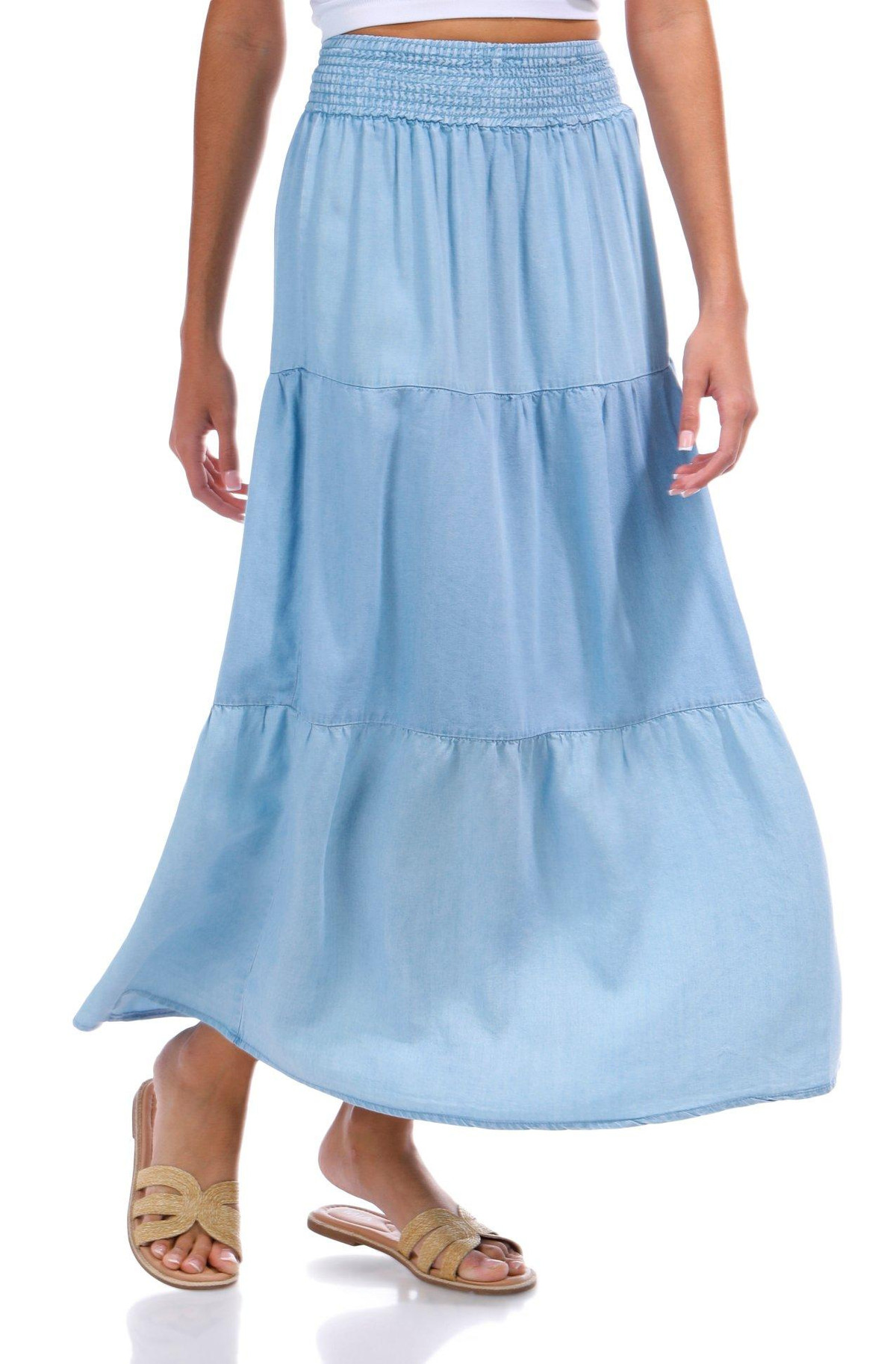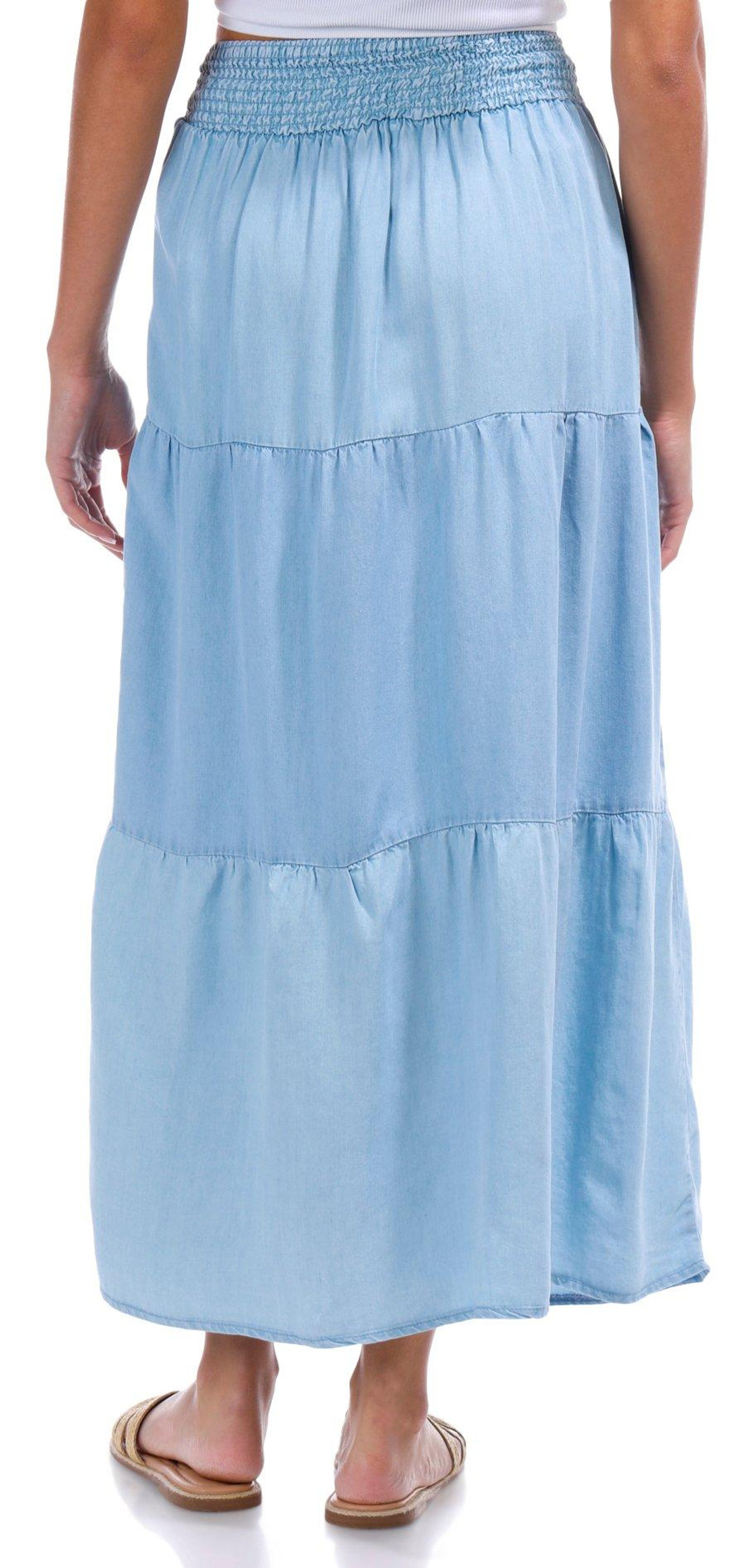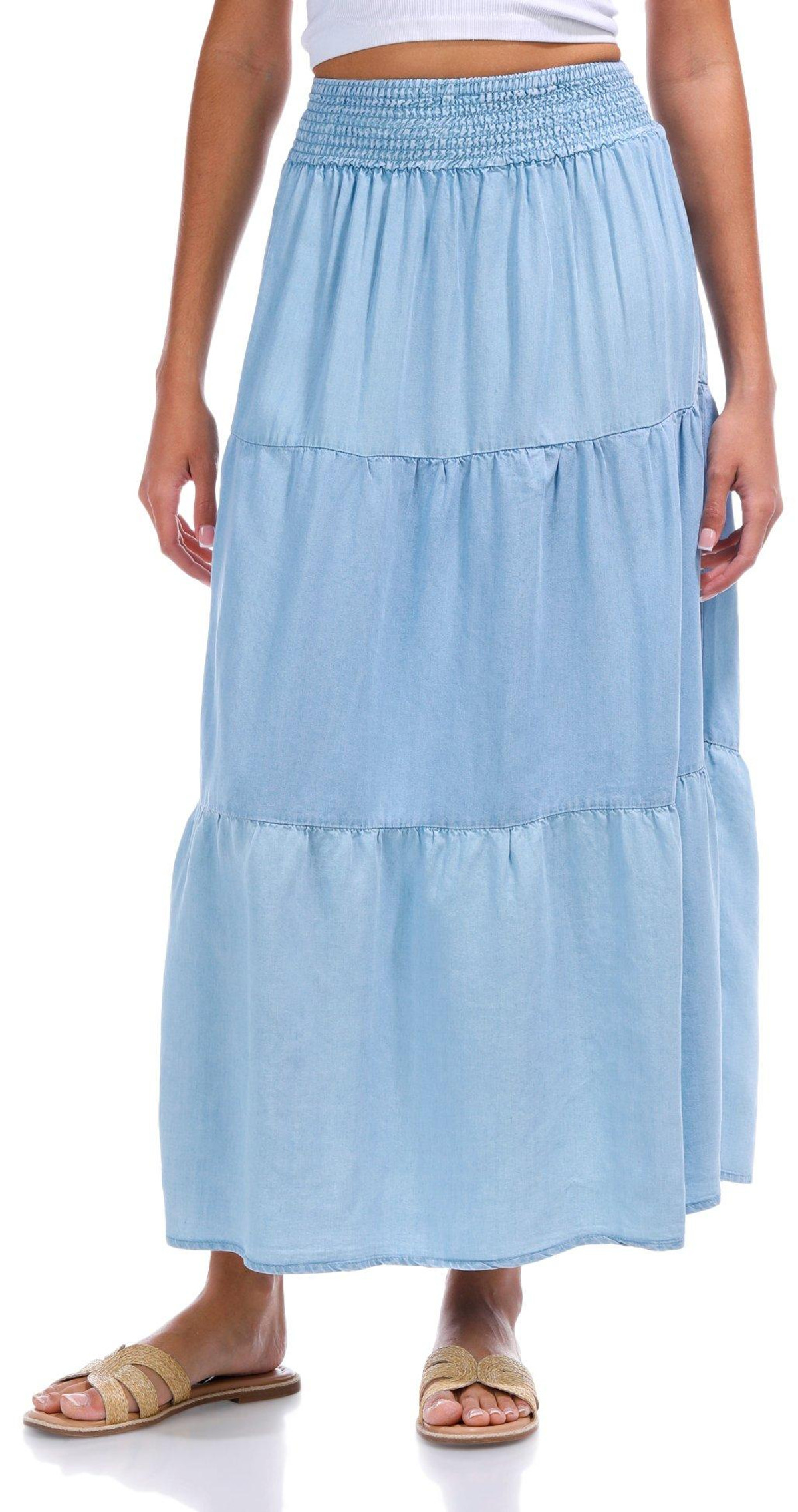 Introducing the Juniors Chambray Tiered Maxi Skirt. Channel that cute western vibe with this tiered chambray maxi skirt, offering a flowy fit for an effortless look. The smocked waistband gives it a comfortable fit around the waist. Perfect for your next concert or casual outing, this versatile maxi skirt is a must-have addition to your closet.