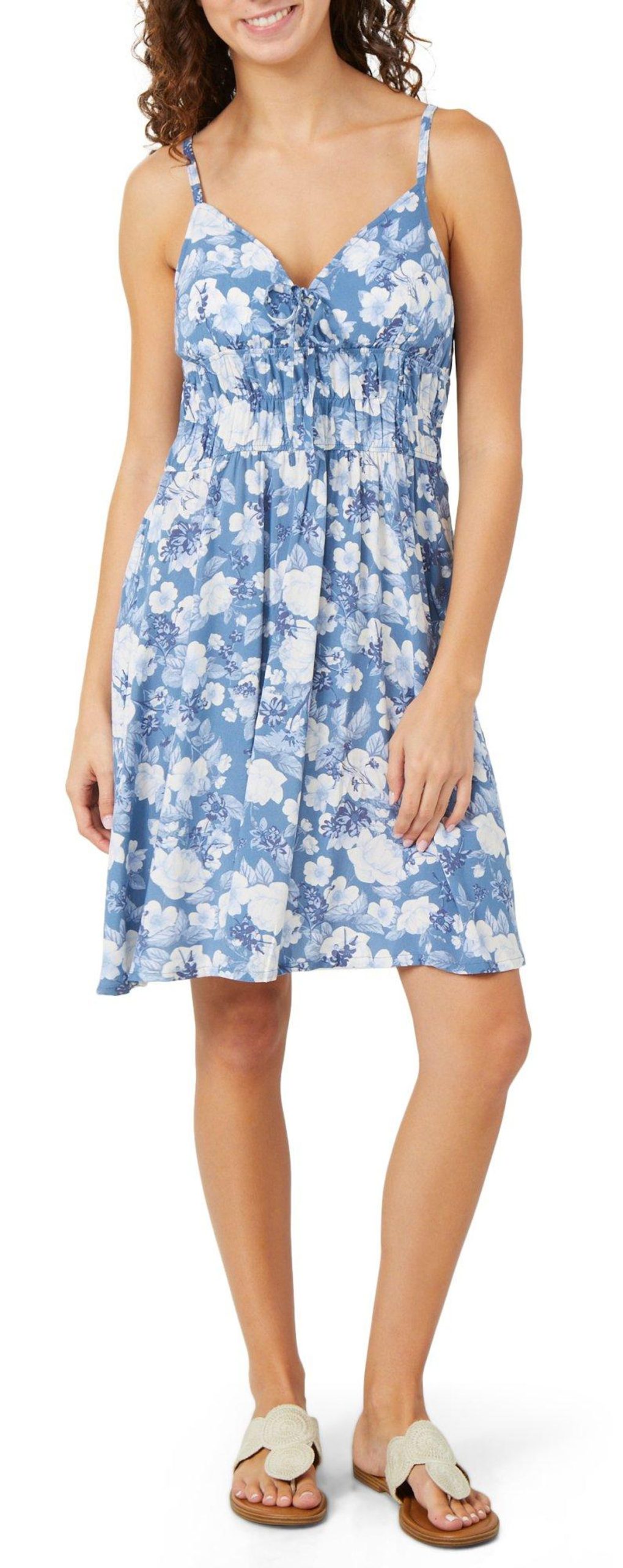 Flaunt your feminine charm in the Juniors Floral Mini Dress, featuring adjustable spaghetti straps, padded cups for support, and delicate ruching under the bust for a flattering silhouette. Fabrication 100% rayon