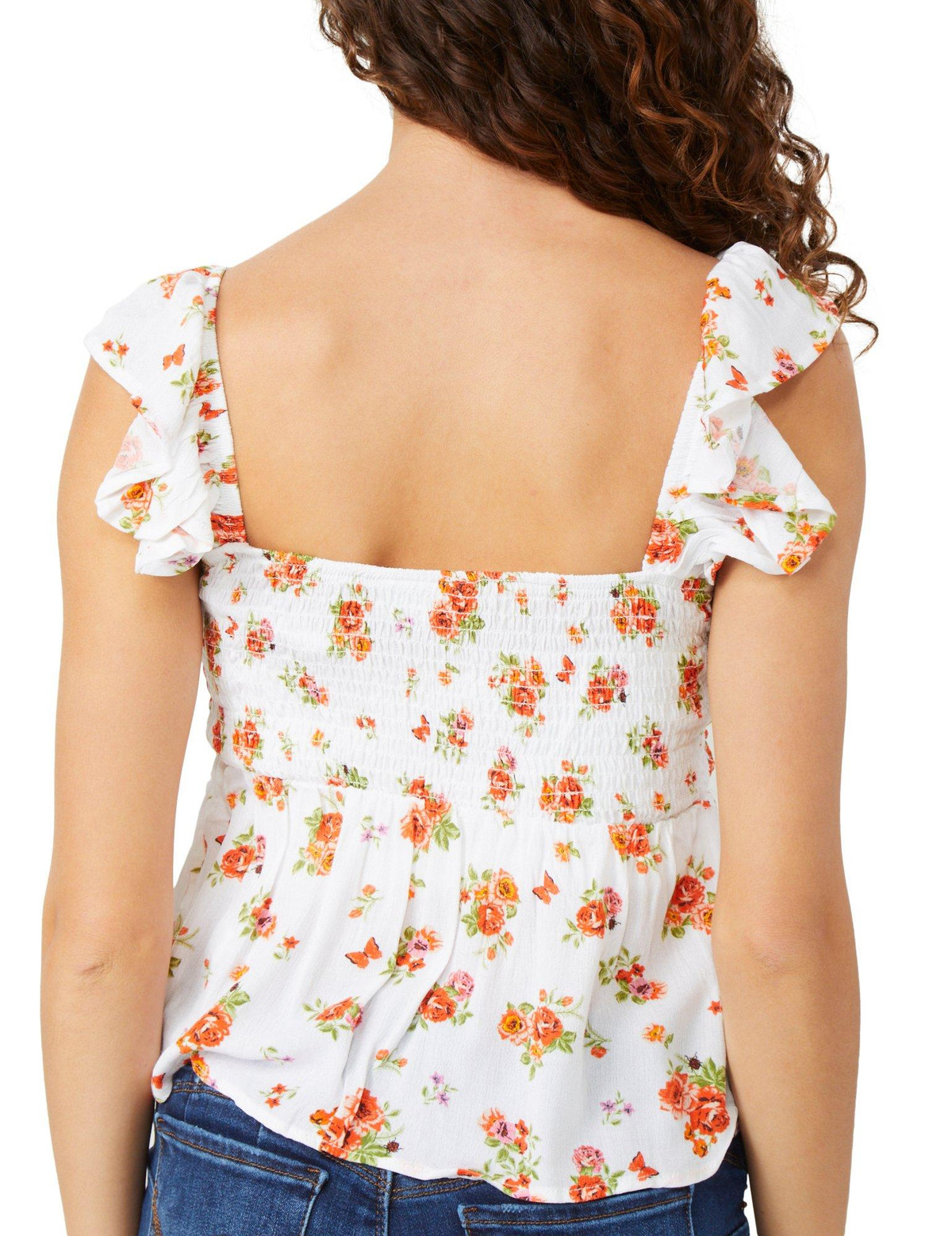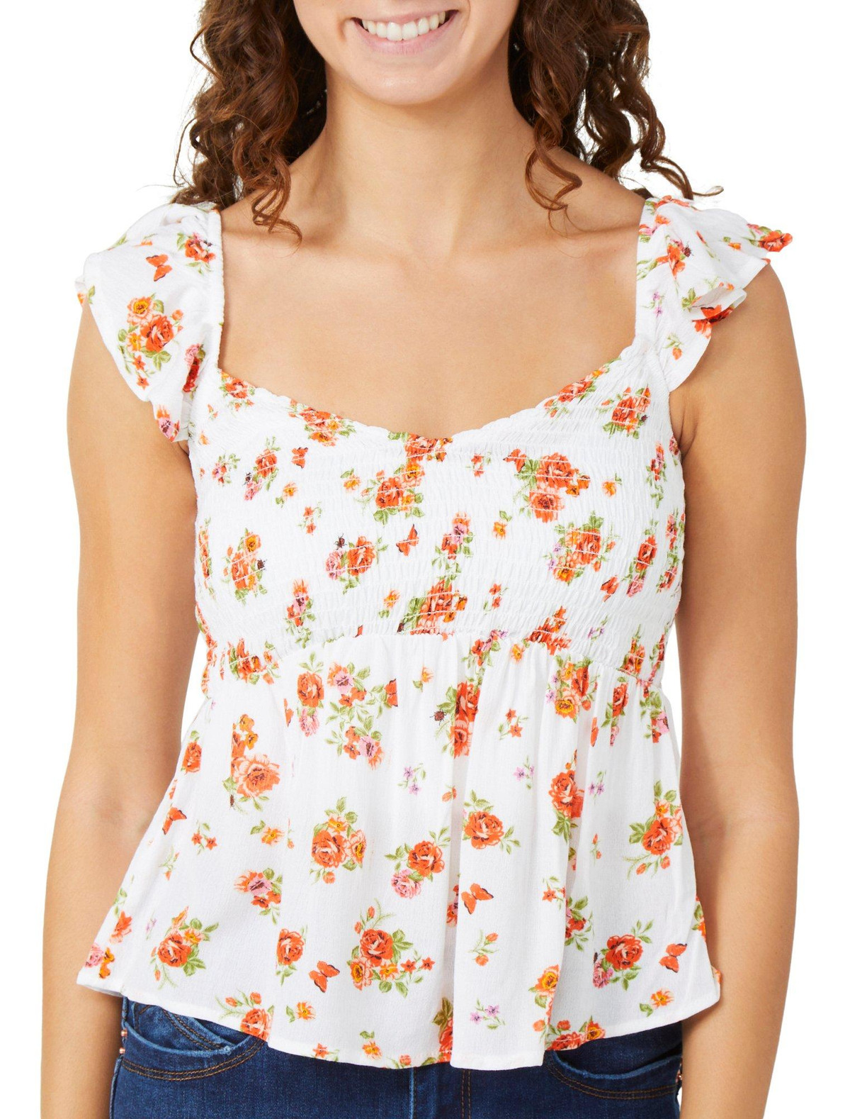 Add a touch of romance to your look with the Juniors Ruffle Sleeve Floral Top. Featuring a delicate floral print, smocked chest for a flattering fit, and fluttery ruffle sleeves, this flowy top is perfect for warm days and effortless style. Fabrication 100% rayon