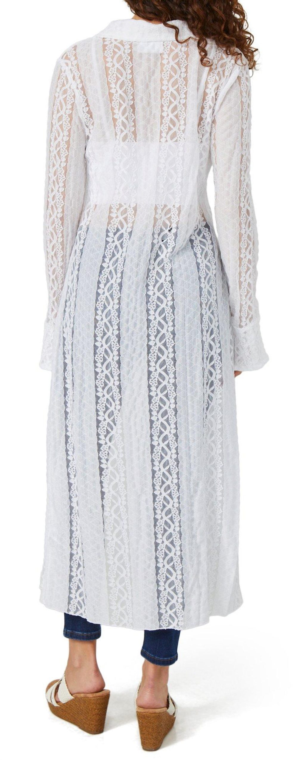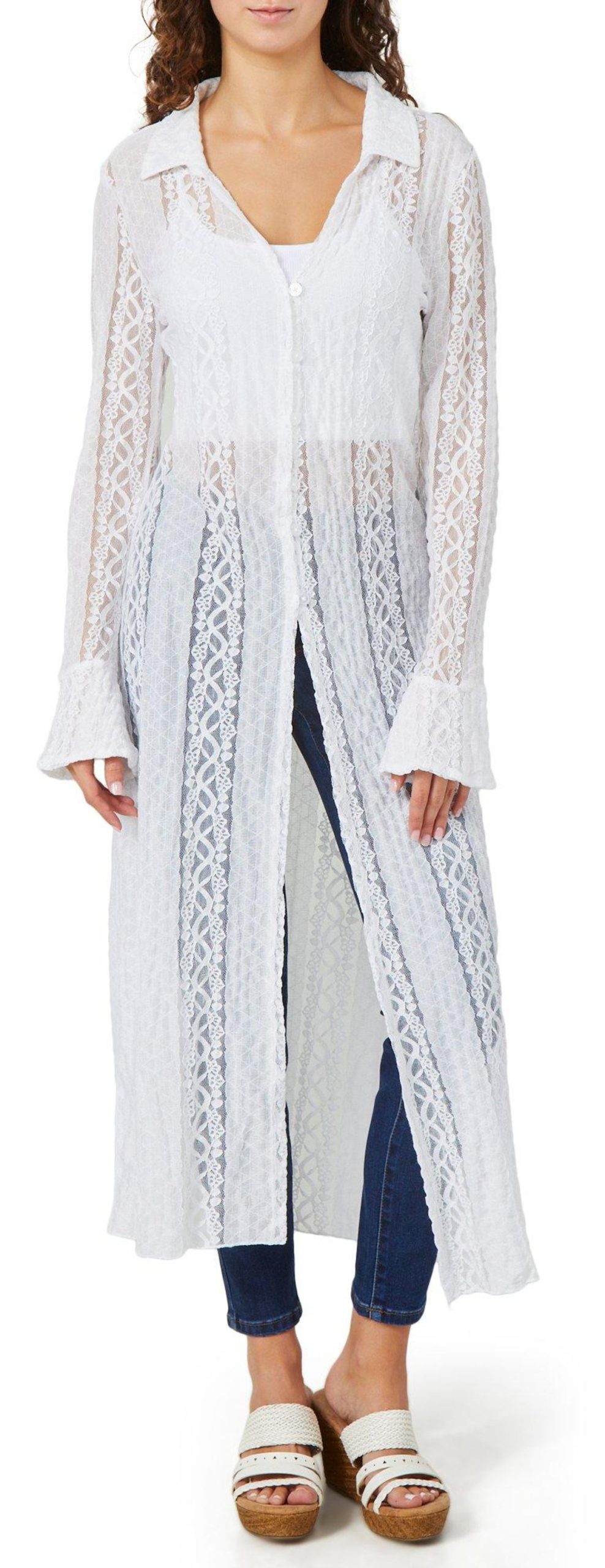 Elevate your layering game with the Juniors Long Sleeve Maxi Lace Duster. This elegant piece features a solid color, classic collar, button down front, and sheer lace design with long sleeves and a flowing maxi length. Perfect for adding a touch of drama to any outfit. Fabrication 98% polyester, 2% spandex