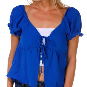 This juniors top adds a playful twist with short puff sleeves and a double tie front. The solid color keeps it versatile while padded cups offer light support. Crafted from woven fabric, it blends structure with softness for a flattering fit. Fabrication 100% polyester
