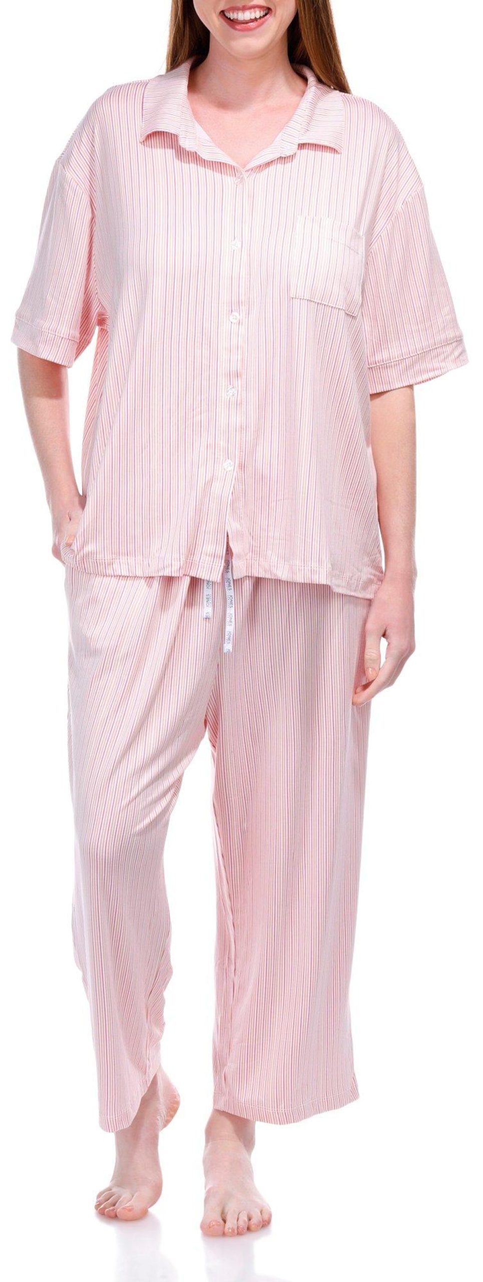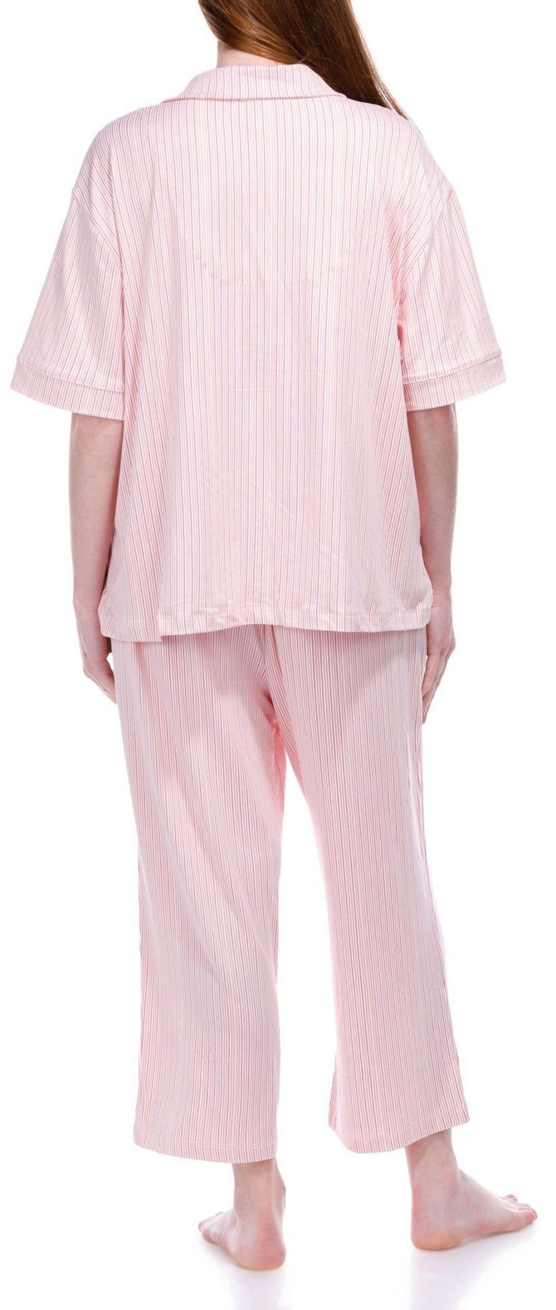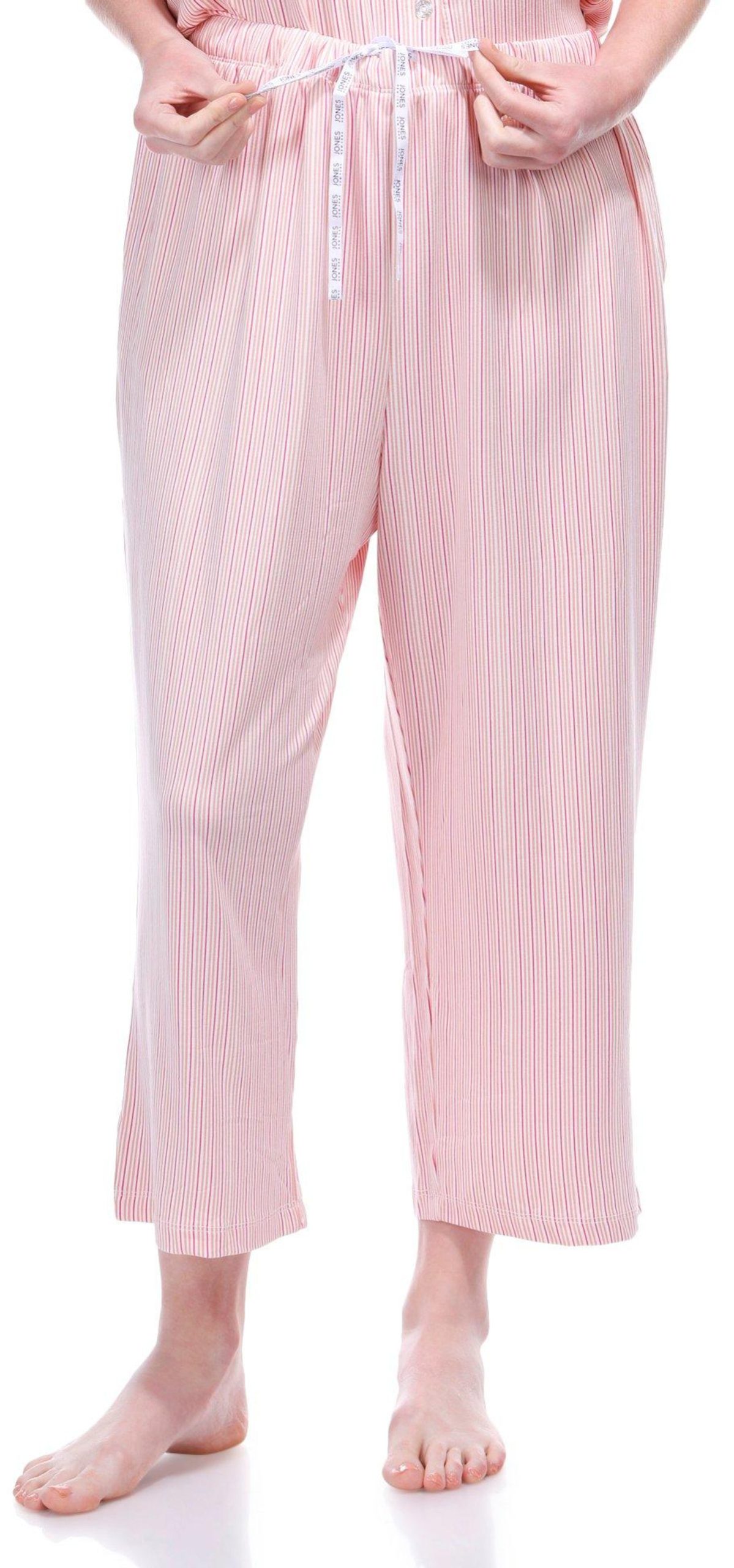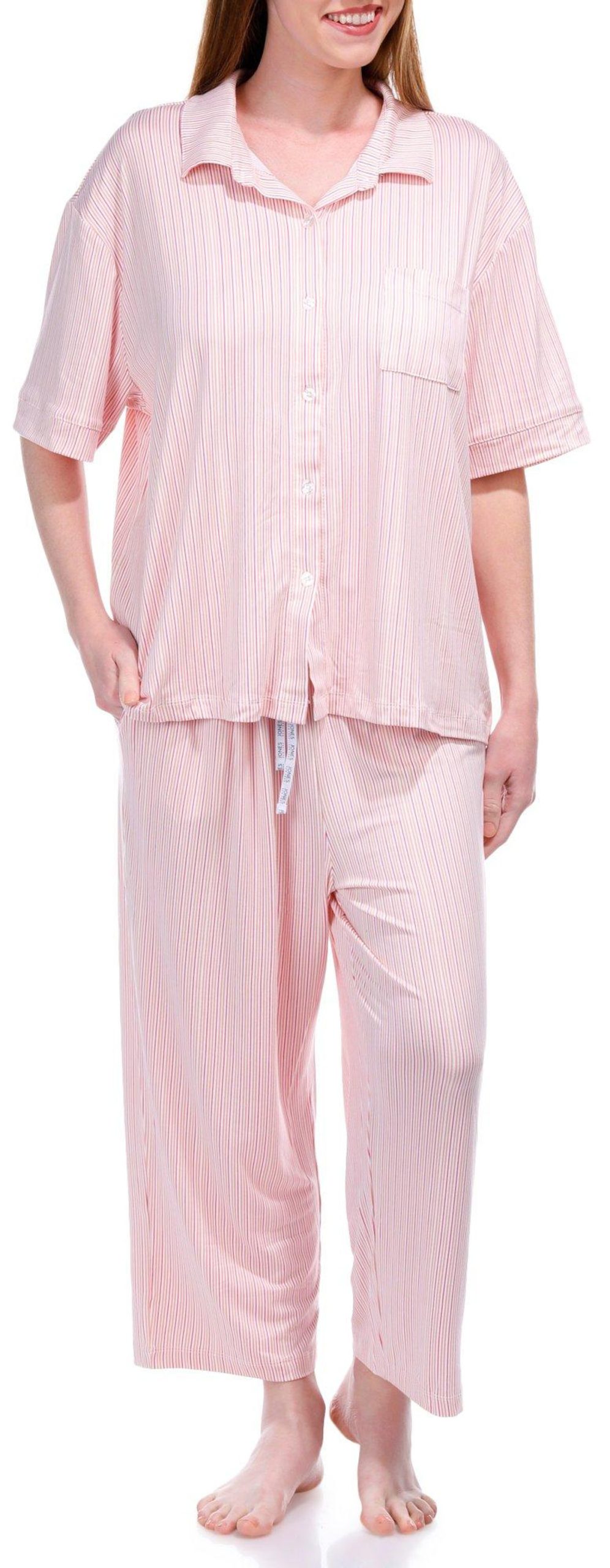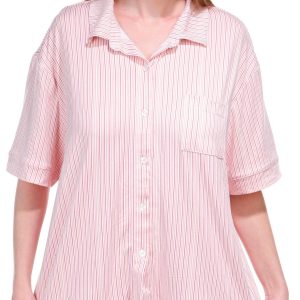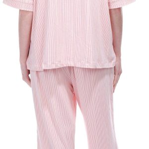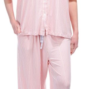 Indulge in cozy elegance with our Women’s 2 Pc Striped Pajama Pants Set. Made from a soft blend of polyester and spandex, this set features a stylish striped print. The short sleeve button-down top with a collared neckline pairs perfectly with the matching pants, offering both comfort and sophistication for your nighttime routine.