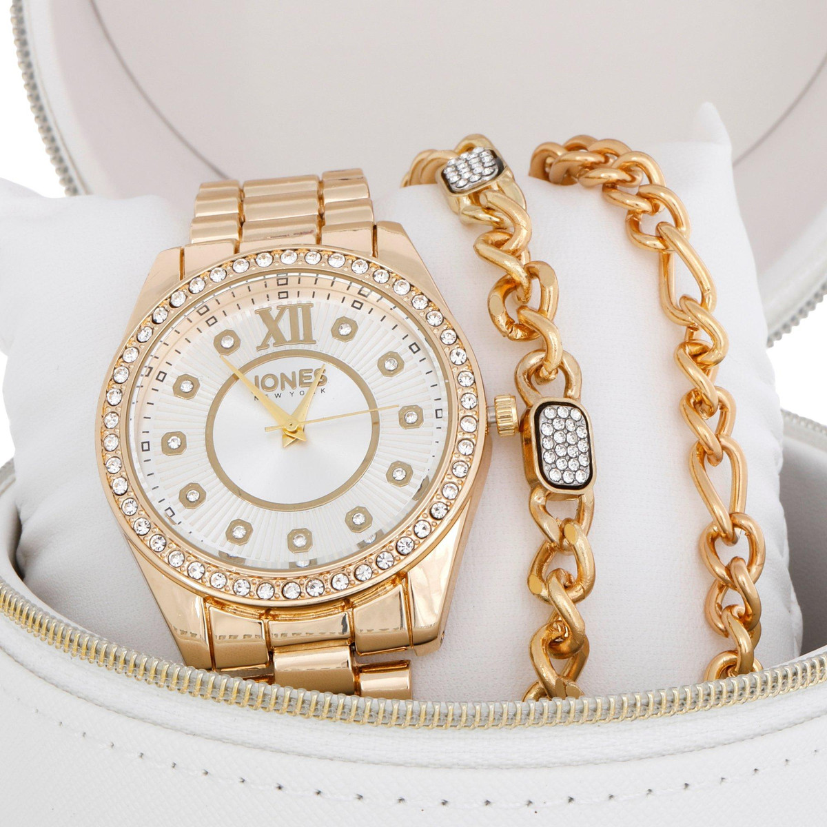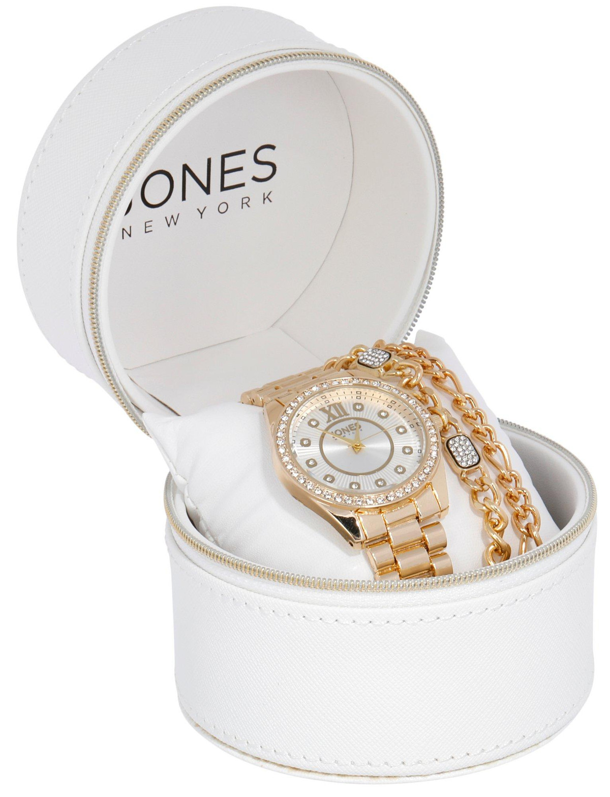 Elevate your accessory collection with the Jones New York Women’s 3-Piece Boxed Watch Set. This chic set features a sleek watch paired with coordinating bracelets, all presented in a stylish gift-ready box. Perfect for adding a touch of sophistication to any outfit or as a thoughtful gift for a loved one. Whether dressing up for a special occasion or adding flair to everyday wear, this set offers versatility and timeless appeal.
