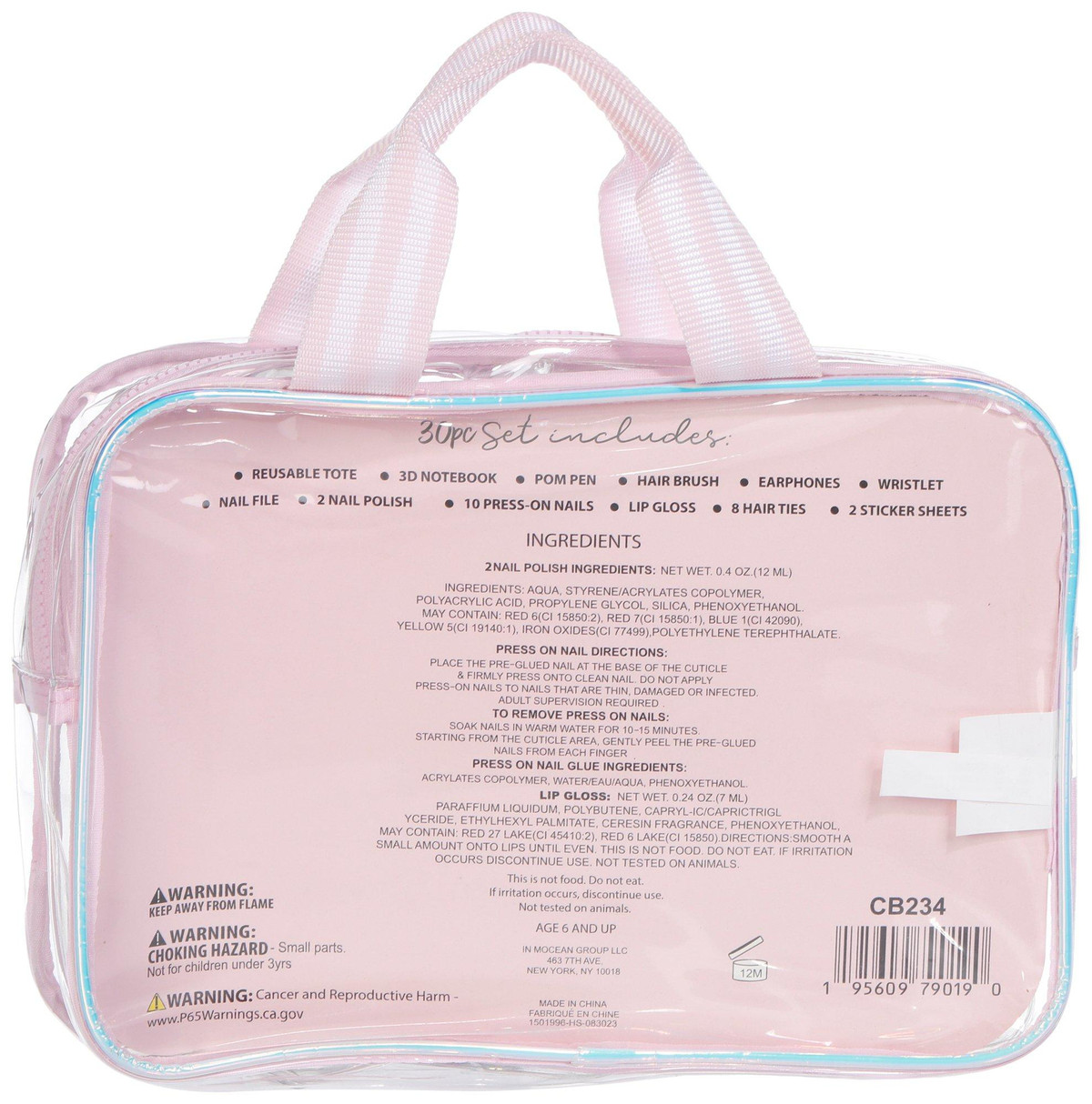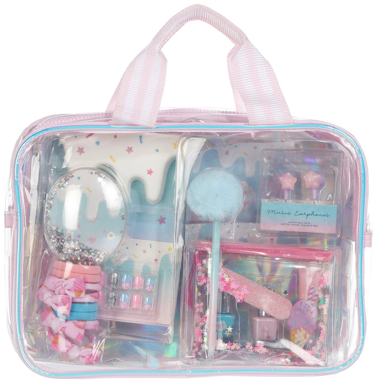 This clear mini duffle beauty and journal set in pink is a delightful gift for ages 6 and up. It includes a hairbrush, glitter star-shaped earphones, wristlet, pom pom pen, lip gloss, 10 press-on nails, nail file, nail polish, 3D notebook, reusable tote, 8 hair ties, and 2 sticker sheets. The set is super cute and perfect for little girls who love fun accessories and creative play. Easy to carry and packed with charm!