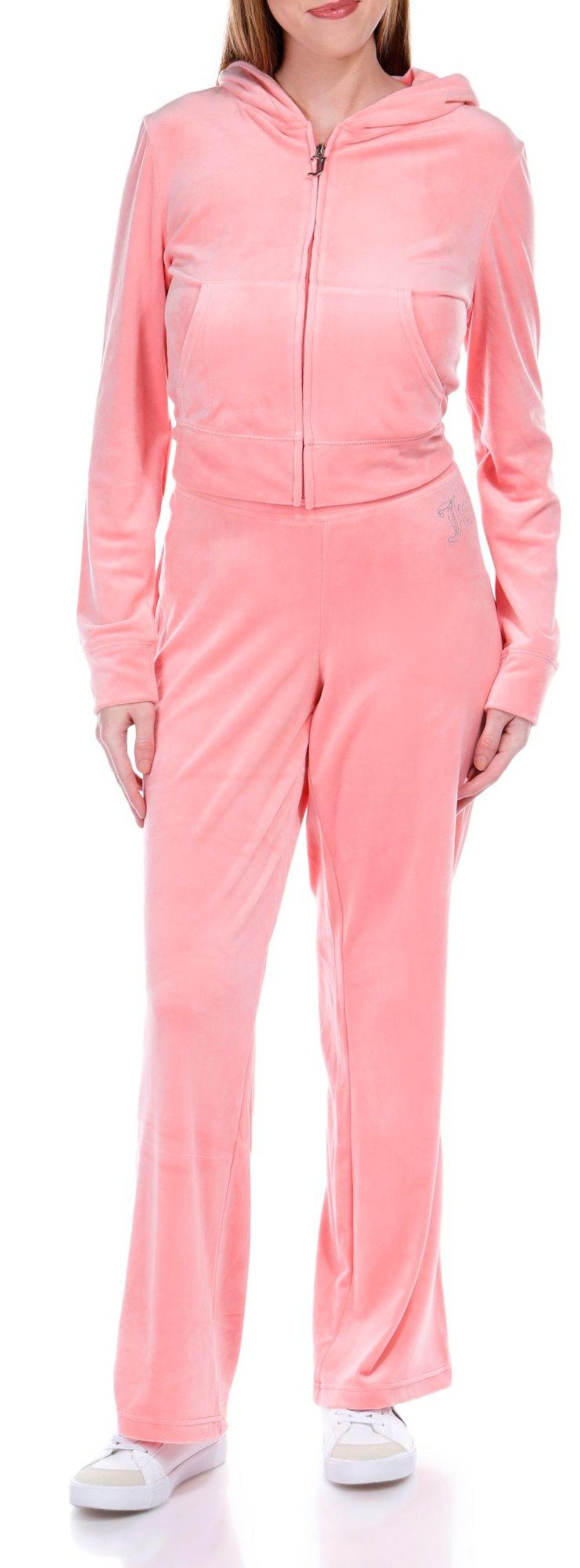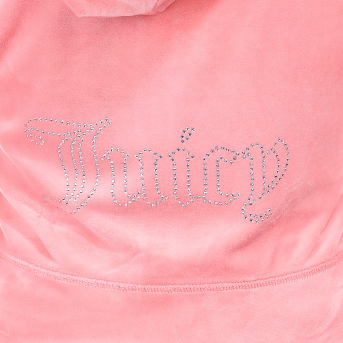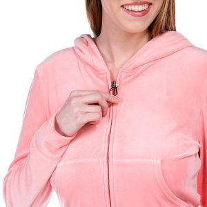Introducing the Juniors Velour Zip Up Jacket, crafted from a blend of polyester and spandex for a comfortable and stylish fit. This jacket features a solid color, a hooded neckline, and convenient side pockets. The full front zip-up closure ensures ease of wear, while the rhinestone brand script on the back adds a touch of glamour. With a length of 19 inches, this jacket is perfect for layering and adding a chic element to your casual outfits.