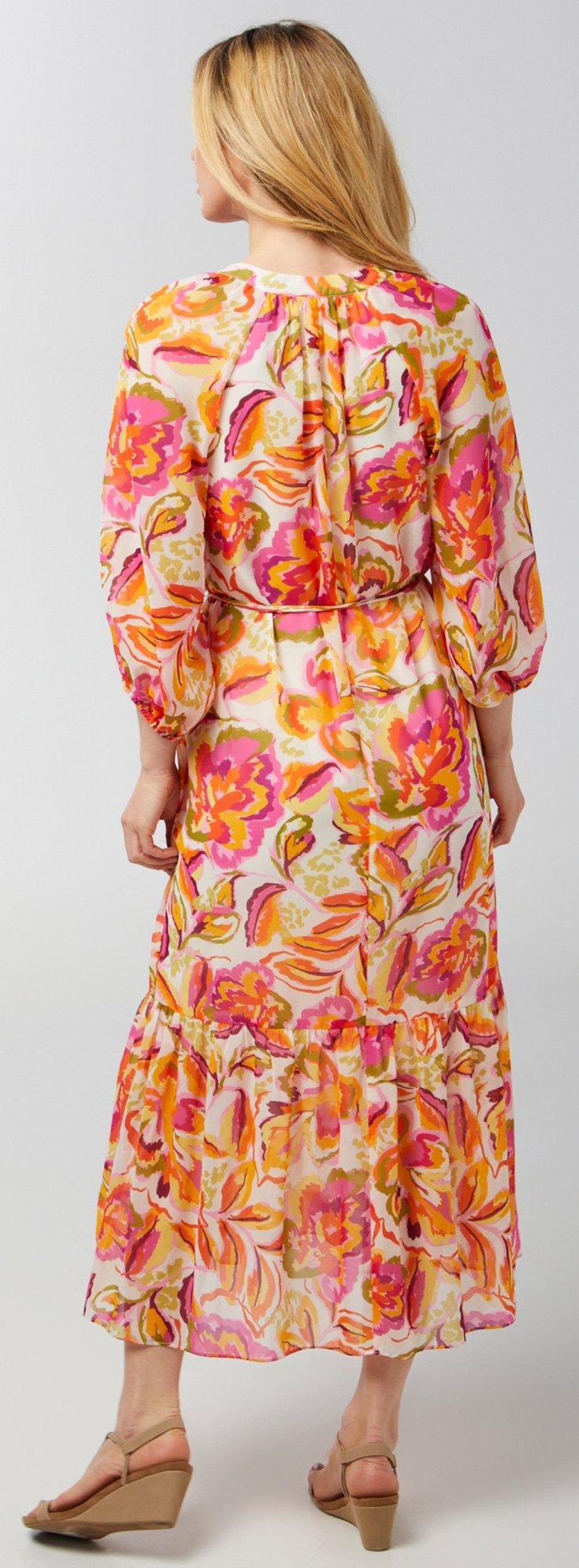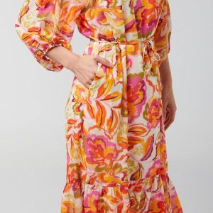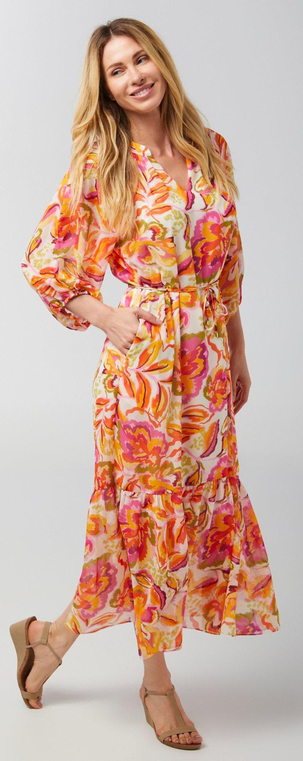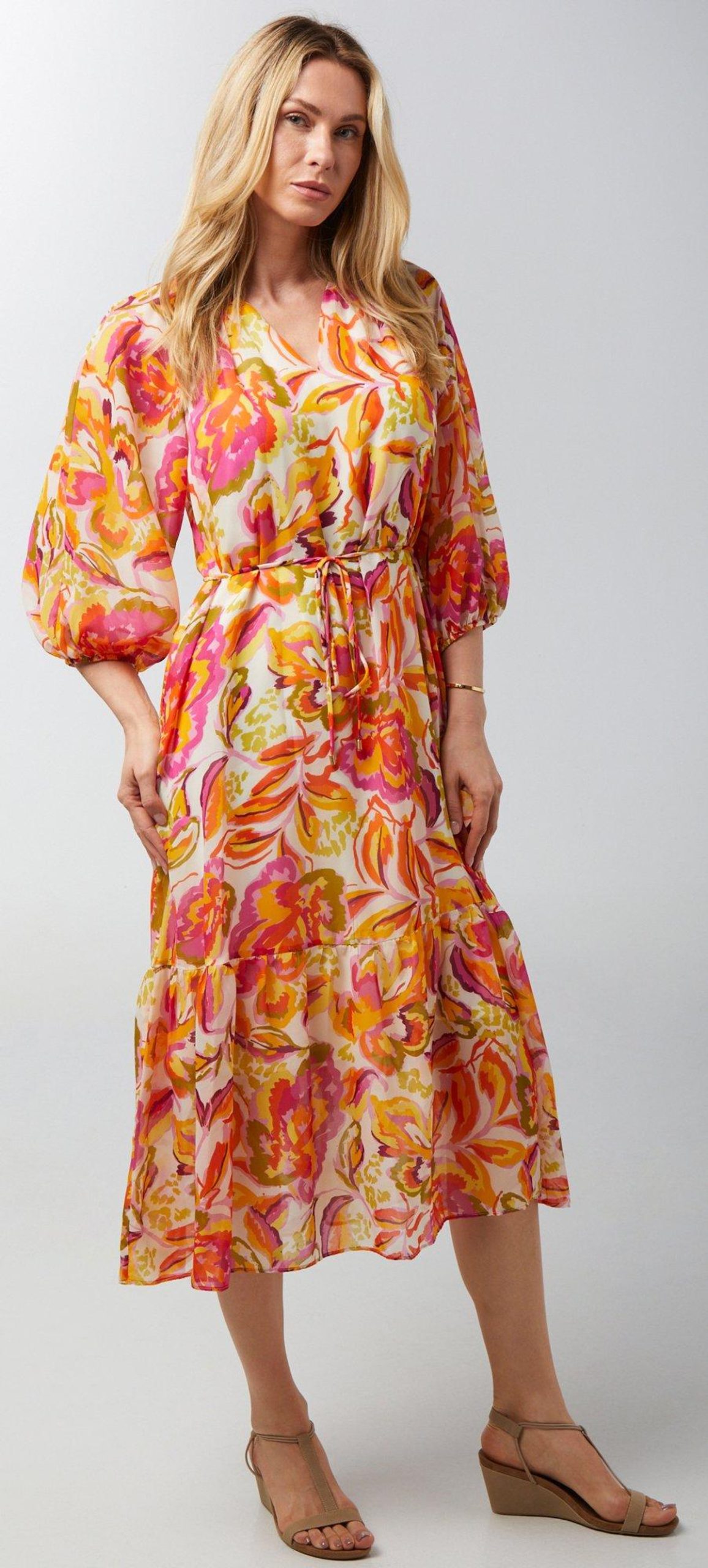 Introducing our Women’s 3/4 Sleeve Print Chiffon Dress, crafted from polyester. This stylish dress features a chic print, a flattering v-neckline, and elegant 3/4 sleeves. The waist tie accentuates your silhouette, while the 56-inch length adds a touch of sophistication. Perfect for any occasion, this chiffon dress combines comfort and style, making it a versatile addition to your wardrobe.