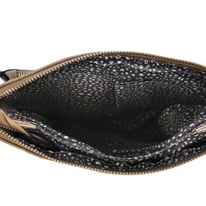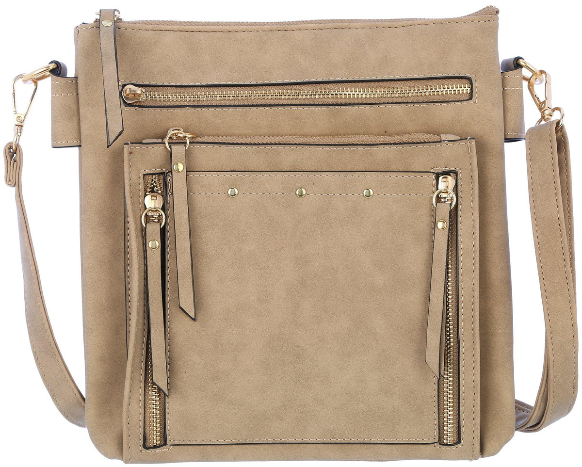 The Tammi crossbody bag features a stylish solid faux suede exterior, gold tone hardware, removable crossbody strap, three exterior zip compartments, a top zip compartment with two inner zip and slip pockets. Measures 10 in. x 10 in.