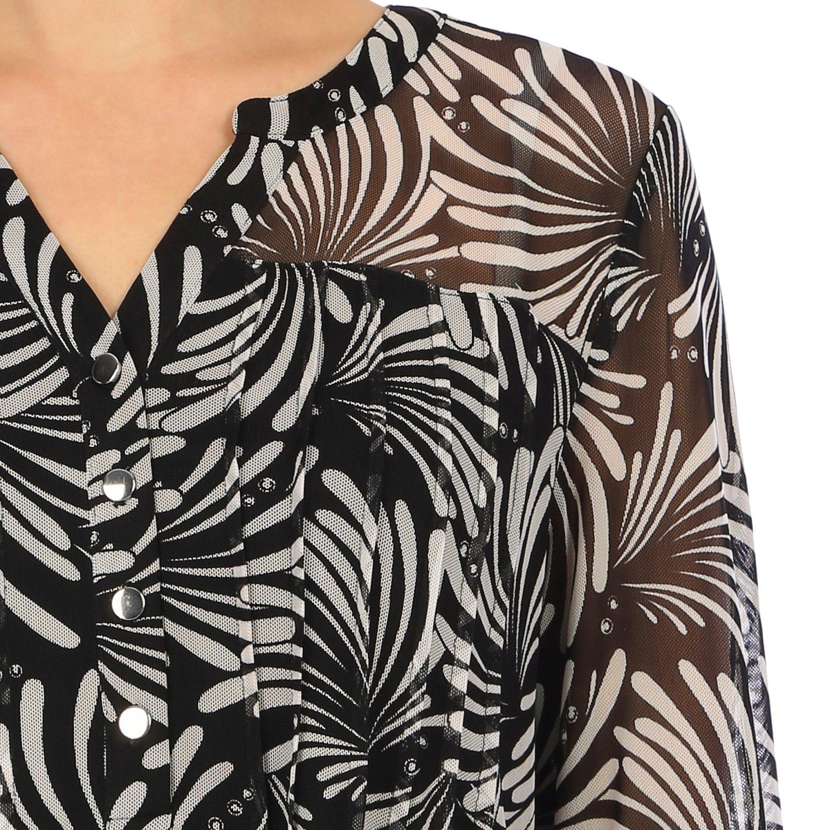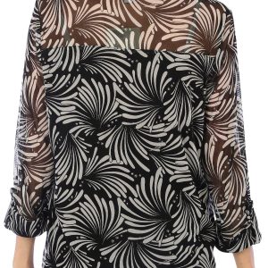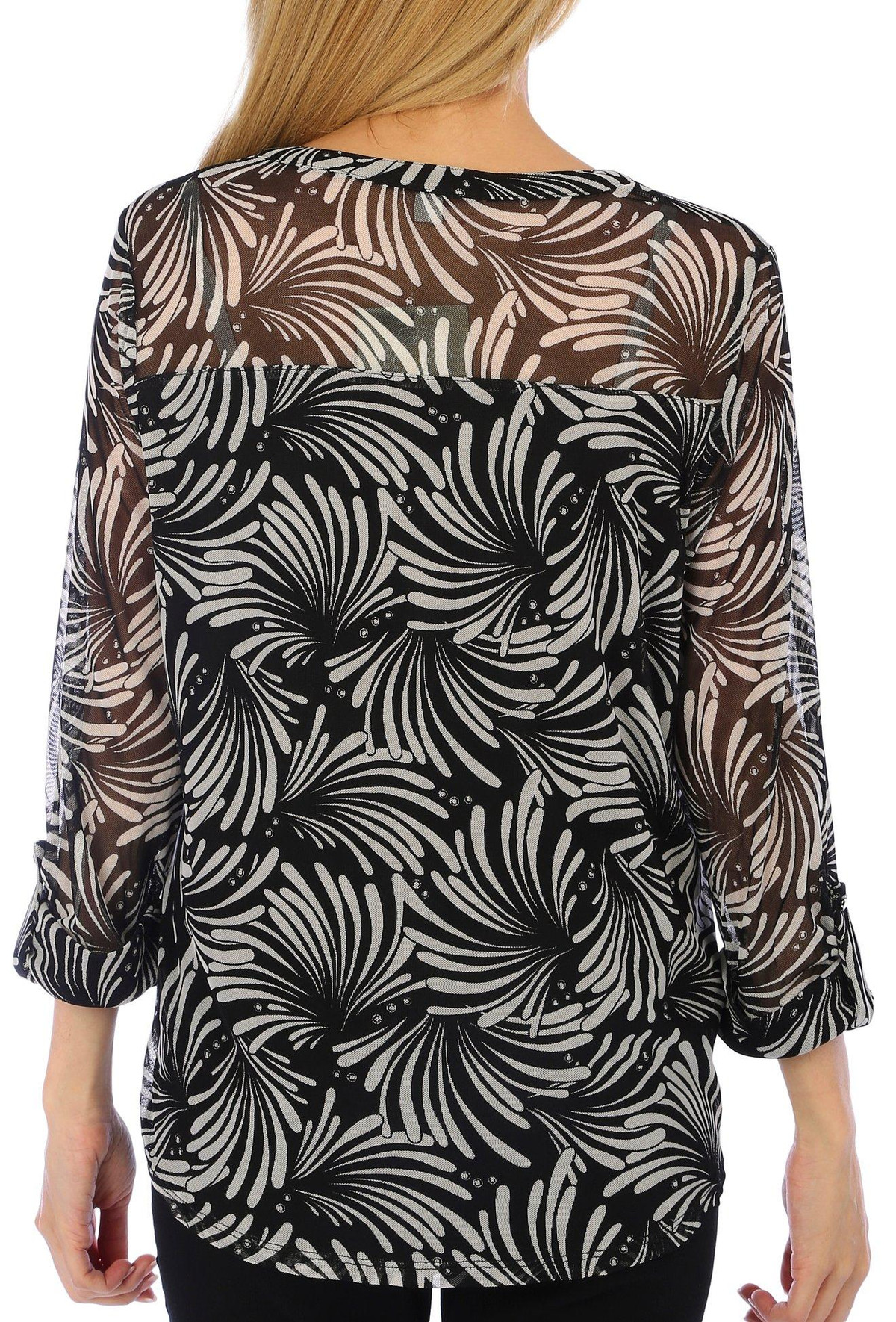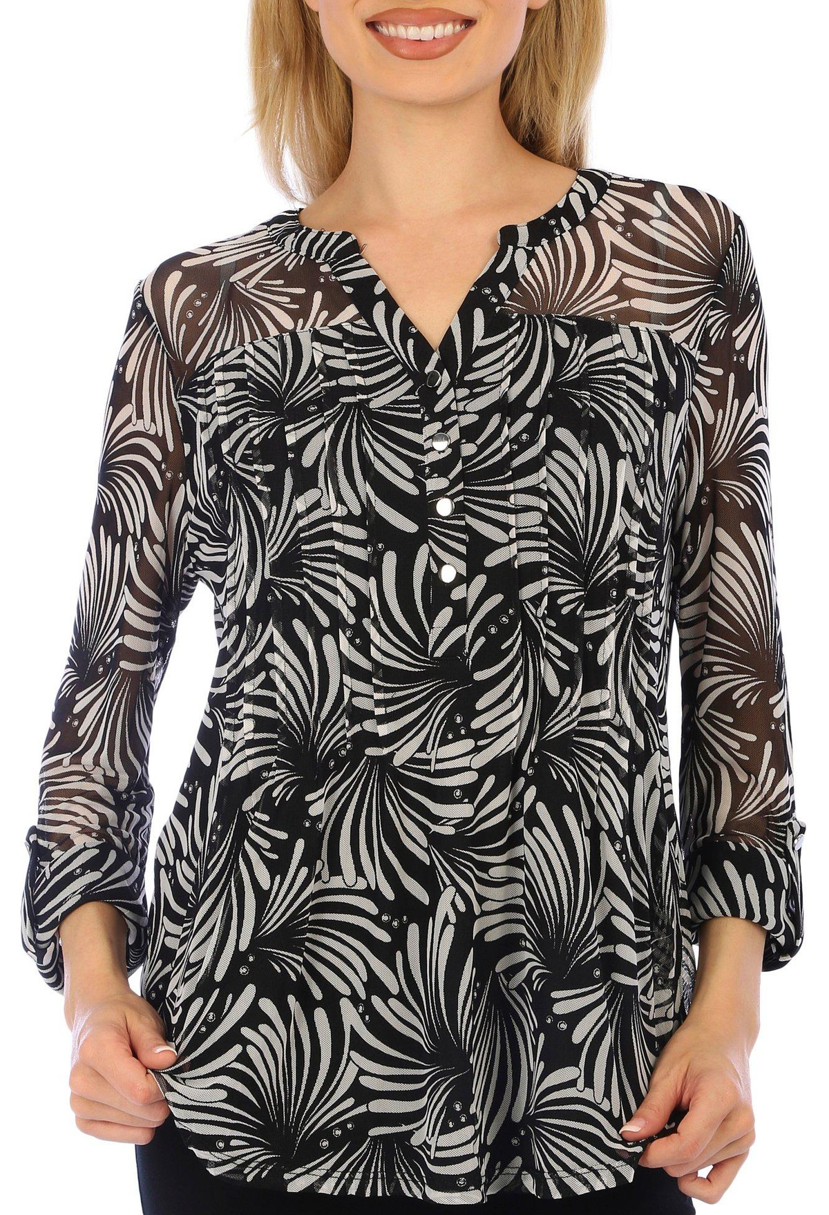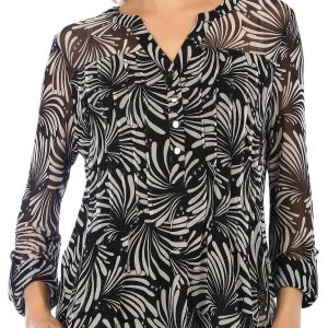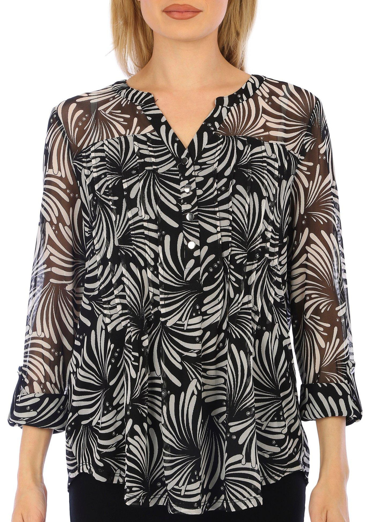 Introducing the Petite Pleated 3/4 Sleeve Top, crafted from a blend of polyester and spandex for a comfortable fit. This top features a stylish abstract print, a mesh outer layer, roll-tab 3/4 sleeves, pleated detail, and a button-down placket. Perfect for both casual and dressy occasions, this versatile piece adds a touch of elegance and sophistication to any wardrobe!