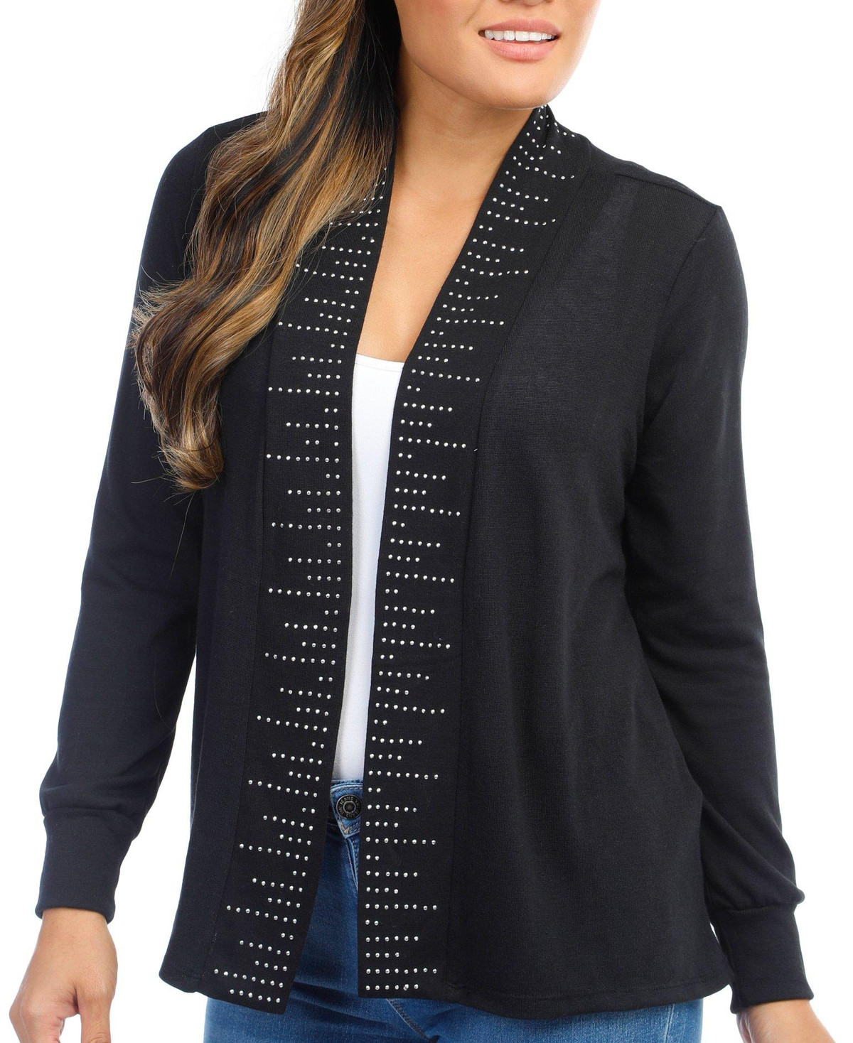 This long sleeve embellished cardigan features a solid color design on soft lightweight knit fabric, and open relaxed styling. The top length measures approximately 25 in. Fabrication 60% polyester, 27% rayon 5% spandex.
