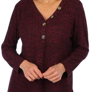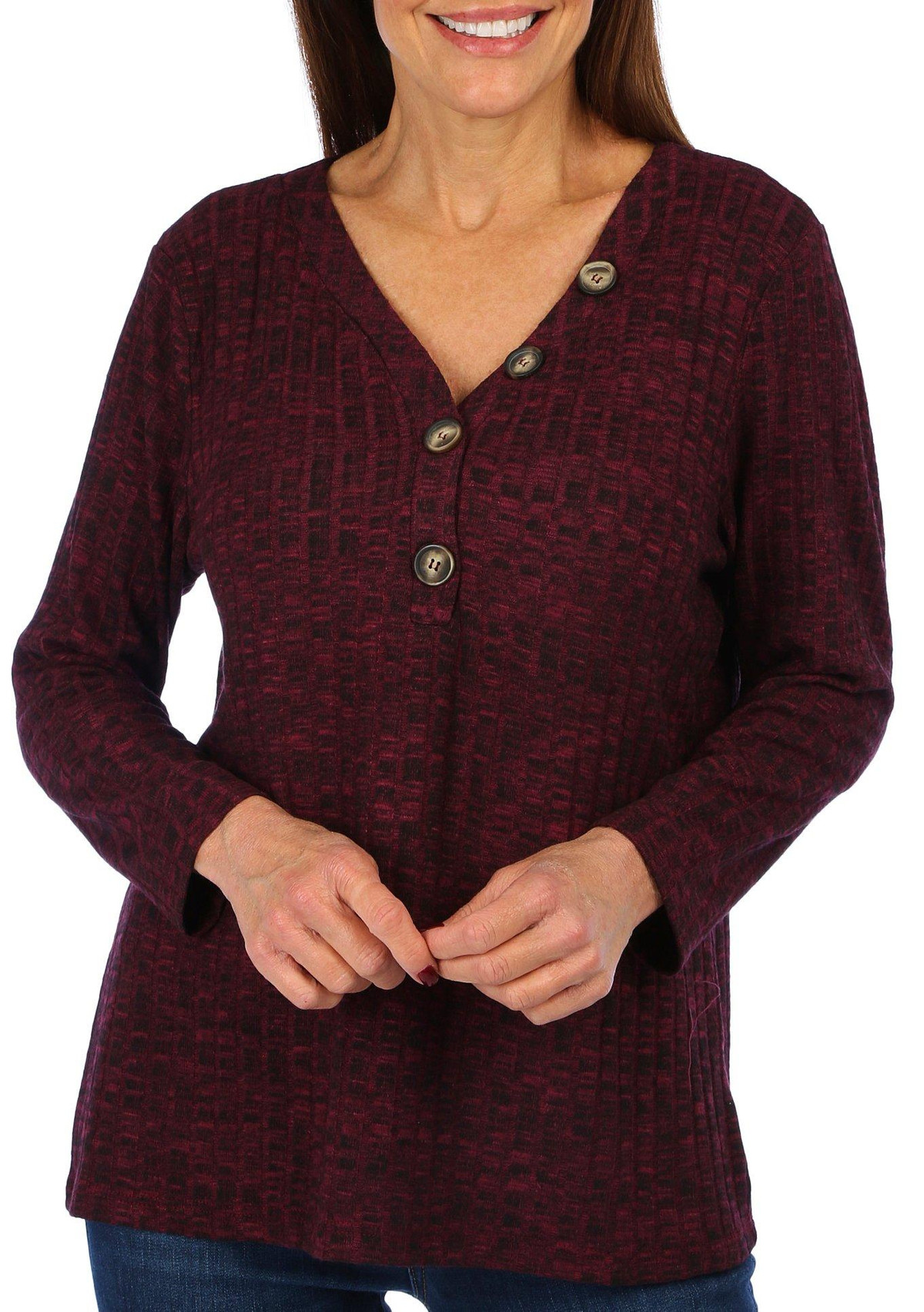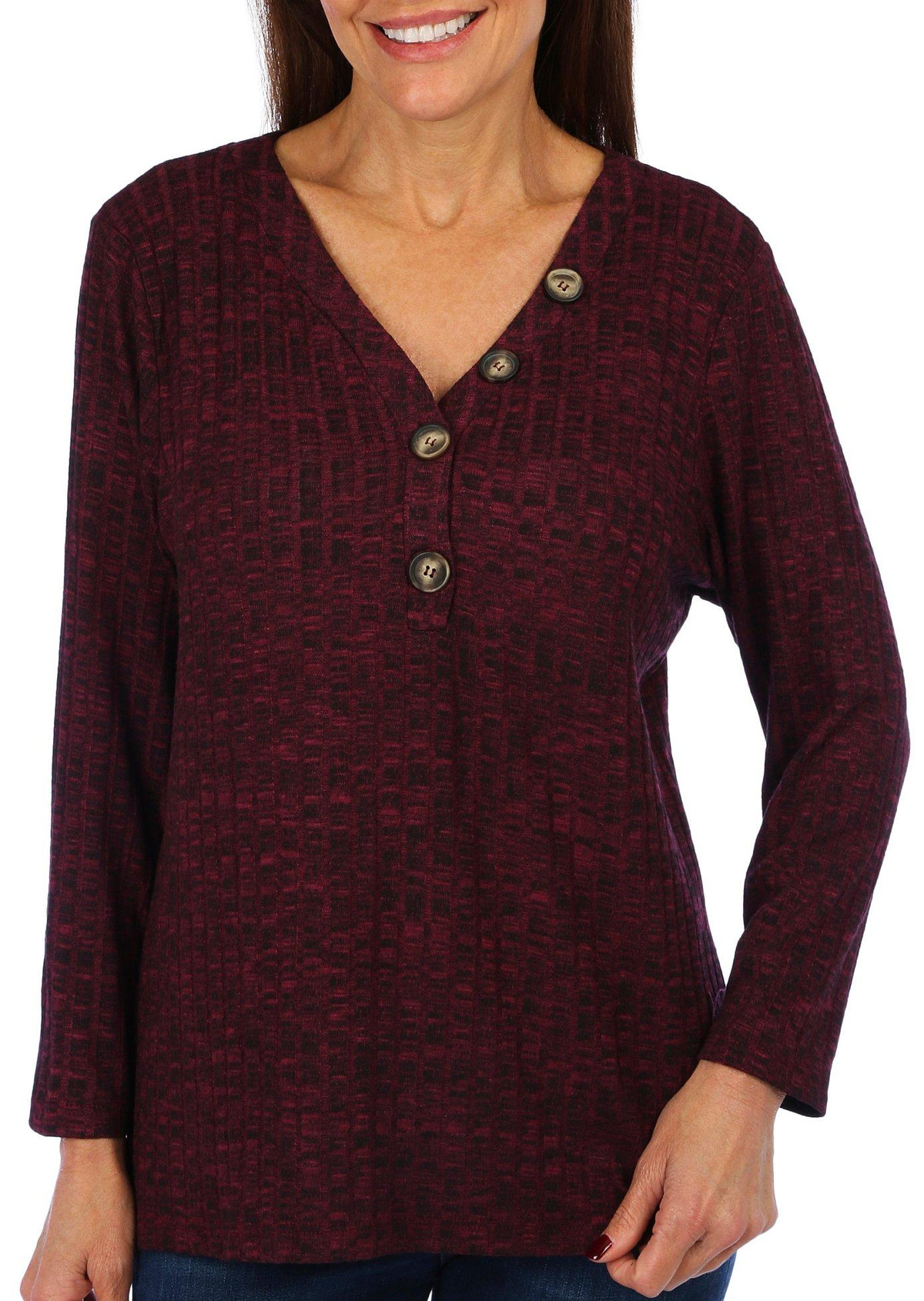 Experience ultimate comfort with our Petite V-neck Hacci Long Sleeve Top. Crafted from a blend of polyester, rayon, and spandex, this top offers a super soft feel that youll love. It features a stylish solid color with a ribbed design, adding a touch of texture. The button accents on the v-neckline neckline provide a classic look. Perfect for any casual occasion, this top combines style and comfort effortlessly.