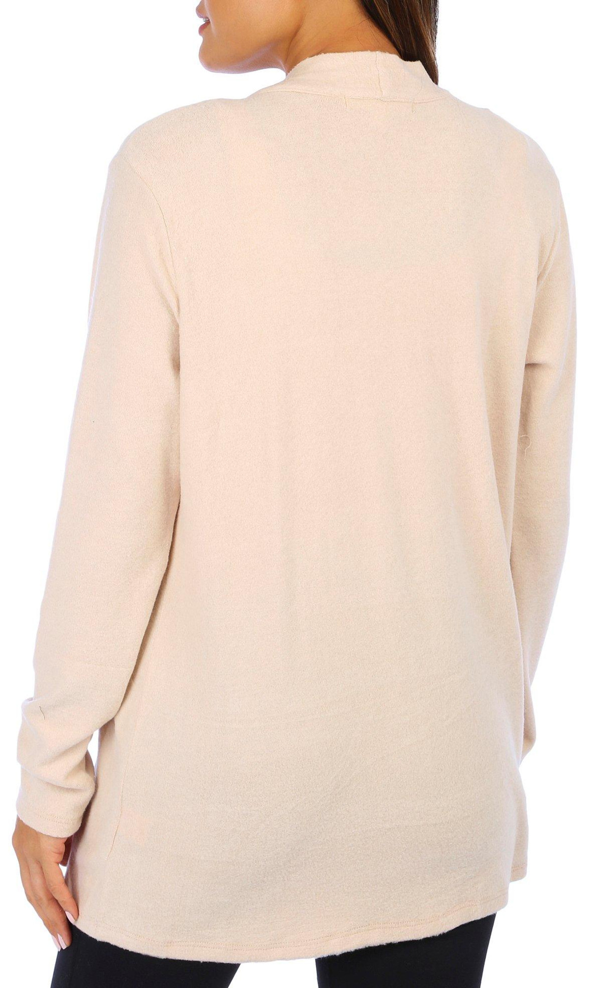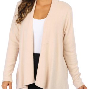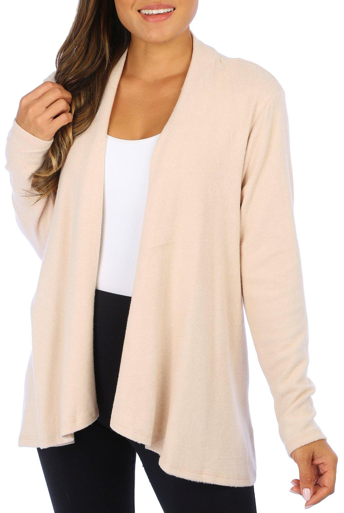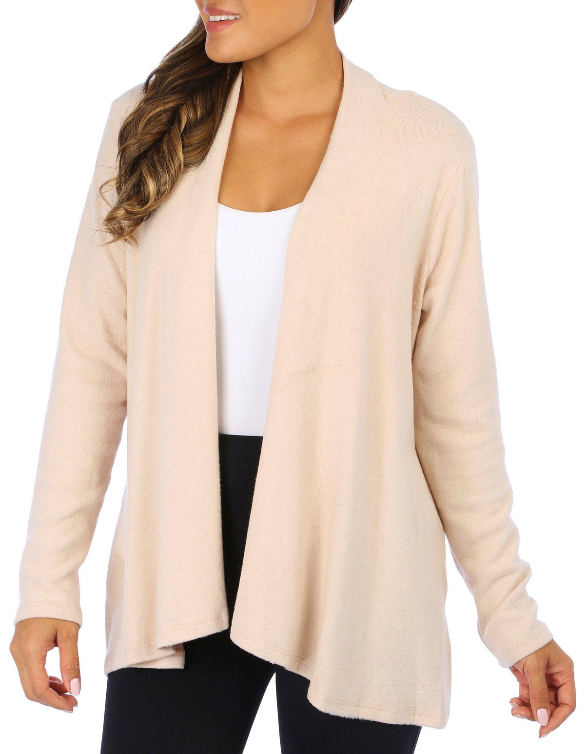 This 3/4 sleeve cardigan features a solid color design on soft lightweight knit fabric, and open relaxed styling. The top length measures approximately 25 in. Fabrication 95% polyester, 5% spandex.