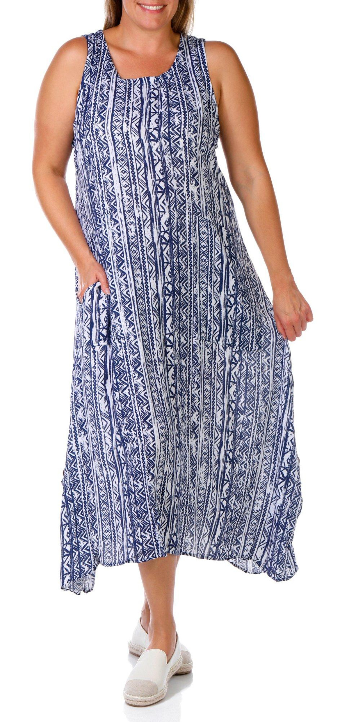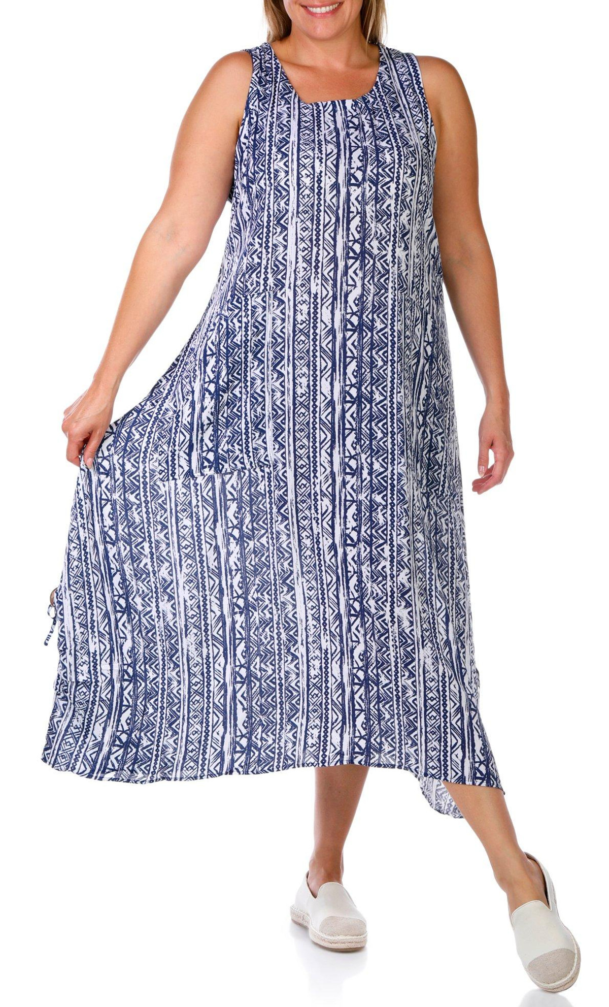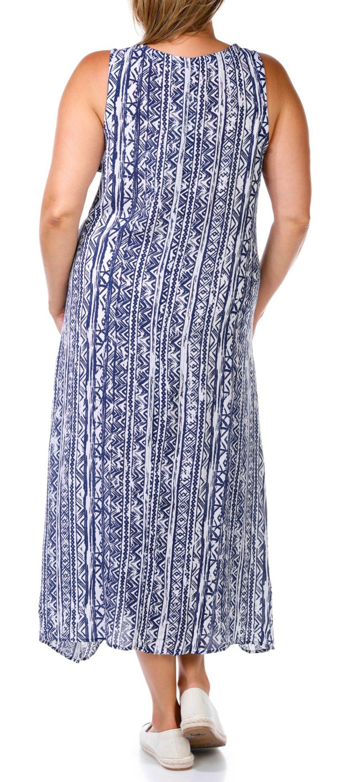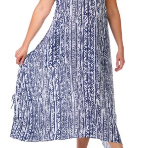 This sleeveless midi dress in lightweight crepon offers breezy elegance with versatile styling. Designed to be worn two ways, this piece transforms from long to short with ease, making it perfect for day-to-night transitions or travel-ready looks. Fabrication is 100% rayon.