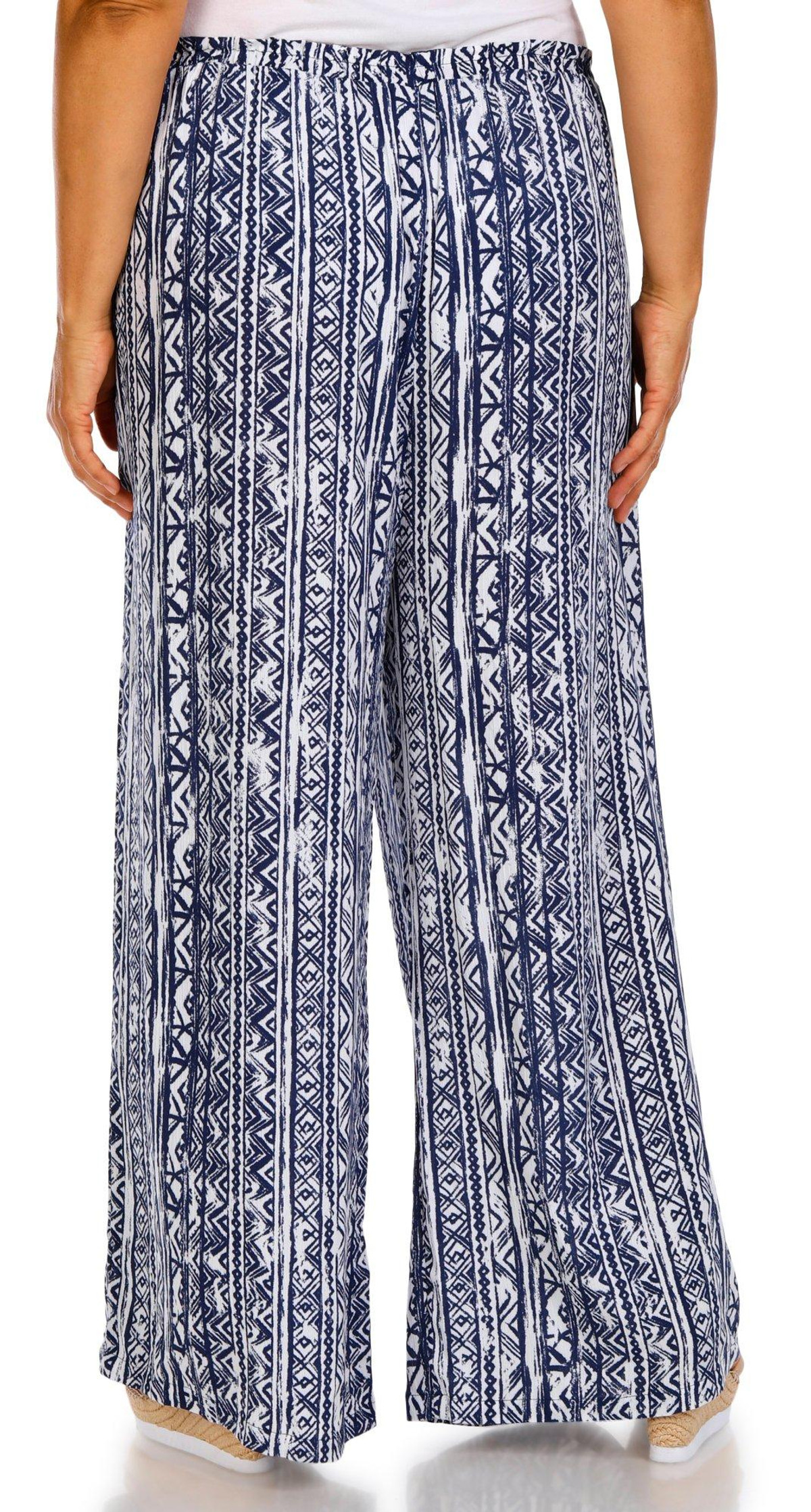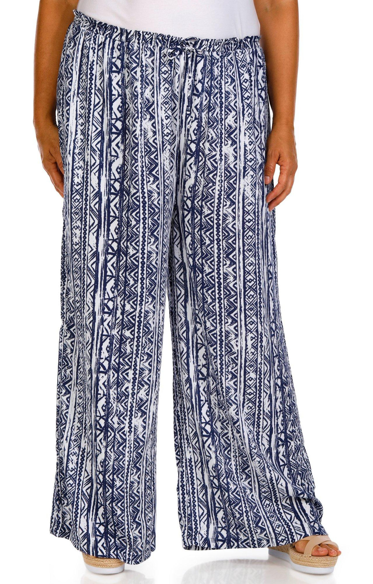These plus size wide leg pants feature a stylish allover print and a relaxed pull on fit with a drawstring waistband. Side seam pockets add function while the wide leg design offers breezy comfort and effortless style for any casual day. Fabrication 100% rayon