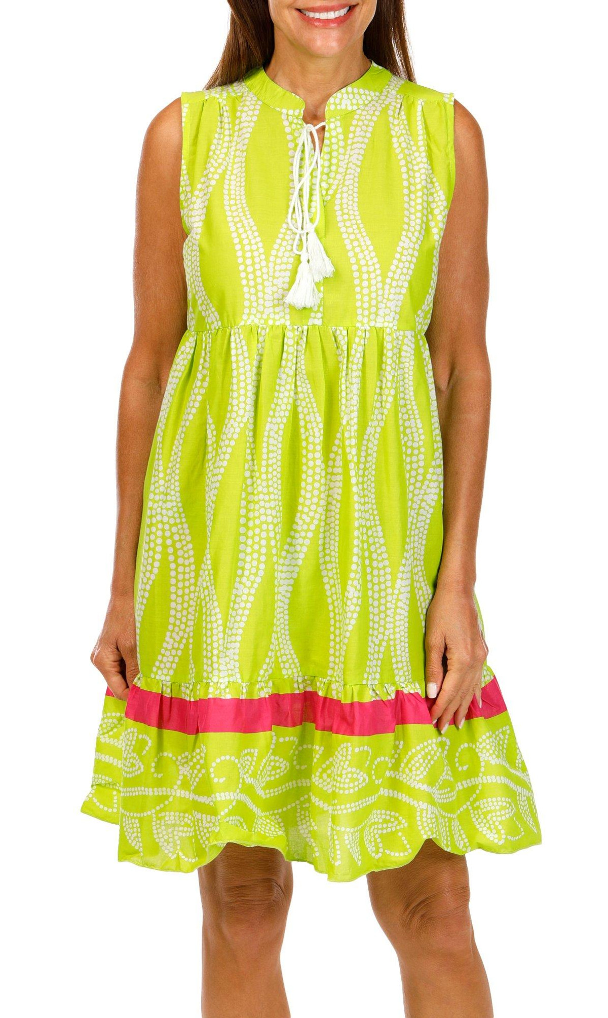 Step into effortless style with this women’s sleeveless tiered print tassel dress. Made from 100% cotton, it offers breathable comfort for warm days. The flowy silhouette and eye-catching print are enhanced by playful tassel accents and a flattering tiered design.
