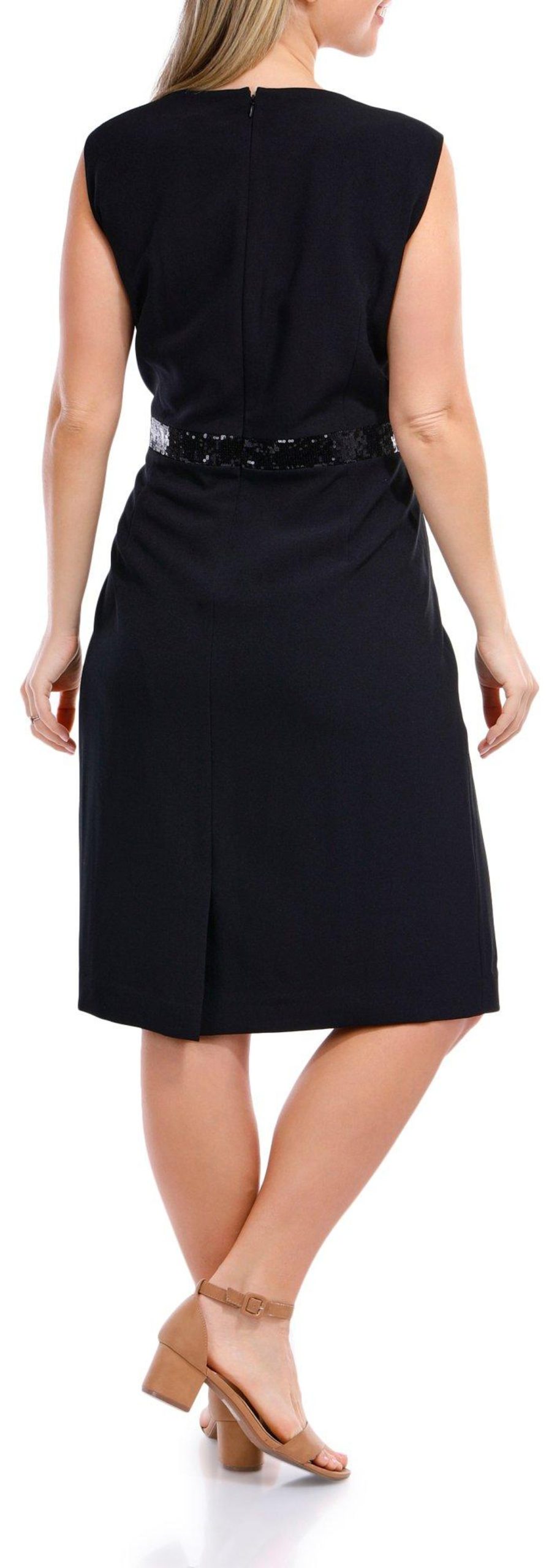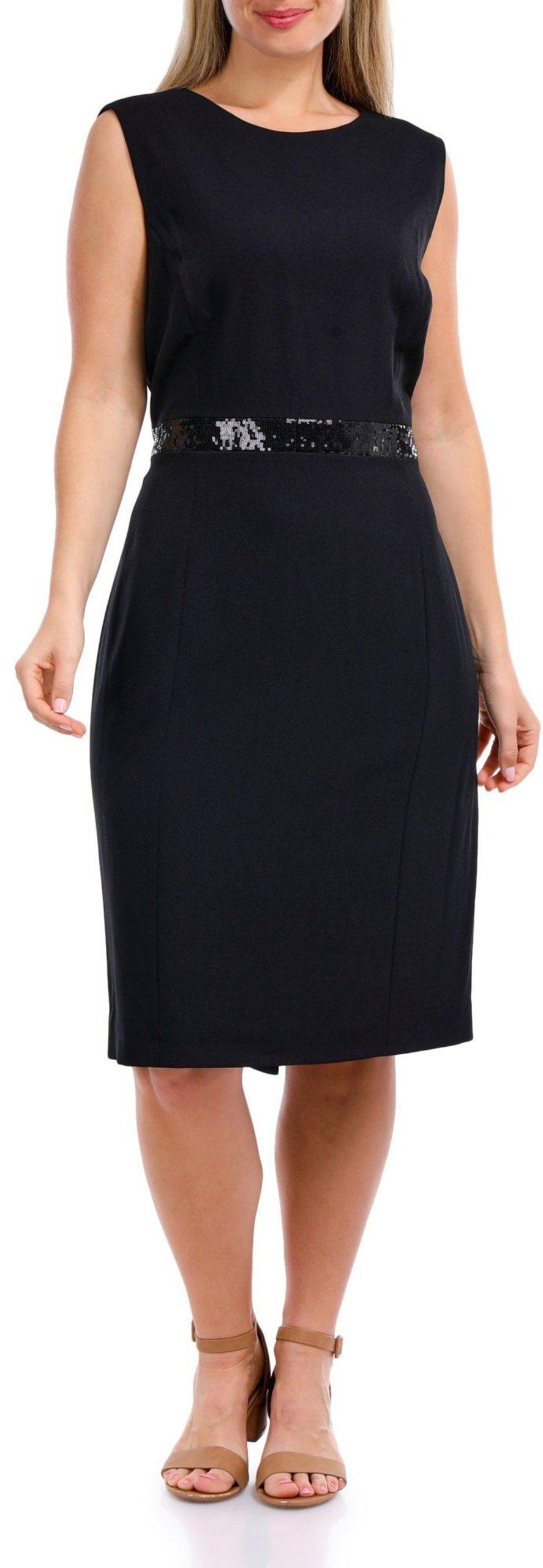 Shine with elegance in this Sleeveless Sheath Dress, featuring dazzling sequin details and a sleek zipped back. The knee-length design offers a sophisticated and flattering silhouette, perfect for both formal and semi-formal occasions. The sequin embellishments add a touch of glamour, ensuring you stand out with grace and confidence. Fabrication is 97% polyester, 3% elastane.