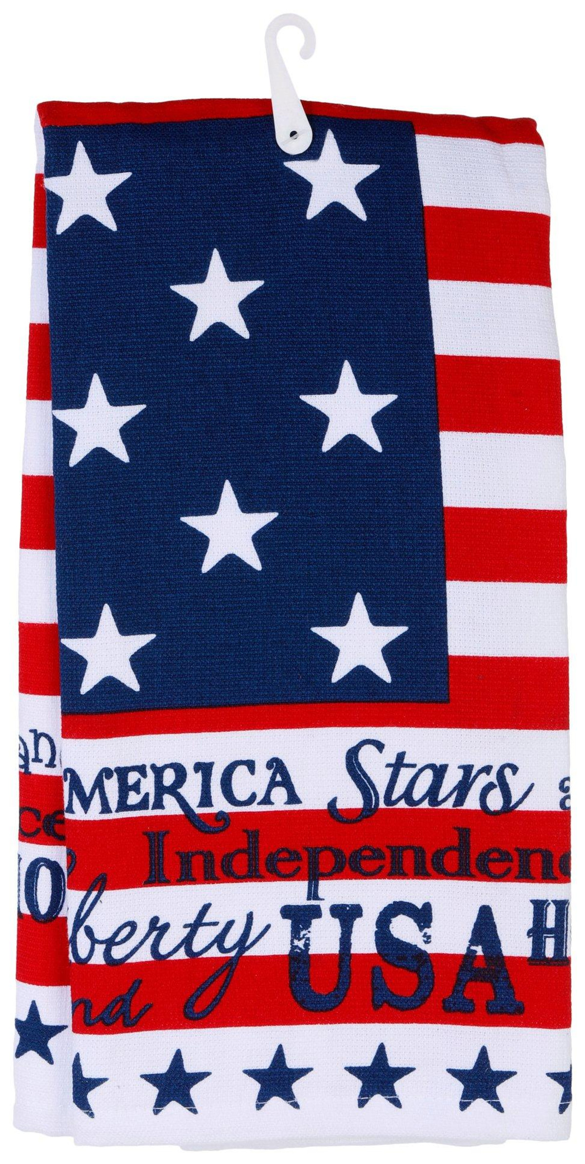 Add patriotic flair to your kitchen with the Americana Flag kitchen towel, featuring a bold stars and stripes design. Dual-purpose construction offers a smooth side for drying glassware and a terry cloth back for tackling everyday messes. Perfect for holiday entertaining or adding year-round Americana charm to your home. Fabrication is 100% cotton. Measures approximately 16 in x 26 in.