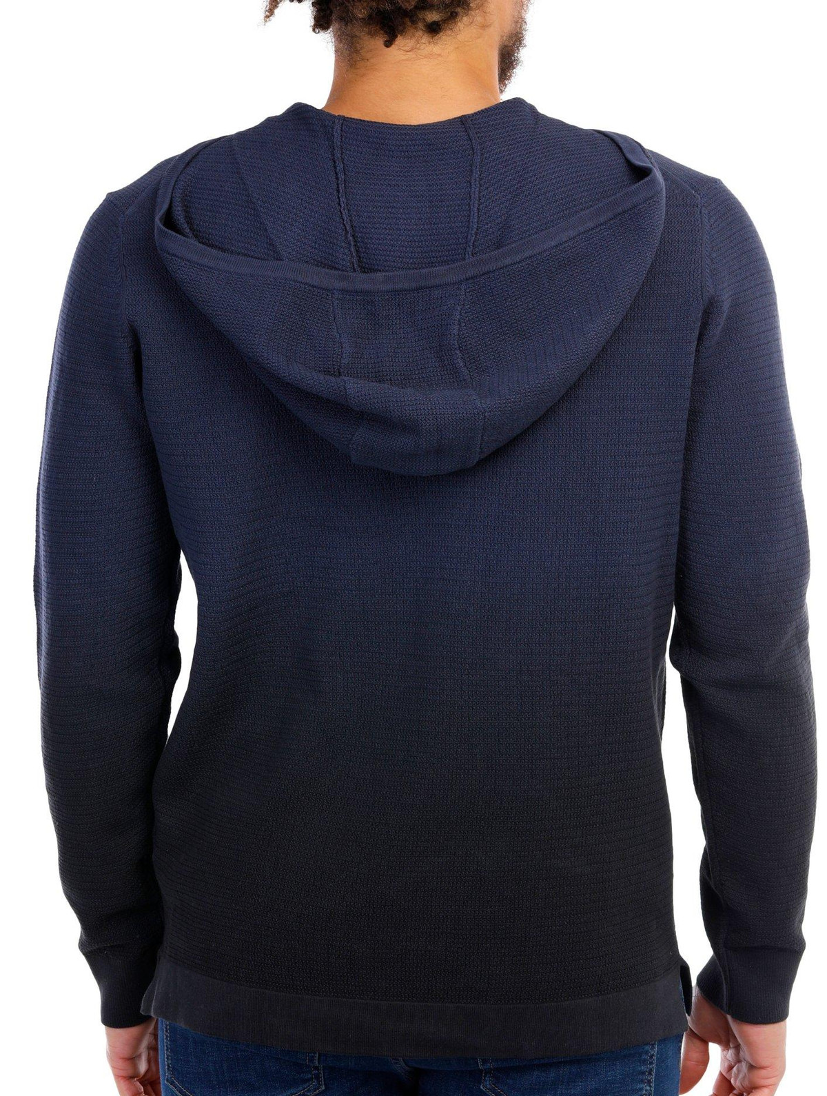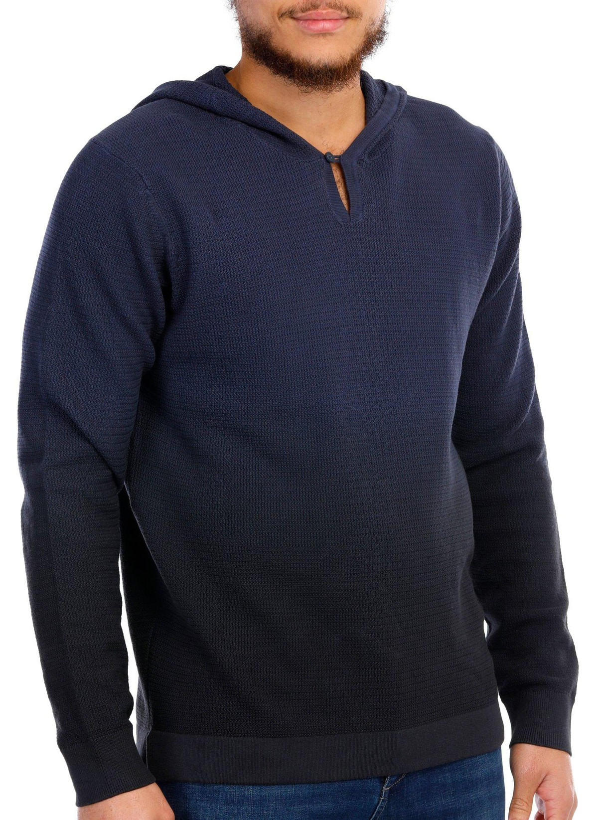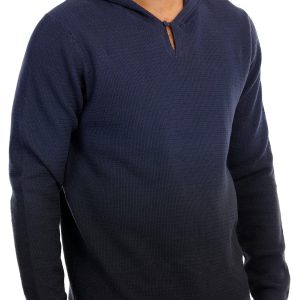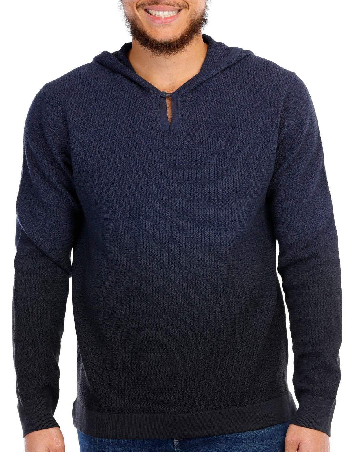 Stay comfortable and warm without sacrificing effortless style thanks to this knit long sleeve hoodie. It features an ombre-style color design, soft cotton knit fabric, and a hooded neckline with single button closure.