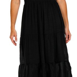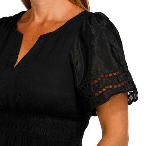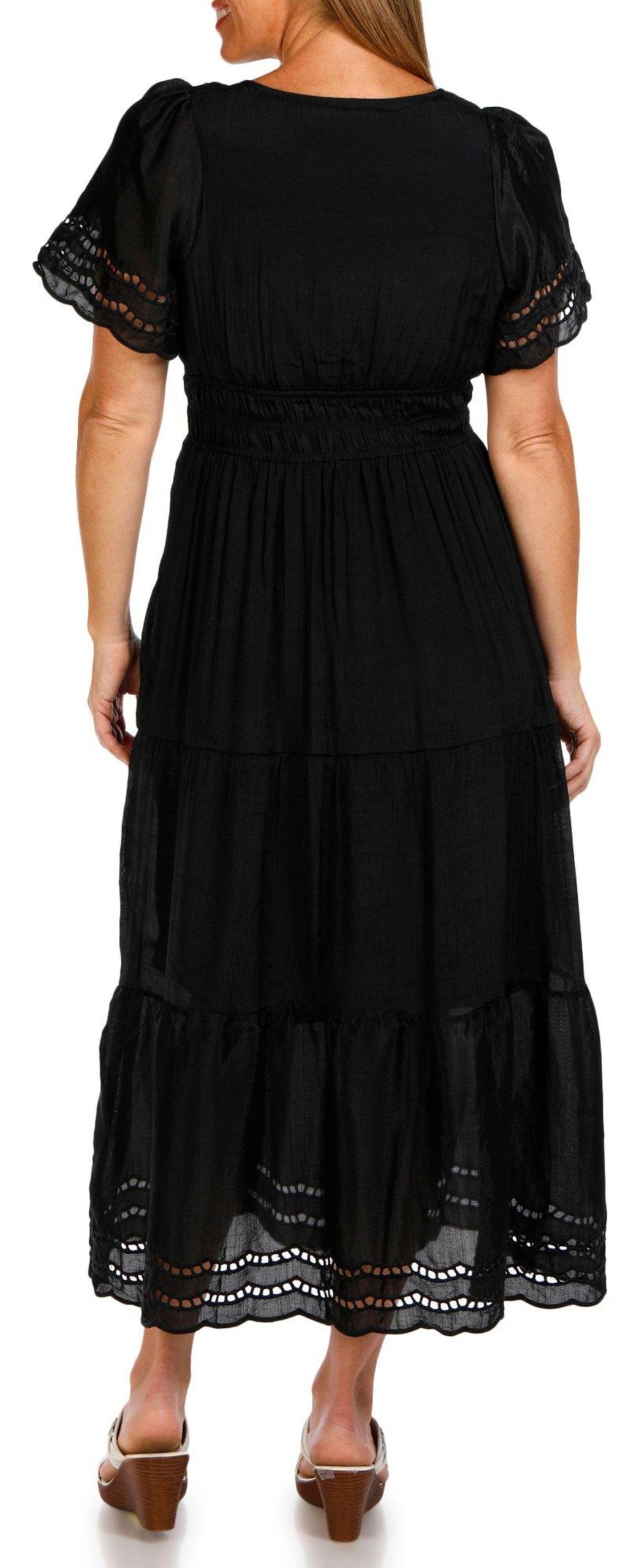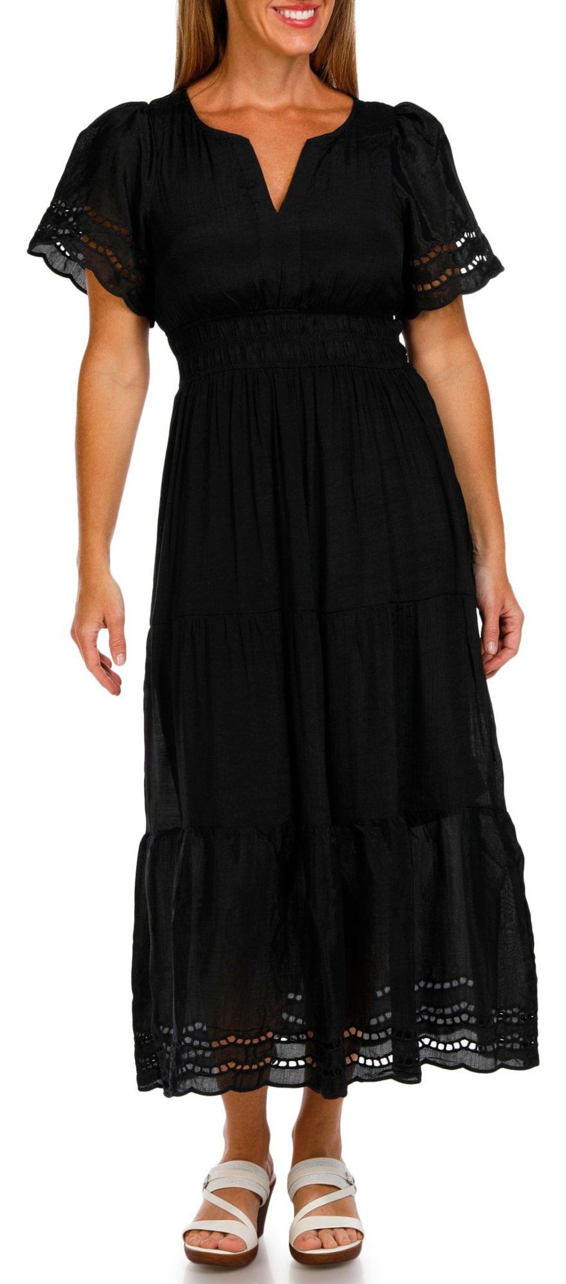 Step into effortless elegance with this Women’s Short Sleeve Tiered Midi Dress. Featuring a solid color, scalloped short sleeves with lace cut-out detailing, a split neckline, and a tiered skirt with matching cut-out accents, its perfect for warm-weather occasions. Fabrication 52% rayon, 48% polyester