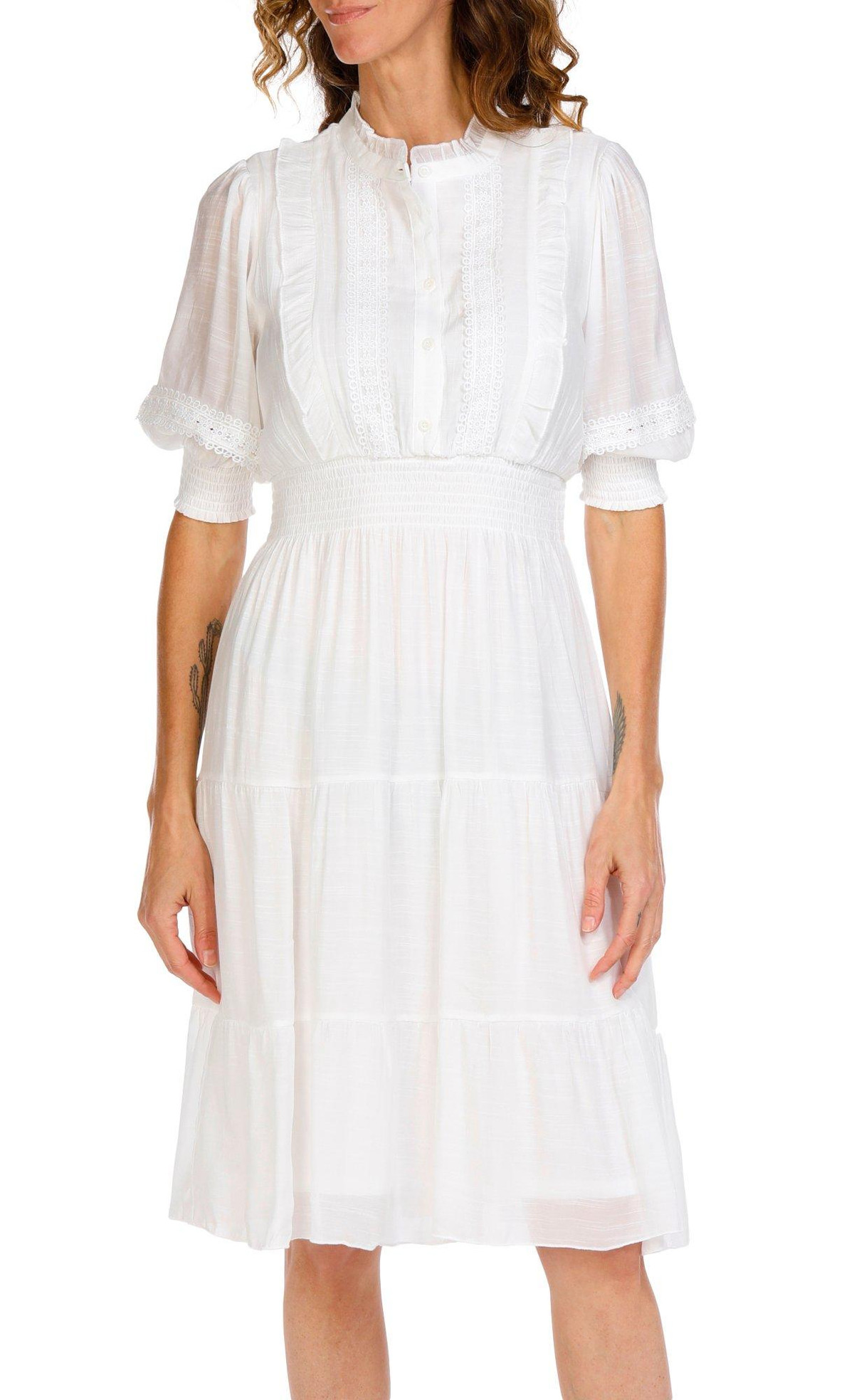 This short sleeve midi dress features a tiered design and delicate lace details for a soft romantic look. Flowy and flattering its perfect for everything from casual days to special occasions.