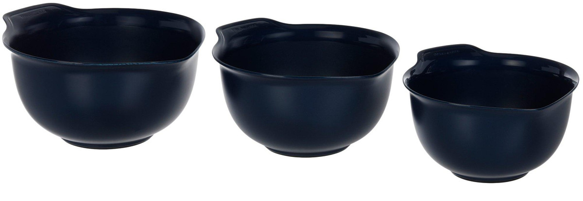 This set of 3 mixing bowls features a convenient spout for easy pouring and a nonslip base for added stability during prep. Dishwasher safe and designed for everyday use, these bowls offer functionality and ease for mixing, pouring, and serving. Includes 2.5 QT bowl, 3.5 QT bowl, and 4.5 QT bowl.