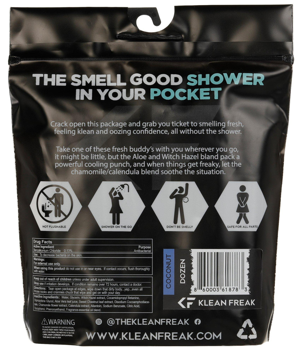Your tropical oasis is waiting! Break open an individually wrapped, pre-moistened body wipe for a mental getaway moment. The biodegradable wipe cleans, deodorizes, and minimizes bacteria to keep your skin healthy, soft, and fresh between showers. Enjoy the benefits of natural botanicals with the cheery, bright scent of fresh coconut. Each wipe contains zero alcohol and is enhanced with Aloe and Witch Hazel and a Chamomile/Calendula blend to give you that soothing effect.