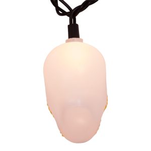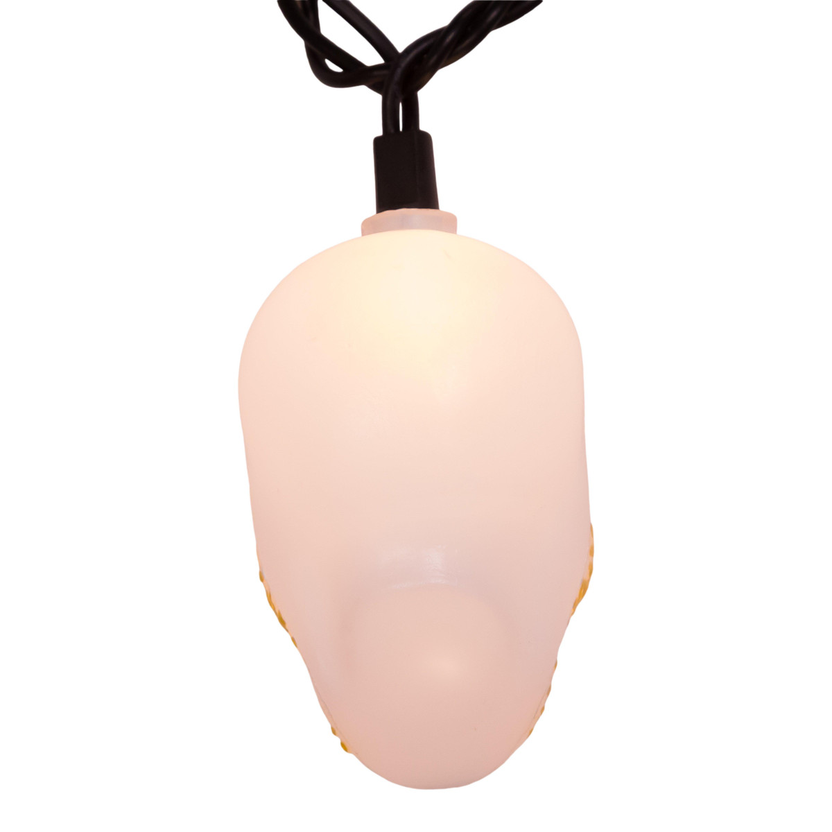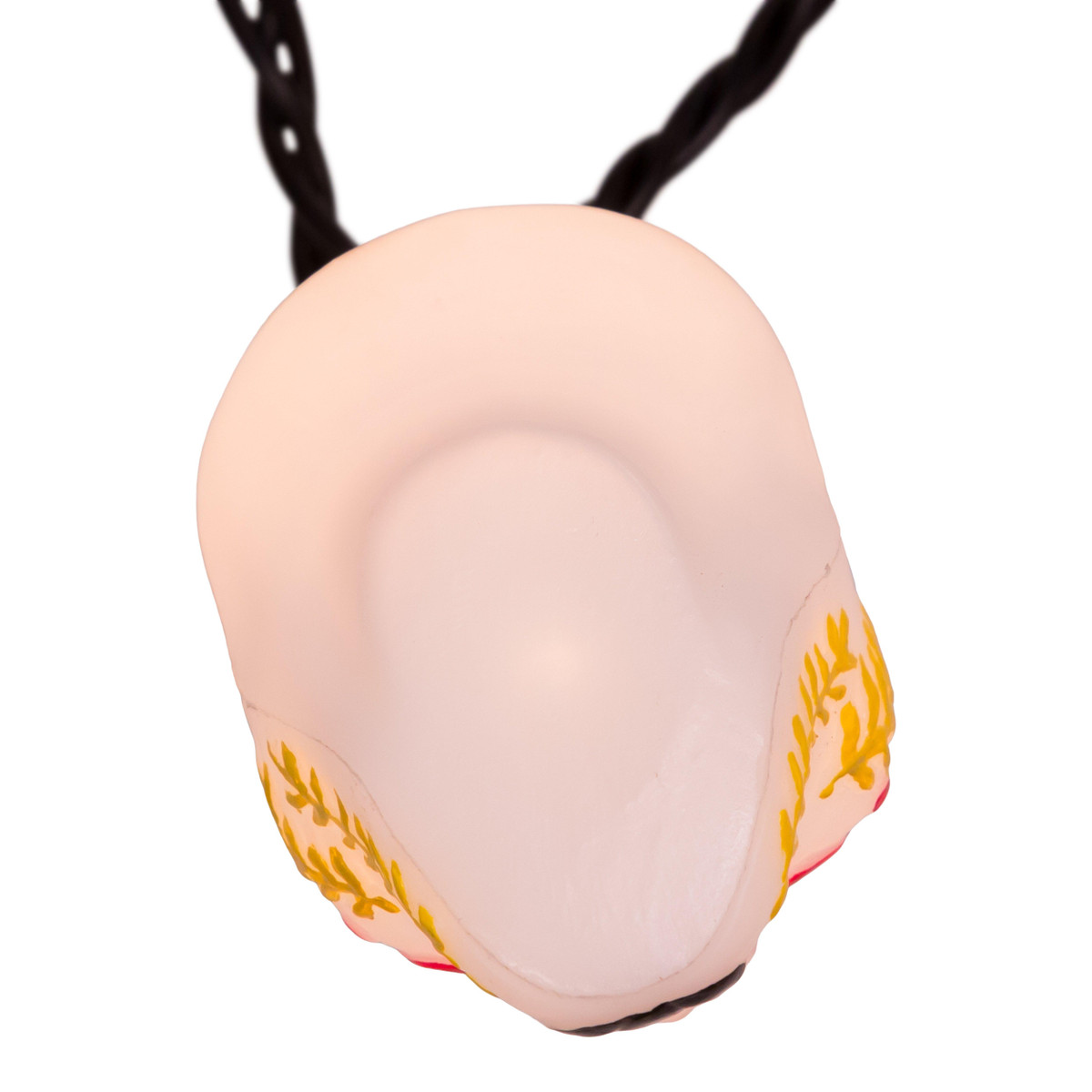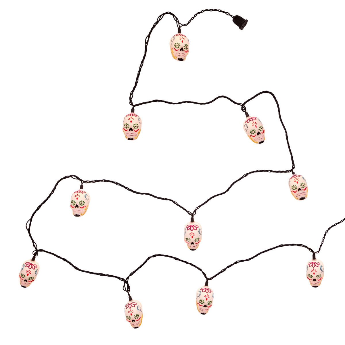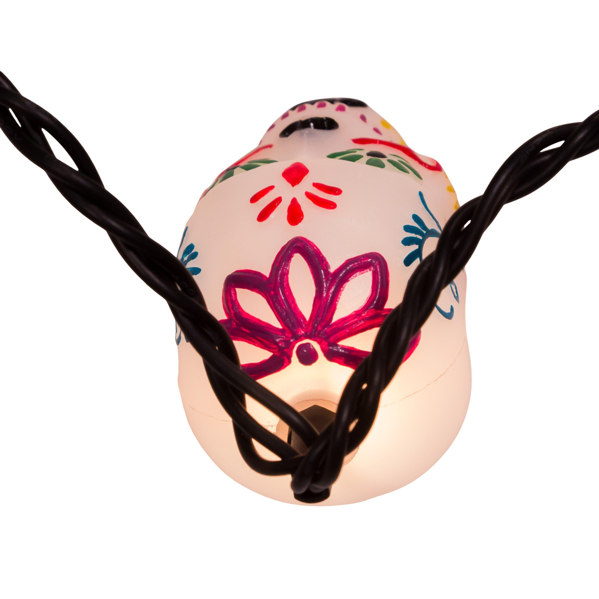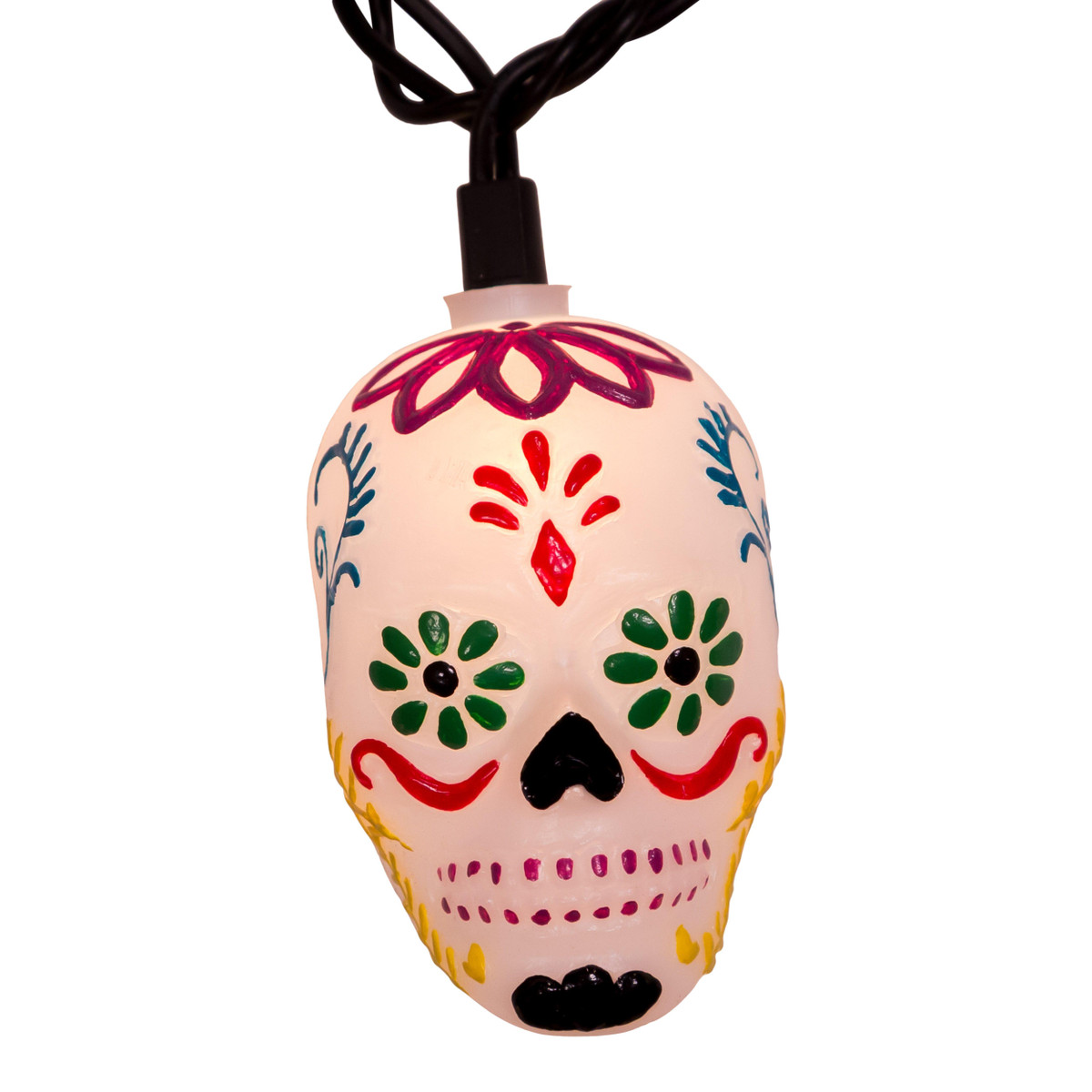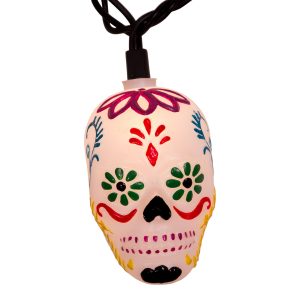 Celebrate the Day of the Dead in style with this UL 10-Light Day Of The Dead Skull Light Set from Kurt Adler. The set features 10 skull-shaped lights, each a white skull with multicolored traditional Day Of The Dead patterns and glittered accents.This light set includes an end connector, 30 black lead wire, clear bulbs, 12 bulb spacing, 6 tail and can be used both indoor and outdoor.