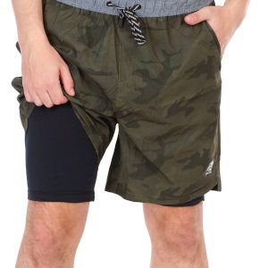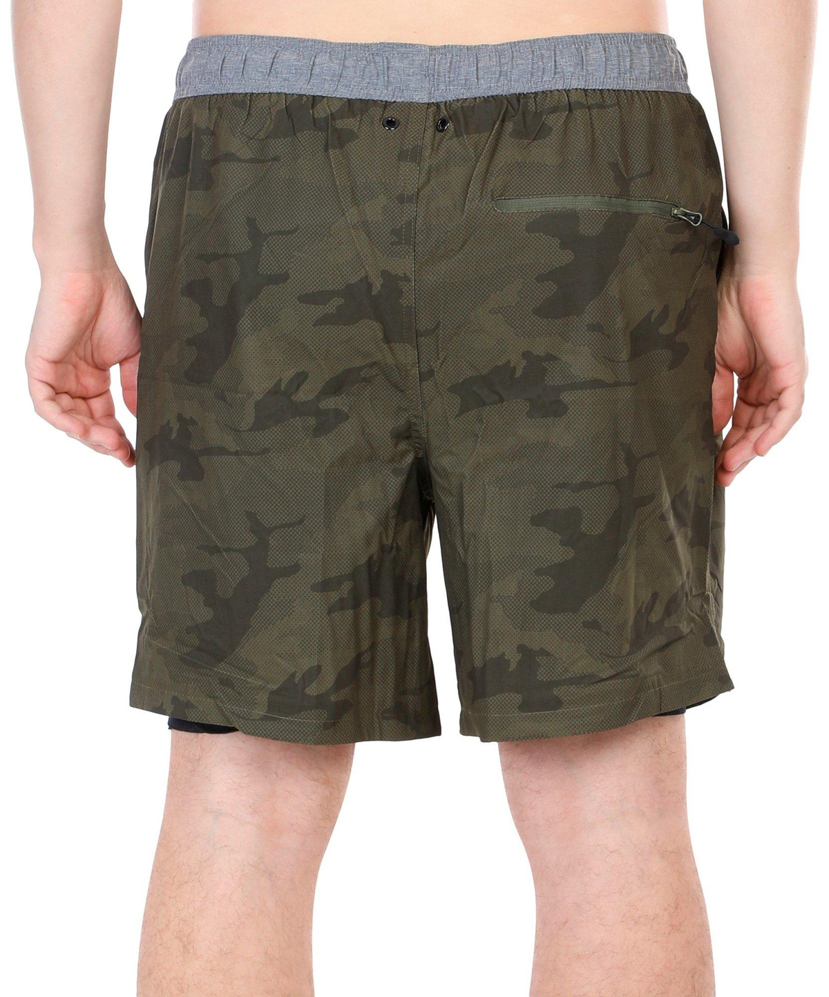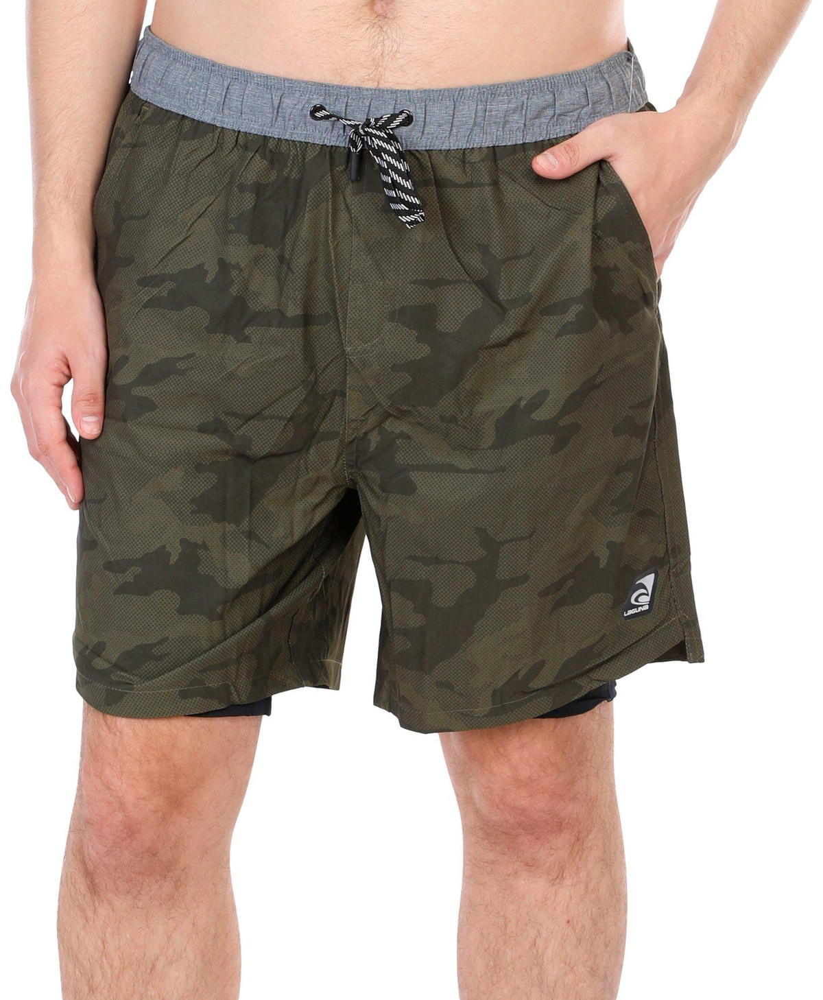 These swim shorts from Laguna feature a camo print design on lightweight durable stretch woven fabric, an elastic waistband with an outer drawstring, two side seam pockets, back zippered security pocket with hook and loop string, back grommet detail, a built-in mesh short, and a regular fit. The inseam measures approximately 7 in. Outseam measures approximately 20 inches from hip to hemline. Fabrication shell: 90% polyester, 10% spandex, and the lining: 88% polyester, 12% spandex.