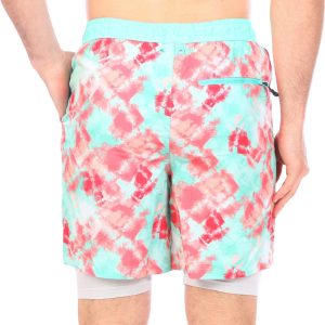 These swim shorts from Laguna feature a tie dye print design on lightweight durable stretch woven fabric, an elastic waistband with an outer drawstring, two side seam deep pockets, back zippered security pocket with hook and loop string, back grommet detail, a built-in mesh short, and a regular fit. The inseam measures approximately 7 in. Outseam measures approximately 18.5 inches from hip to hemline. Fabrication shell: 90% polyester, 10% spandex, and the lining: 92% polyester, 8% spandex.