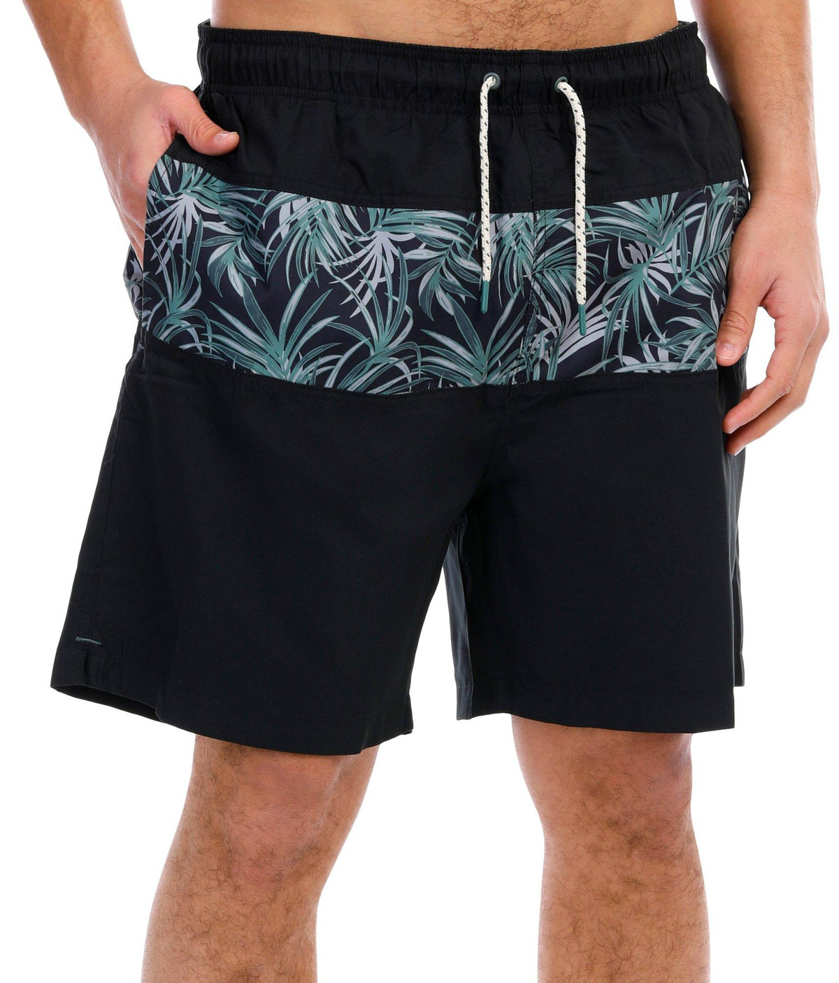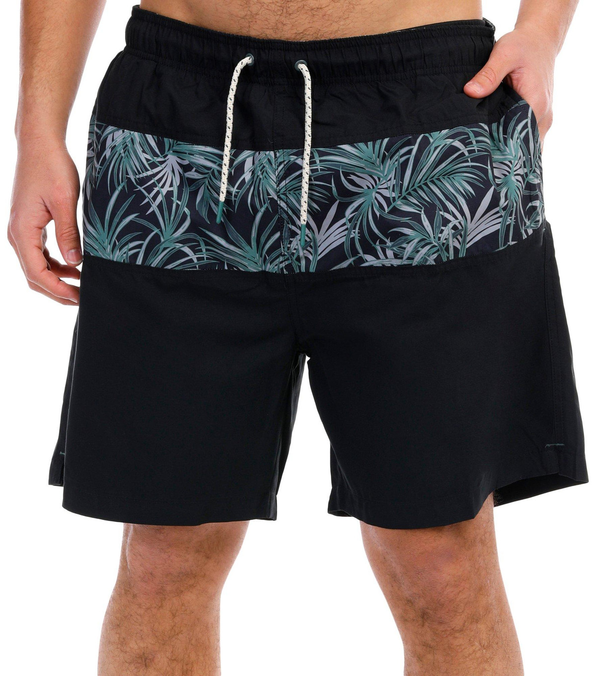 Get ready for summer with our Blocked Palm Swim Trunks, featuring a vibrant palm print pattern that brings tropical vibes to your swimwear collection. These trunks are designed with a drawstring waist for a secure and adjustable fit, a comfortable mesh liner, and double side pockets along with a single back pocket for convenient storage. Perfect for beach days and poolside lounging, these swim trunks combine style and functionality for all your summer adventures.