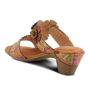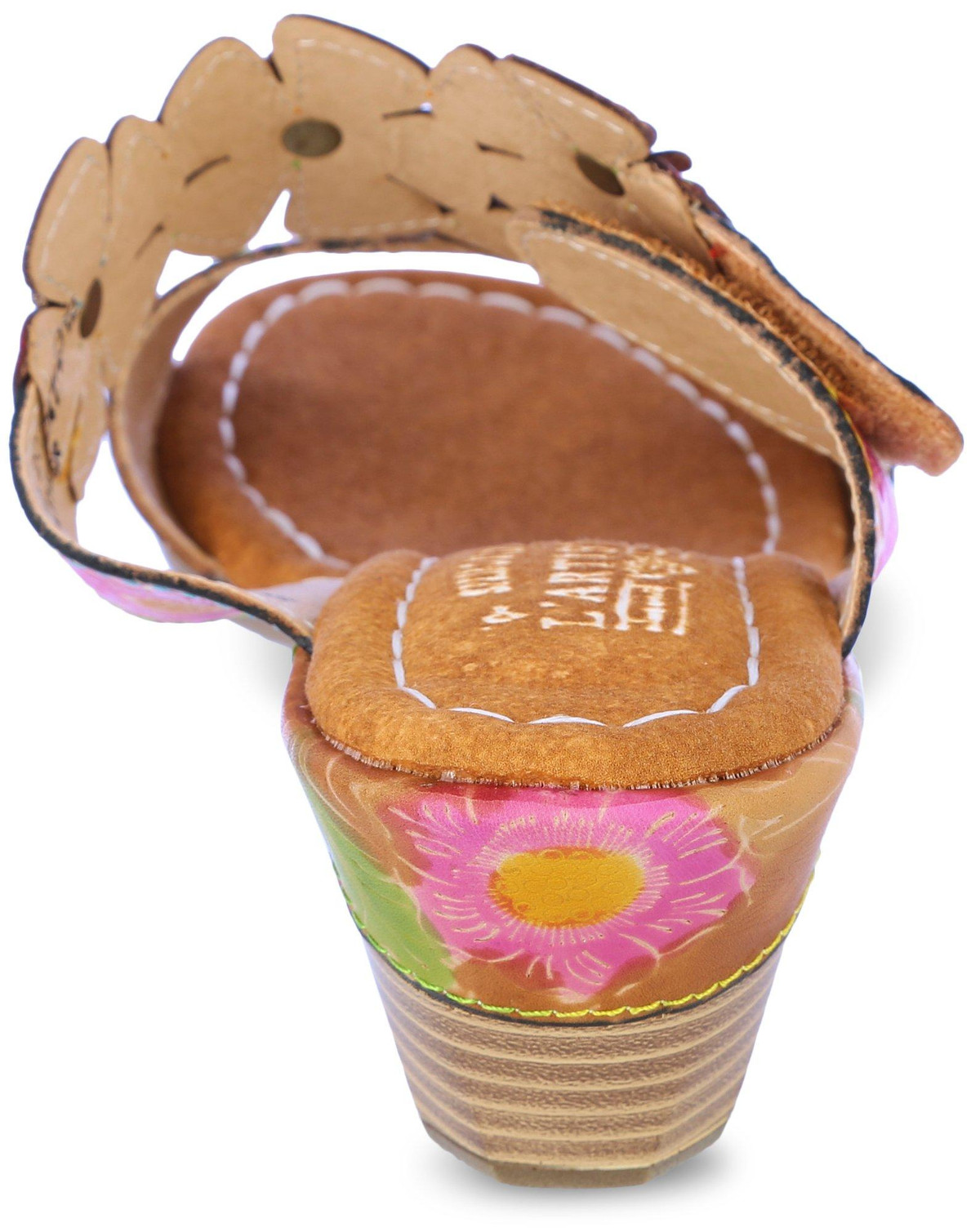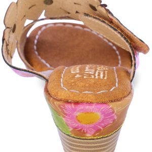These unique, hand-painted sandals feature a leather wrap around the heel and a vibrant, multi-colored asymmetrical flower pattern on the upper.