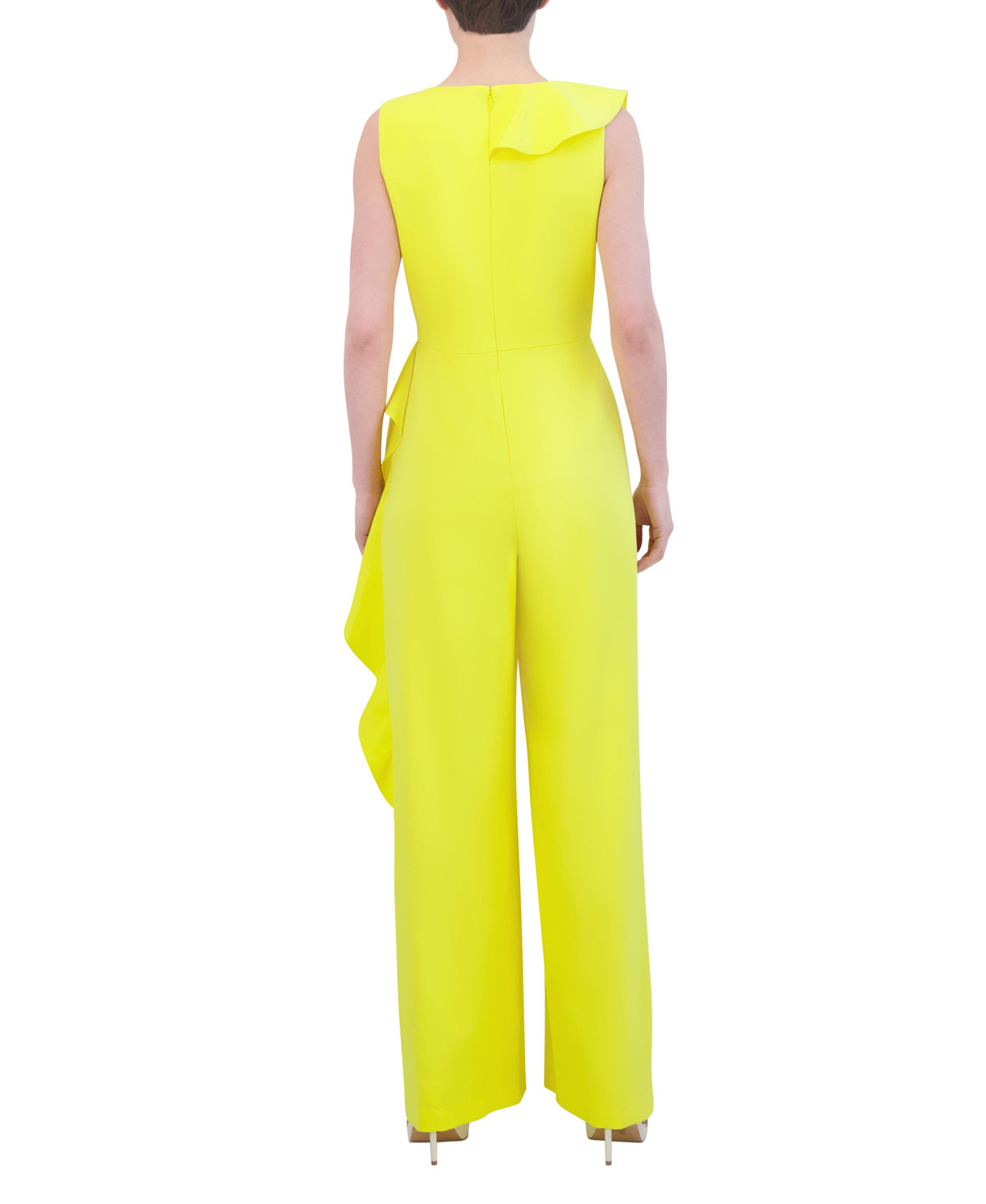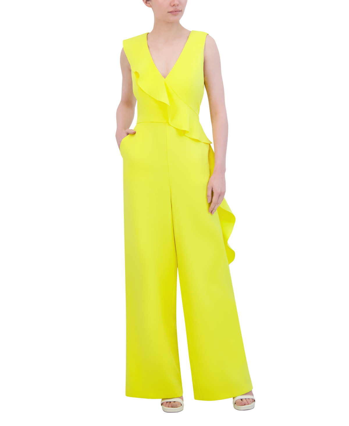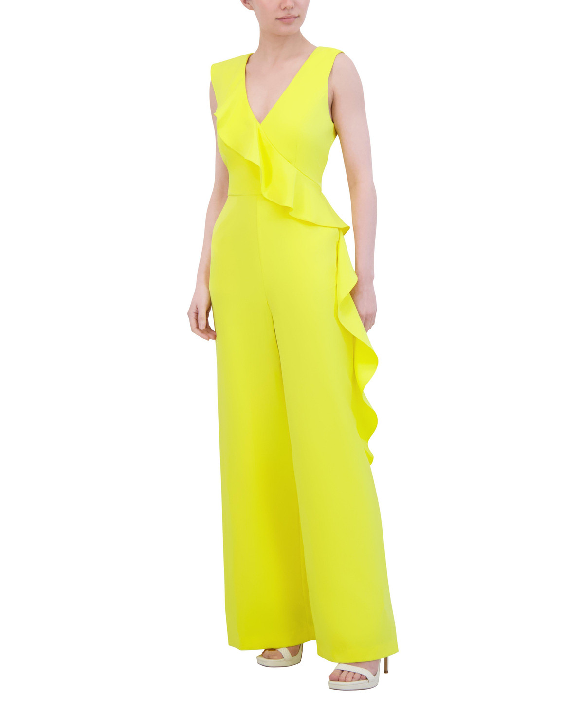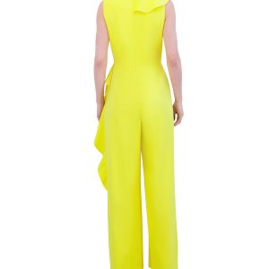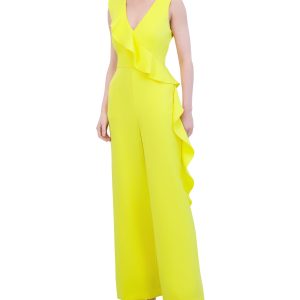 Step into style with this Laundry by Shelli Segal jumpsuit! Featuring chic crepe fabric, a flattering V-neckline, and standout side ruffles, its your go-to for weddings, work, or wherever you want to wow. Just add heels and let the compliments roll in! Jumpsuit length approximately 61 in.